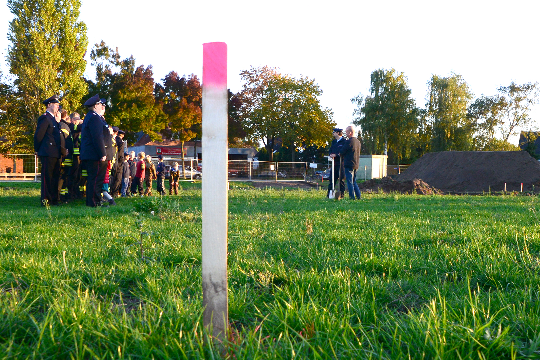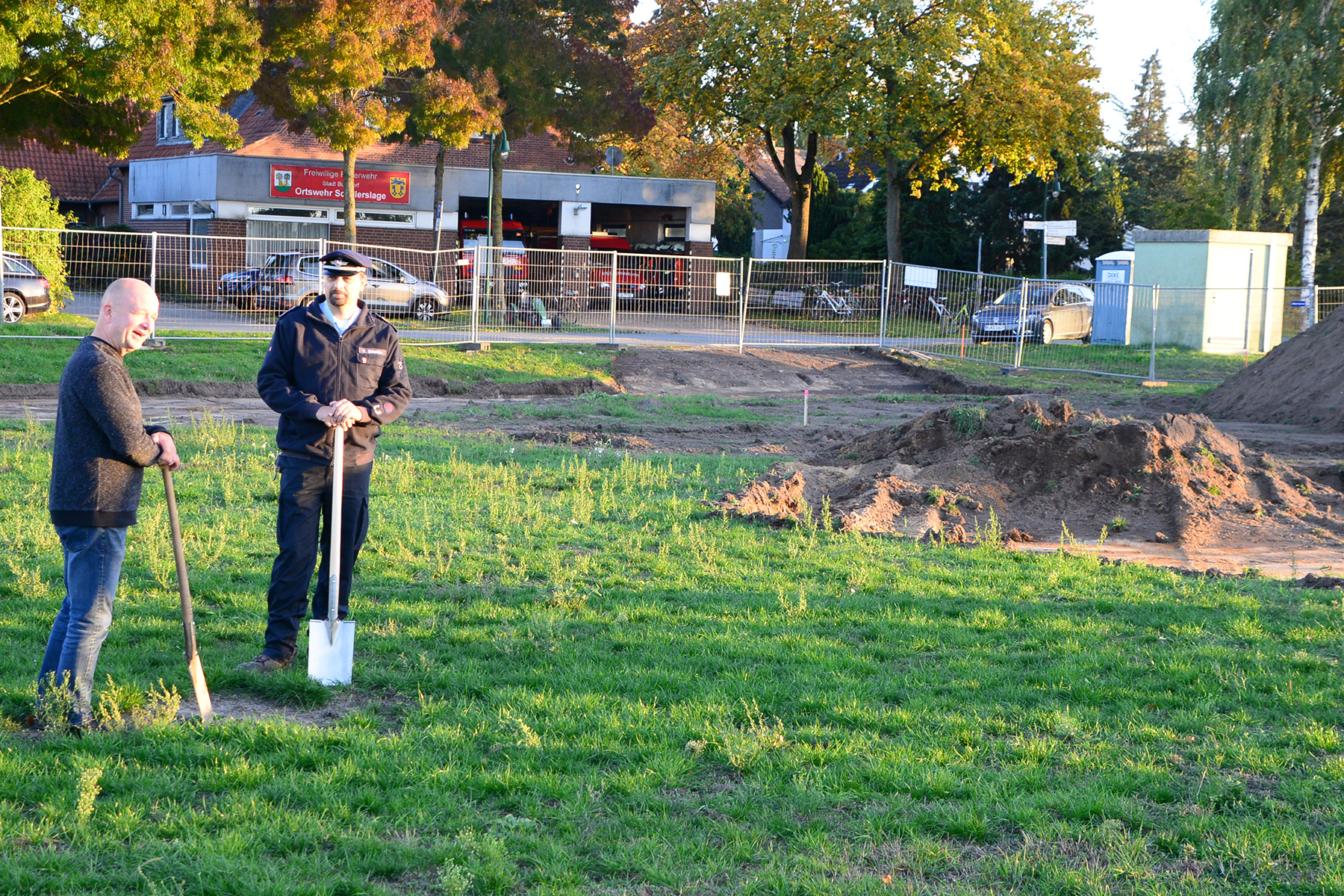 Da die Baustelle schon eingerichtet worden war, blieb es beim inoffiziellen Spatenstich, vorrangig durch Ortsfeuerwehr und Ortsrat initiiert. Doch auch wenn es keinen offiziellen Rahmen gab, applaudierten die rund 50 Anwesenden zur ersten Schippe auf dem neuen Gelände.