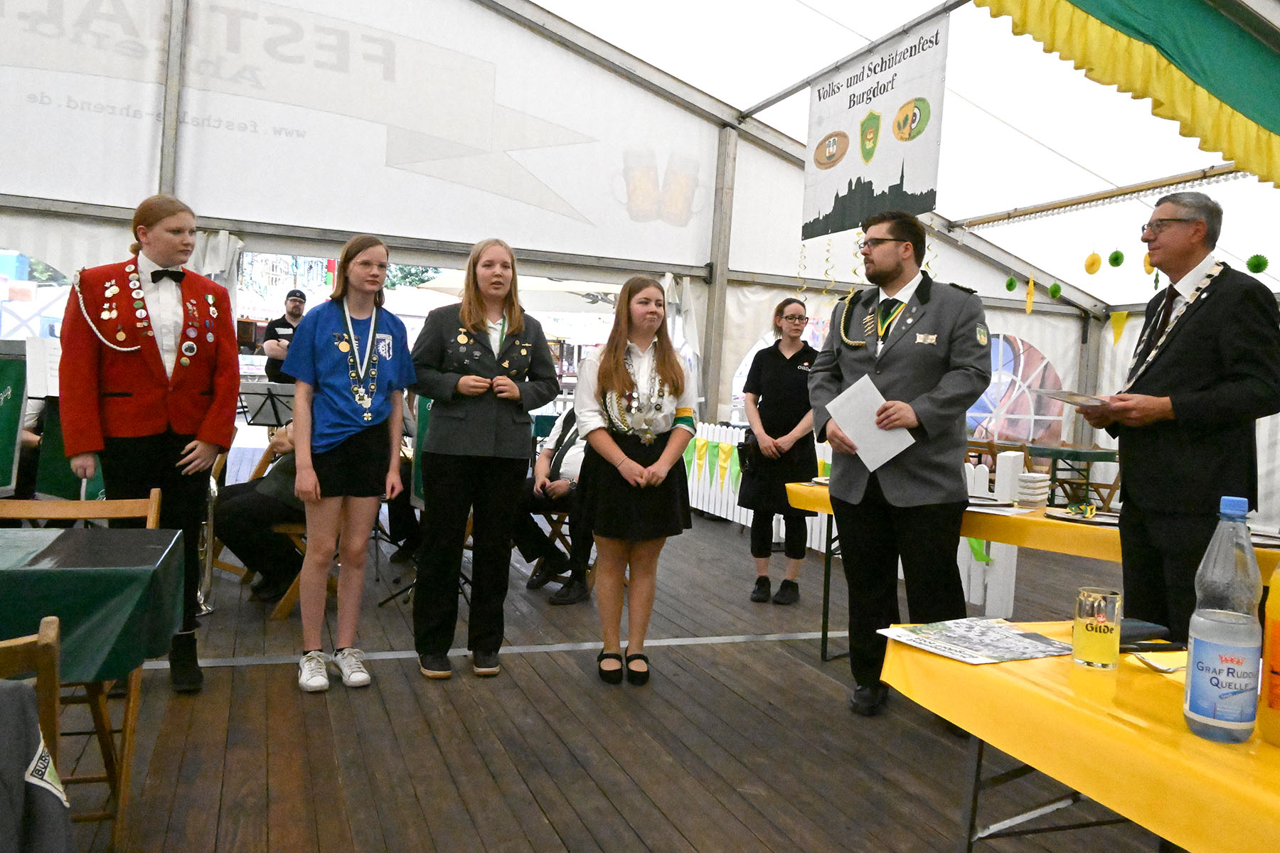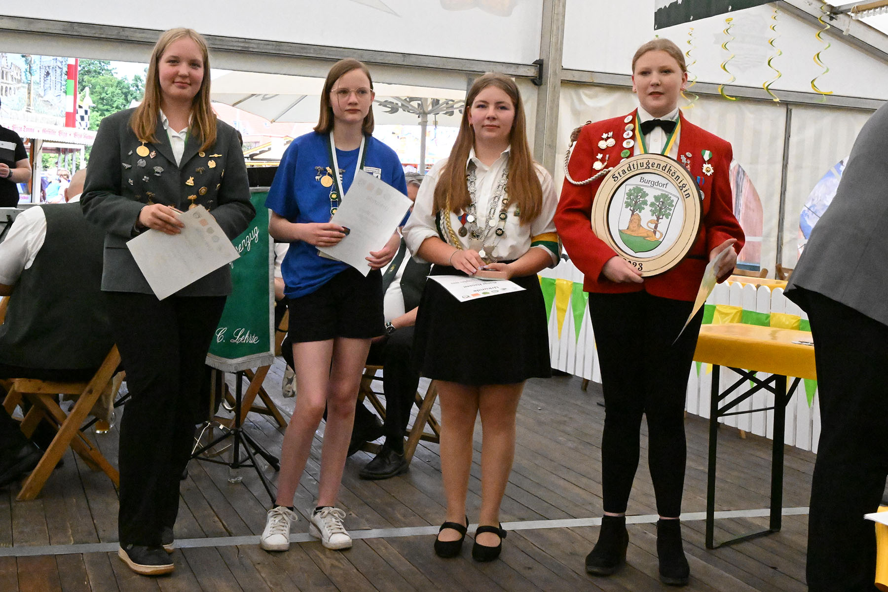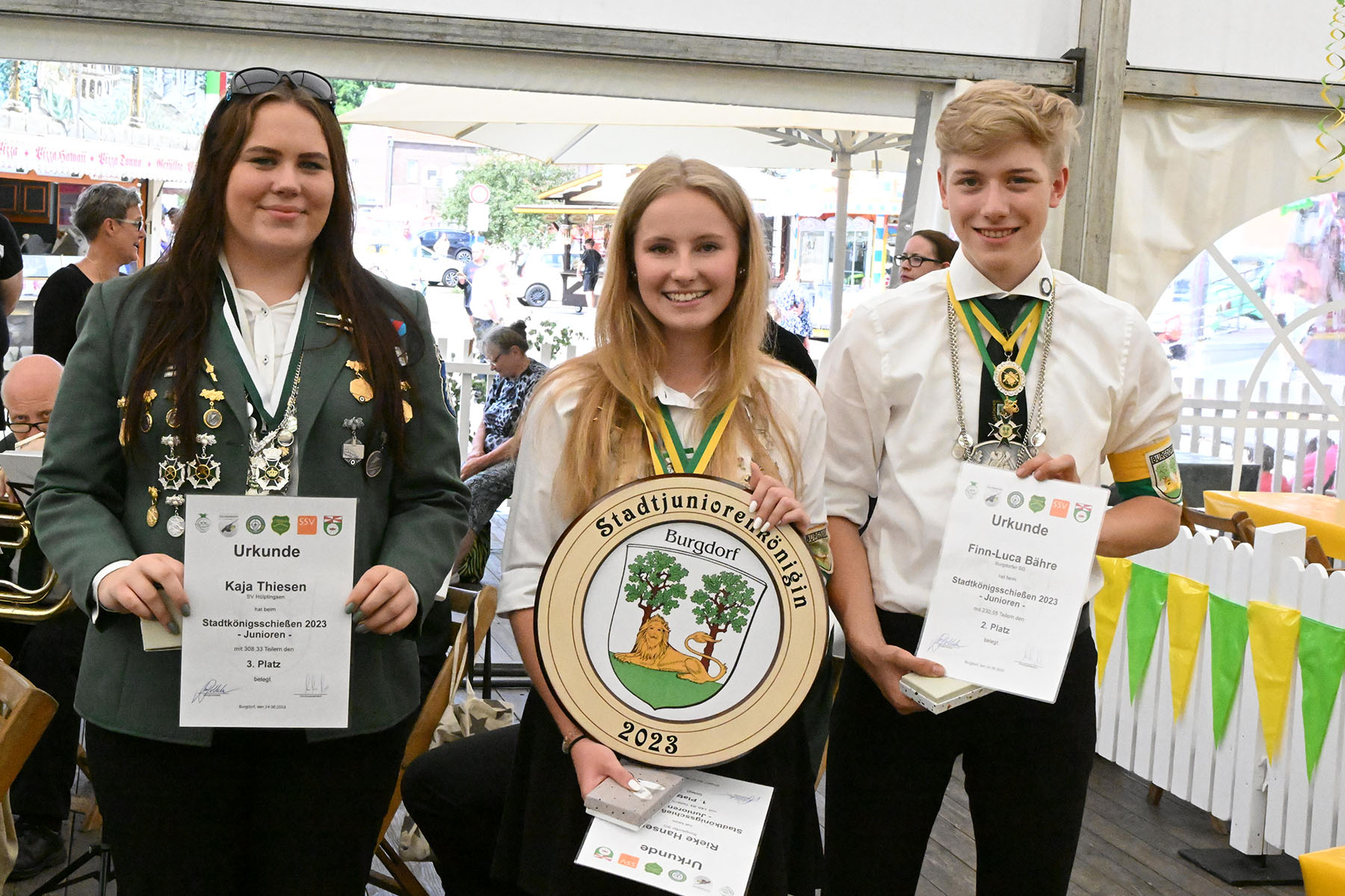 Stadtjuniorenkönigin ist Rieke Hansen von der Burgdorfer Schützengesellschaft mit einem 146,96 Gesamtteiler vor Finn-Luca Bähre (Burgdorfer Schützengesellschaft, 230,55) und Kaja Thiesen (SV Hülptingsen, 308,33).