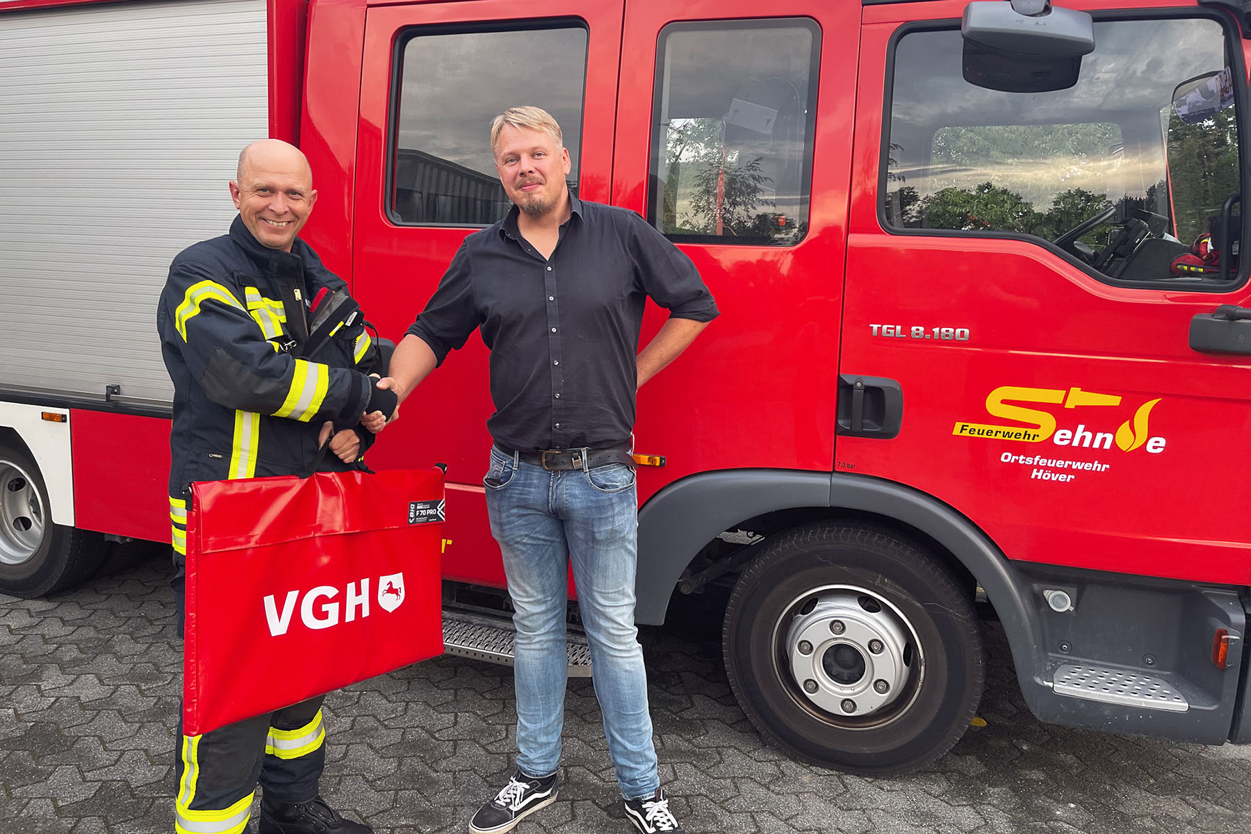 Am Donnerstag, 21. September 2023, übergab Thies Bröckers, Kundenberater der VGH-Versicherungen, an Ortsbrandmeister Markus Meyer einen mobilen Rauchverschluss. Meyer bedankte sich bei Bröckers für den Rauchverschluss und konnte diesen am gleichen Abend beim wöchentlichen Übungsdienst den Mitgliedern der Ortsfeuerwehr vorstellen.