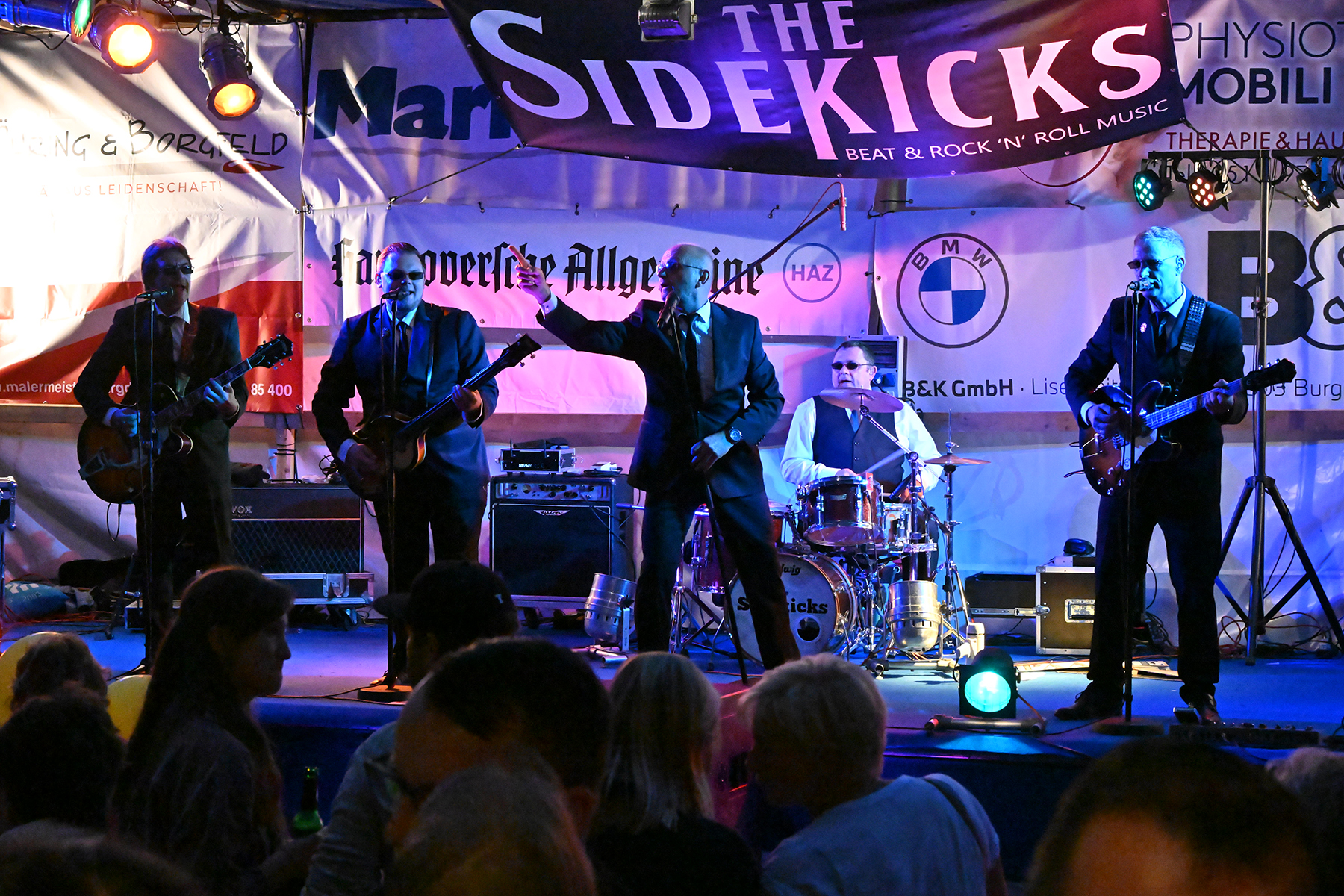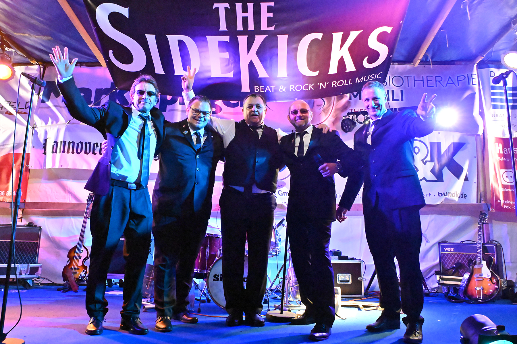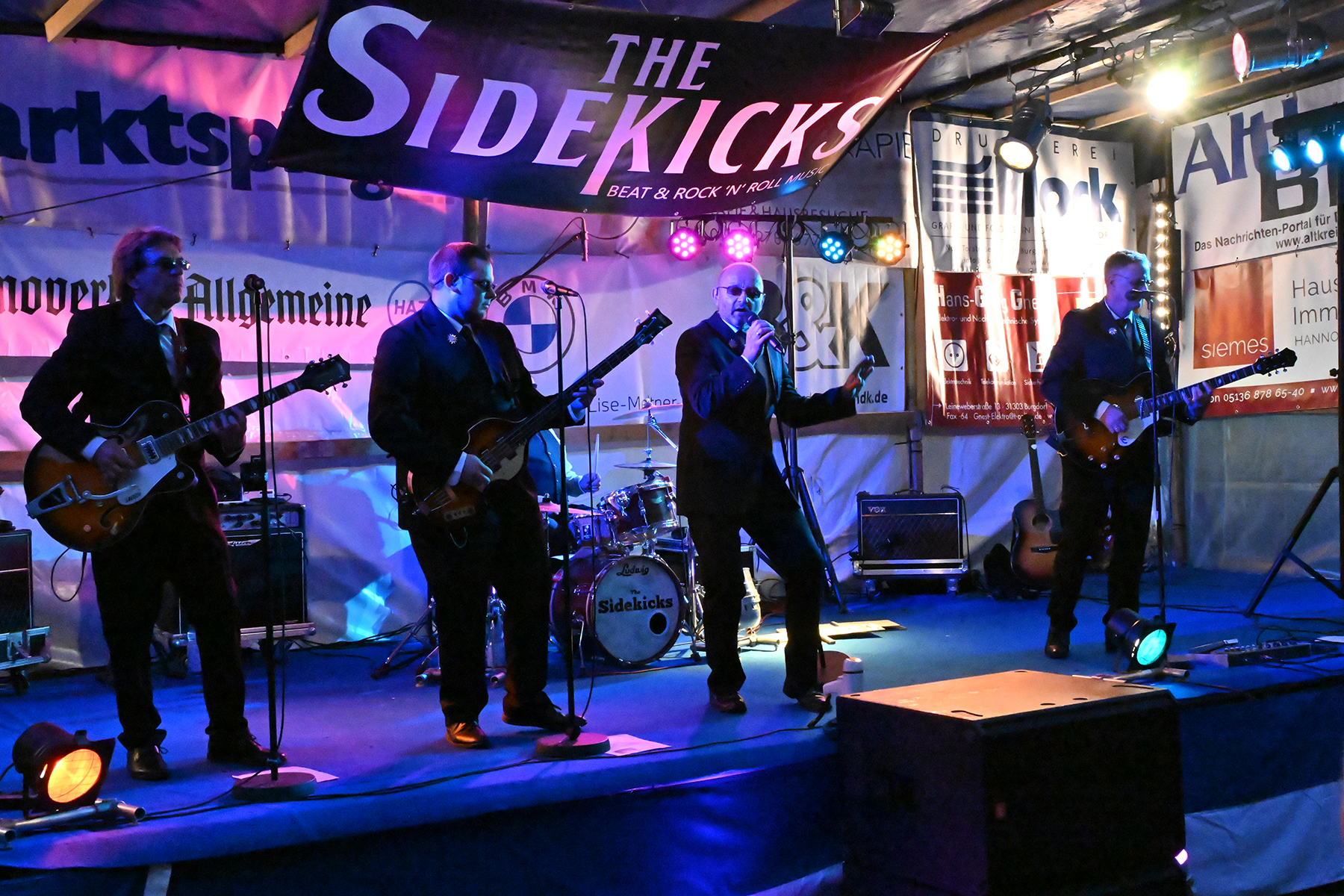 Den Auftakt machte um 17:30 Uhr die Band Gooseflesh auf der Bühne an der Post. Um 19 Uhr startete dann die Band Sidekicks, die auf der Bühne der Junggesellen hinter der Stadtsparkasse auftraten. Spoiler vorweg: Ihr Set war das längste. Während auf den anderen Bühnen die Live-Musik mit Zugaben beendet waren, hörten die Sidekicks Punkt 23 Uhr auf, wie es die Vorgaben verlangten. Eine weitere Zugabe war mit Fingerzeig auf die Uhr nicht mehr möglich.