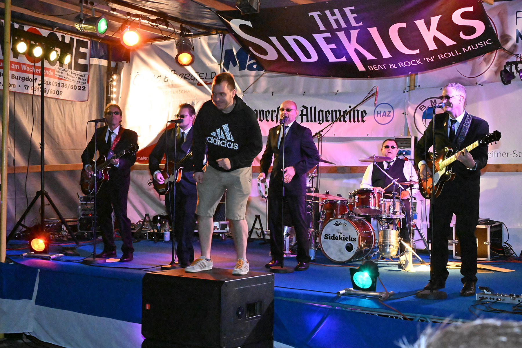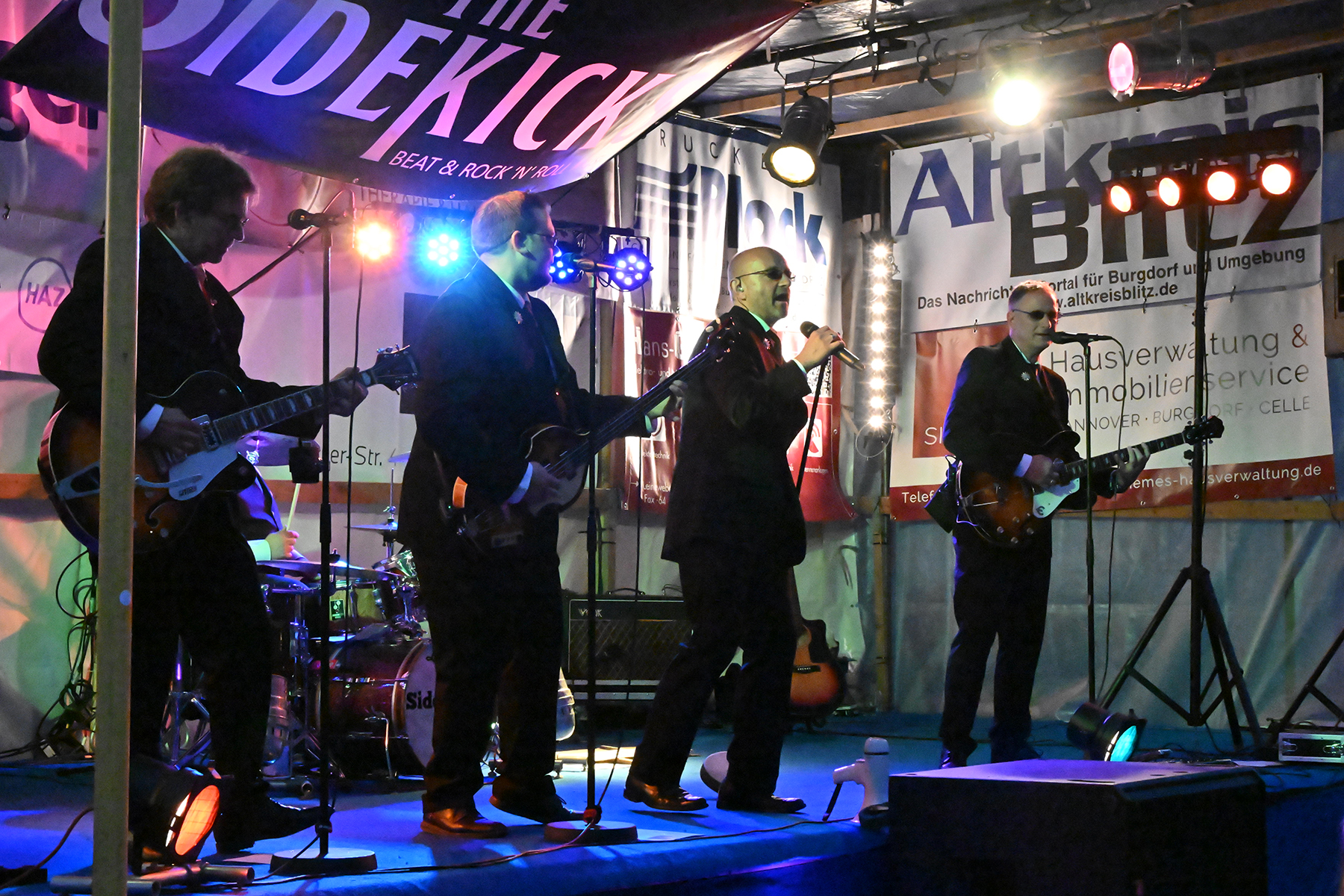 Den Auftakt machte um 17:30 Uhr die Band Gooseflesh auf der Bühne an der Post. Um 19 Uhr startete dann die Band Sidekicks, die auf der Bühne der Junggesellen hinter der Stadtsparkasse auftraten. Spoiler vorweg: Ihr Set war das längste. Während auf den anderen Bühnen die Live-Musik mit Zugaben beendet waren, hörten die Sidekicks Punkt 23 Uhr auf, wie es die Vorgaben verlangten. Eine weitere Zugabe war mit Fingerzeig auf die Uhr nicht mehr möglich.