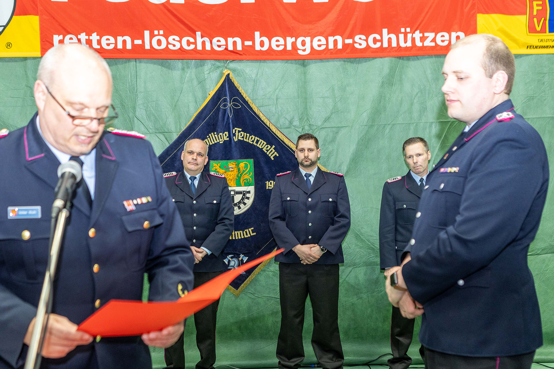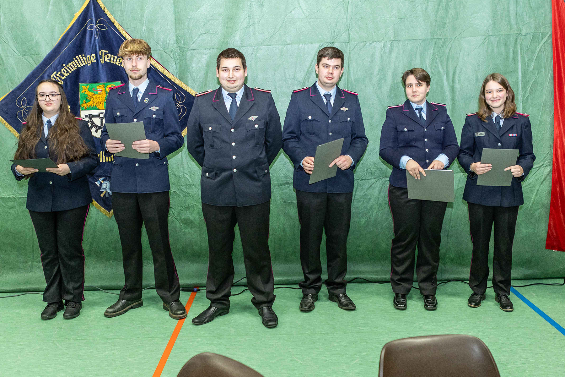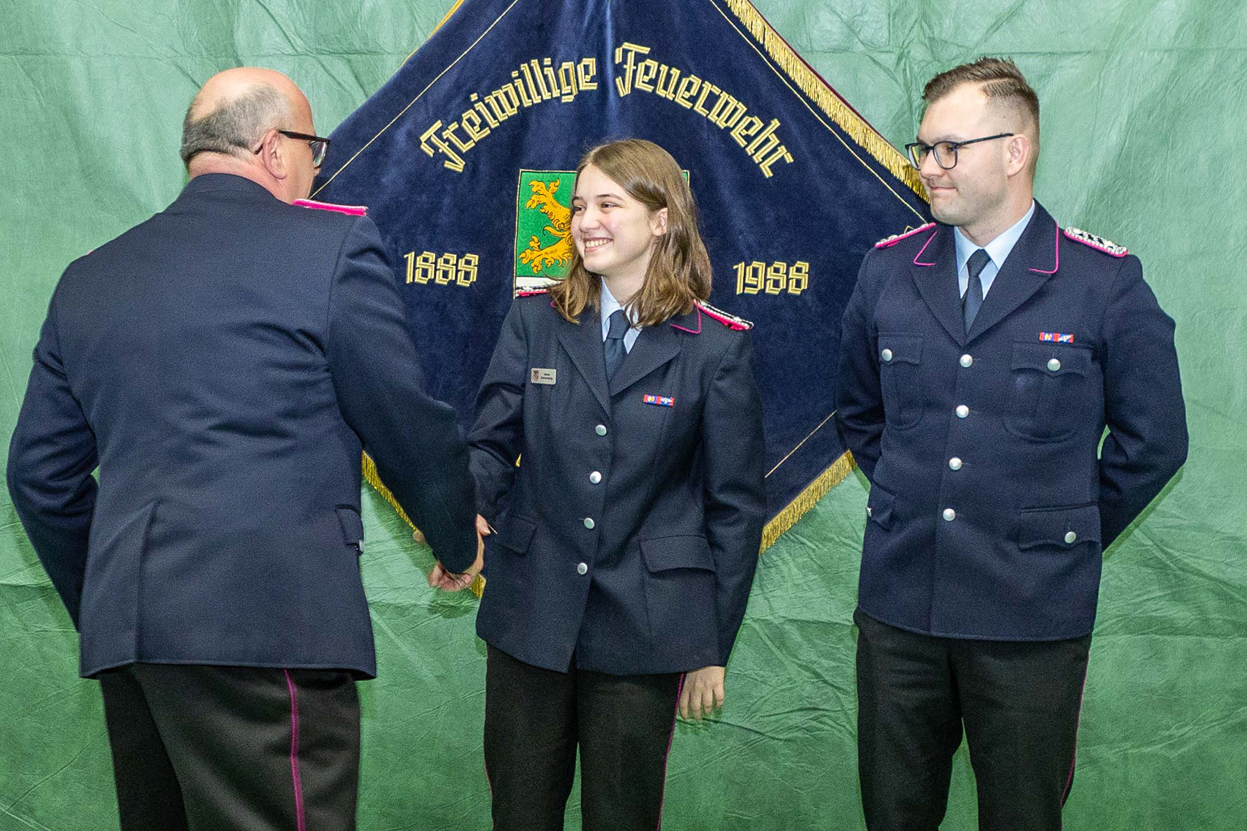 Zudem konnten der Ortsbrandmeister neue Dienstgrade verleihen. Svenja Helland wurde zur Feuerwehrfrau, Nils-Torben Schrader zum Feuerwehrmann, Jackline Jablonski zu Oberfeuerwehrfrau, Timo Oswald und Sven Wimmer zum Oberfeuerwehrmann, Nicholas Krohn und Simon Stolzenborg zum Hauptfeuerwehrmann Alexia Sonnenberg zur Hauptfeuerwehrfrau sowie Klaus Flober zum Ersten Hauptfeuerwehrmann ernannt. Durch den Stadtbrandmeister wurden die beiden stellvertretenden Gruppenführer Steven Kallina und Jan Rathmann zum Oberlöschmeister ernannt.
