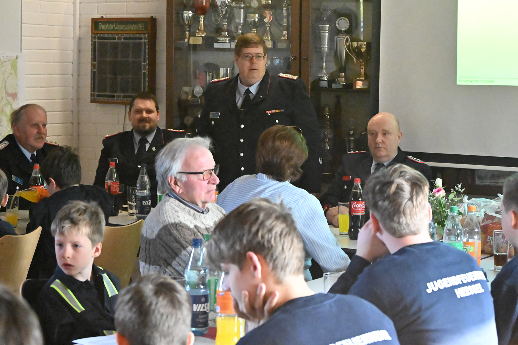 "Alle, die hier in blauer Uniform sitzen, haben einmal in der Jugendfeuerwehr angefangen", wusste Jugendfeuerwehren-Ehrenmitglied Peter Nicks zu berichten, und gab dem Feuerwehrnachwuchs auf den Weg, dabei zu bleiben. Auch wenn in Kinderjahren noch der Spaß im Vordergrund stehe, so dienen die beiden Nachwuchsabteilungen der Ortsfeuerwehr Heeßel insbesondere der Sicherstellung an neuen Einsatzkräften. "Wenn das so bleibt, werden wir keine Probleme mit dem Nachwuchs haben", so der ehemalige Stadtbrandmeister. Aus der im vergangenen Jahr 15 Jahre alt gewordenen Kinderabteilung sind einige ehemalige Kinder bereits in die Einsatzabteilung gekommen.