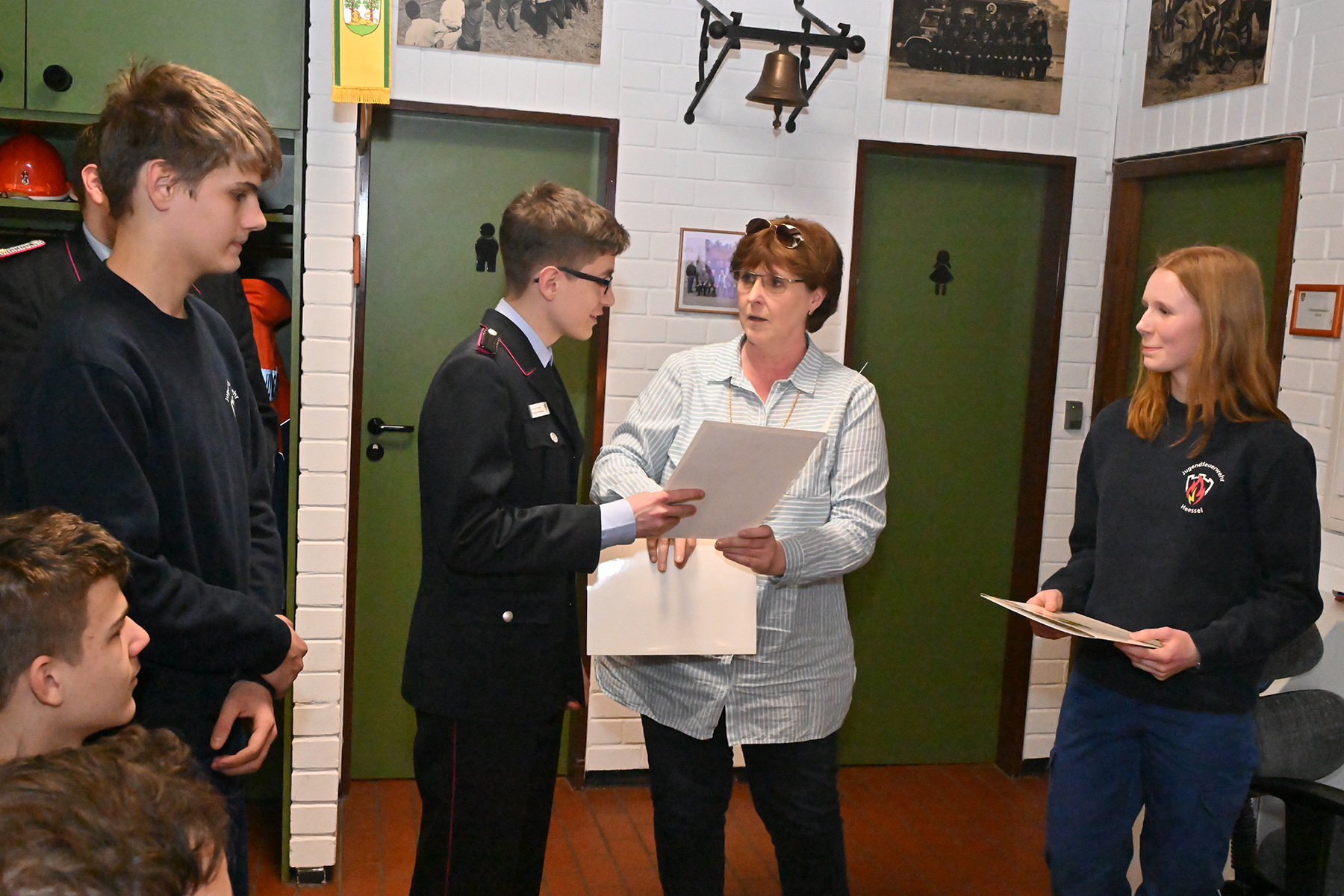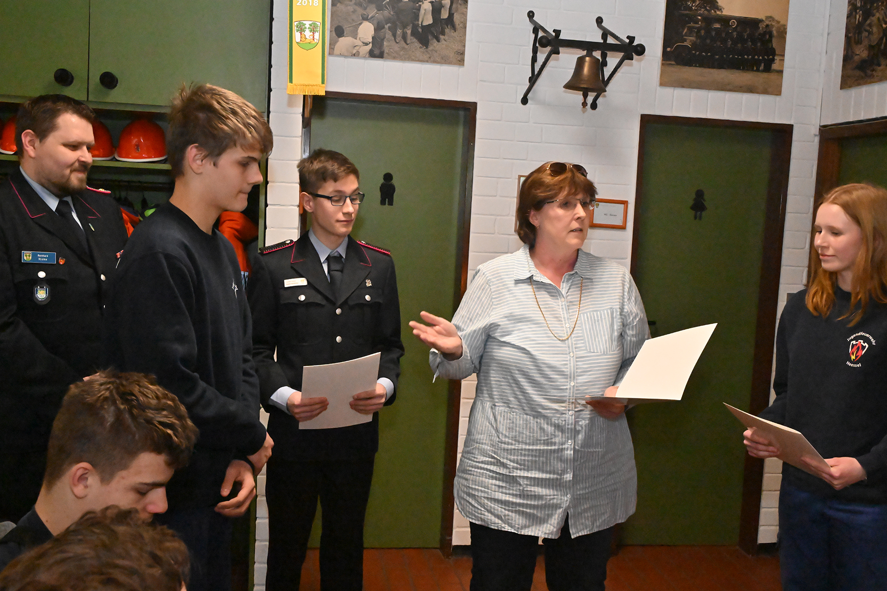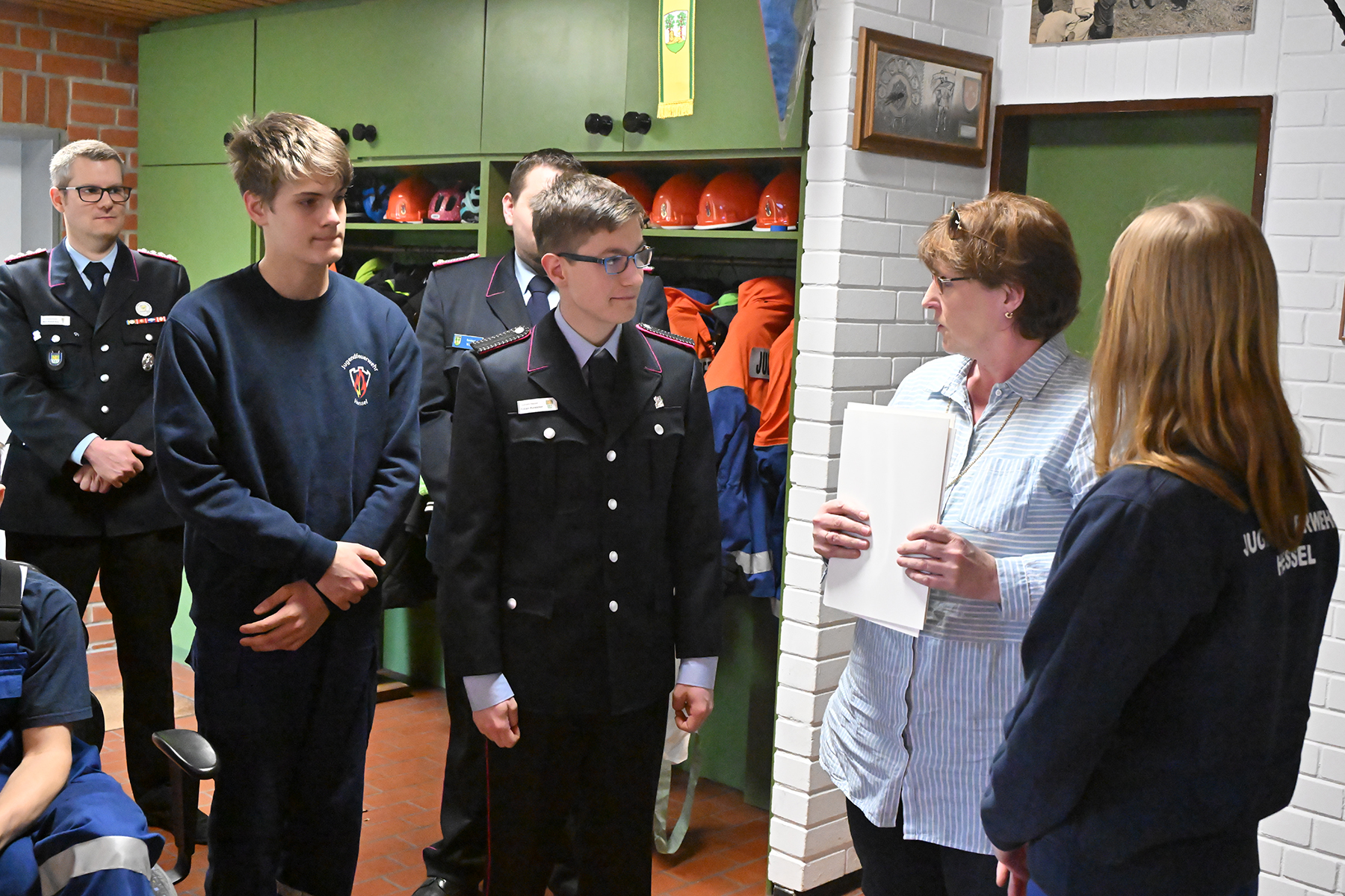 Die Urkunden für die erfolgreiche Prüfung der Leistungsspange überreichte Beate Neitzel an Svea Engelke und Fabian Hunsicker. Als sogenannter "Füller bei der Leistungsspangen-Prüfung fungierte Lasse Bernard, der ebenfalls geehrt wurde. Er hatte zudem zusammen mit Adrian Szczepanik das Brandhaus der Ortsfeuerwehr komplett erneuert. Das bisherige, 25 Jahre alte Brandhaus, war nicht mehr brauchbar, so dass die beiden in Eigenarbeit ein neues Brandhaus hergestellt haben: "Sowas gab es noch in keiner Jugendfeuerwehr", wissen Claudia Nicks und Katharina Engelke. "Hut ab. Wir sind sehr stolz darauf, dass ihr das gemacht habt", betonten die beiden.