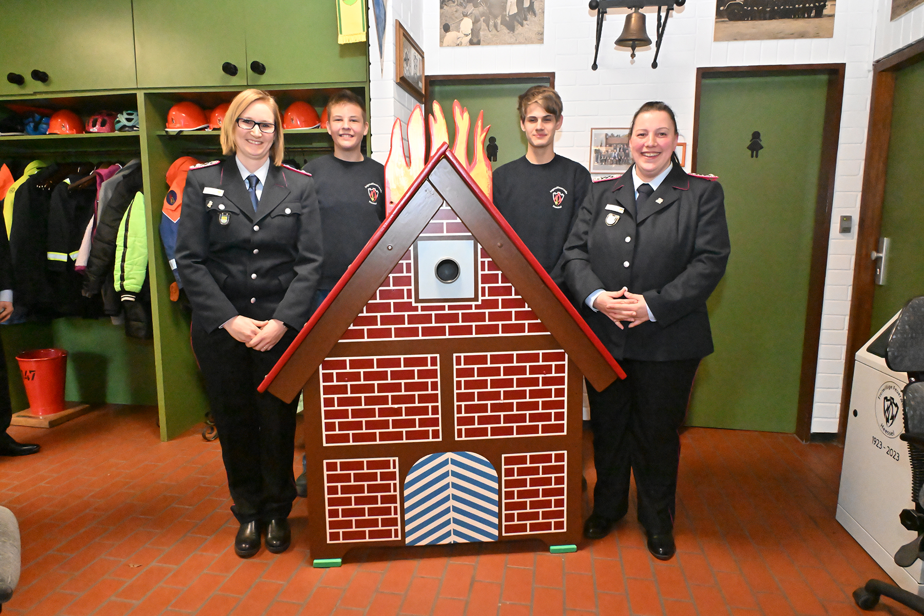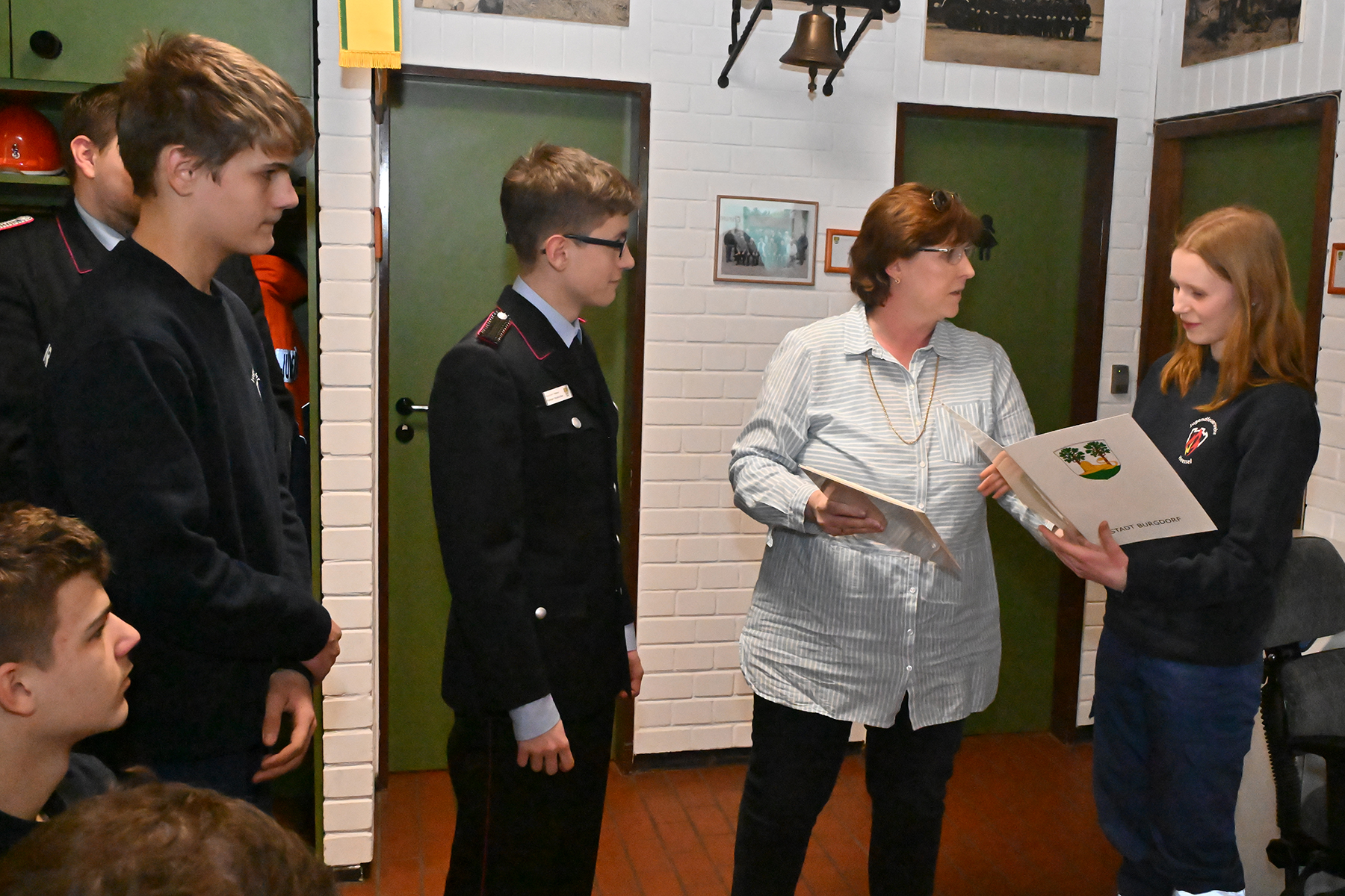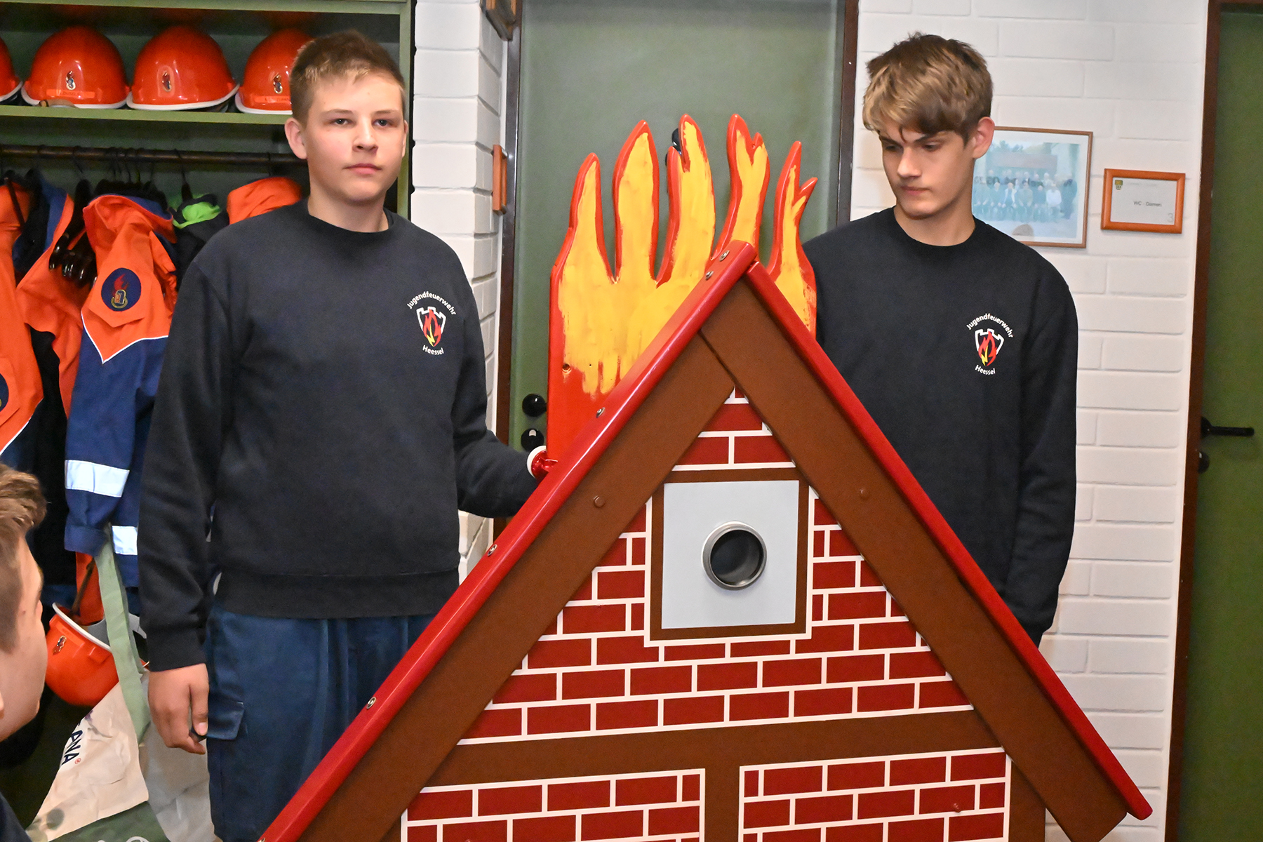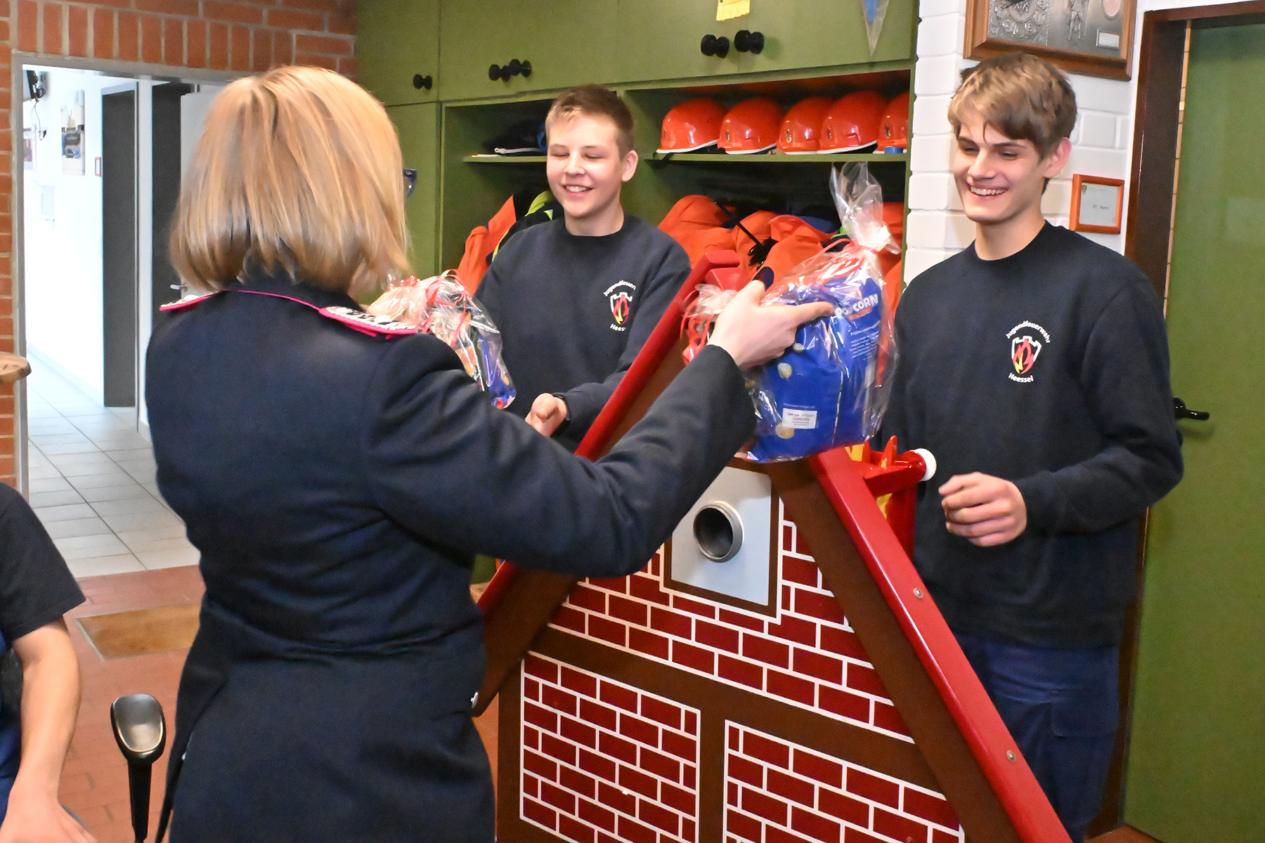 Die Urkunden für die erfolgreiche Prüfung der Leistungsspange überreichte Beate Neitzel an Svea Engelke und Fabian Hunsicker. Als sogenannter "Füller bei der Leistungsspangen-Prüfung fungierte Lasse Bernard, der ebenfalls geehrt wurde. Er hatte zudem zusammen mit Adrian Szczepanik das Brandhaus der Ortsfeuerwehr komplett erneuert. Das bisherige, 25 Jahre alte Brandhaus, war nicht mehr brauchbar, so dass die beiden in Eigenarbeit ein neues Brandhaus hergestellt haben: "Sowas gab es noch in keiner Jugendfeuerwehr", wissen Claudia Nicks und Katharina Engelke. "Hut ab. Wir sind sehr stolz darauf, dass ihr das gemacht habt", betonten die beiden.