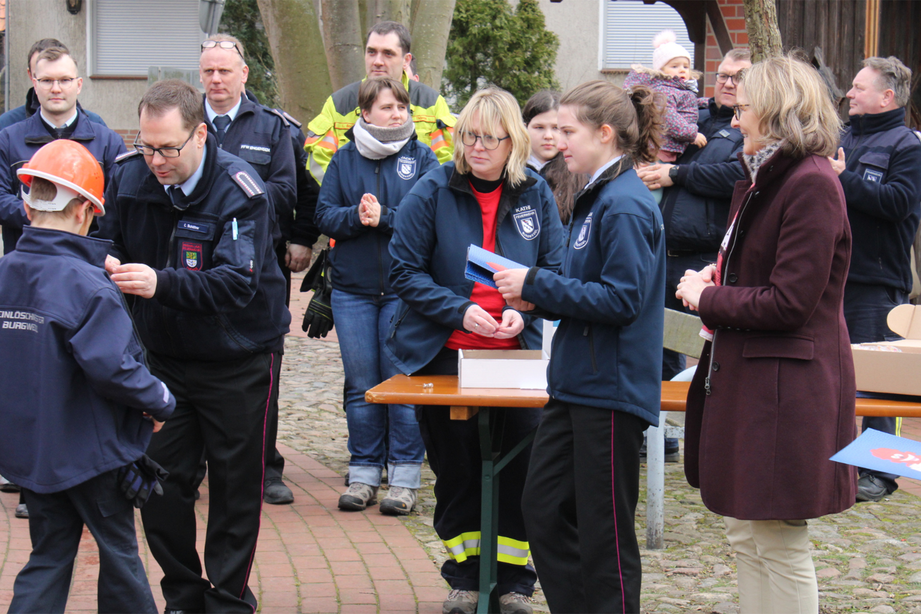 Nach zweieinhalb Stunden Prüfung, mit zahlreichen Pausen dazwischen, ging es für die Kinder zur Urkundenverleihung. Dazu waren auch eine Menge an Eltern, Geschwistern, Bekannten und Freunden gekommen. Und auch aus der Stadt Burgwedel sowie aus der Stadtfeuerwehr waren Vertreterinnen und Vertreter anwesend. So etwa die Stadtbürgermeisterin Ortrud Wendt, die zudem einen kleinen Geschenkkorb dabei hatte. Sie dankte den Anwesenden für ihr Engagement und hob die außerordentliche Leistung des jüngsten Feuerwehrnachwuchses hervor. Ebenfalls anwesend waren die Ortsbrandmeister aus Engensen und Thönse, Uwe Borkowitz und Ingmar Franke, sowie der stellvertretende Ortsbrandmeister aus Thönse, Björn Schimkewitsch. Stadtbrandmeister Carsten Rüdiger lobte in Anwesenheit seines Stellvertreters Florian Leisenberg den großen Wissensschatz der Kinder und zeigte sich erstaunt über die Vielfalt an Stationen, denen sich die Kinder ohne Probleme stellten. Die stellvertretende Stadtjugendfeuerwehrwartin und ehemalige Kinderfeuerwehrwartin aus Engensen, Merle Schneider, machte sich ebenfalls bereits während der Abnahme ein Bild von der Leistung der Kinder und zeigte sich erfreut über die Entwicklung der Kinderfeuerwehr, die sie lange Jahre selbst anführte.