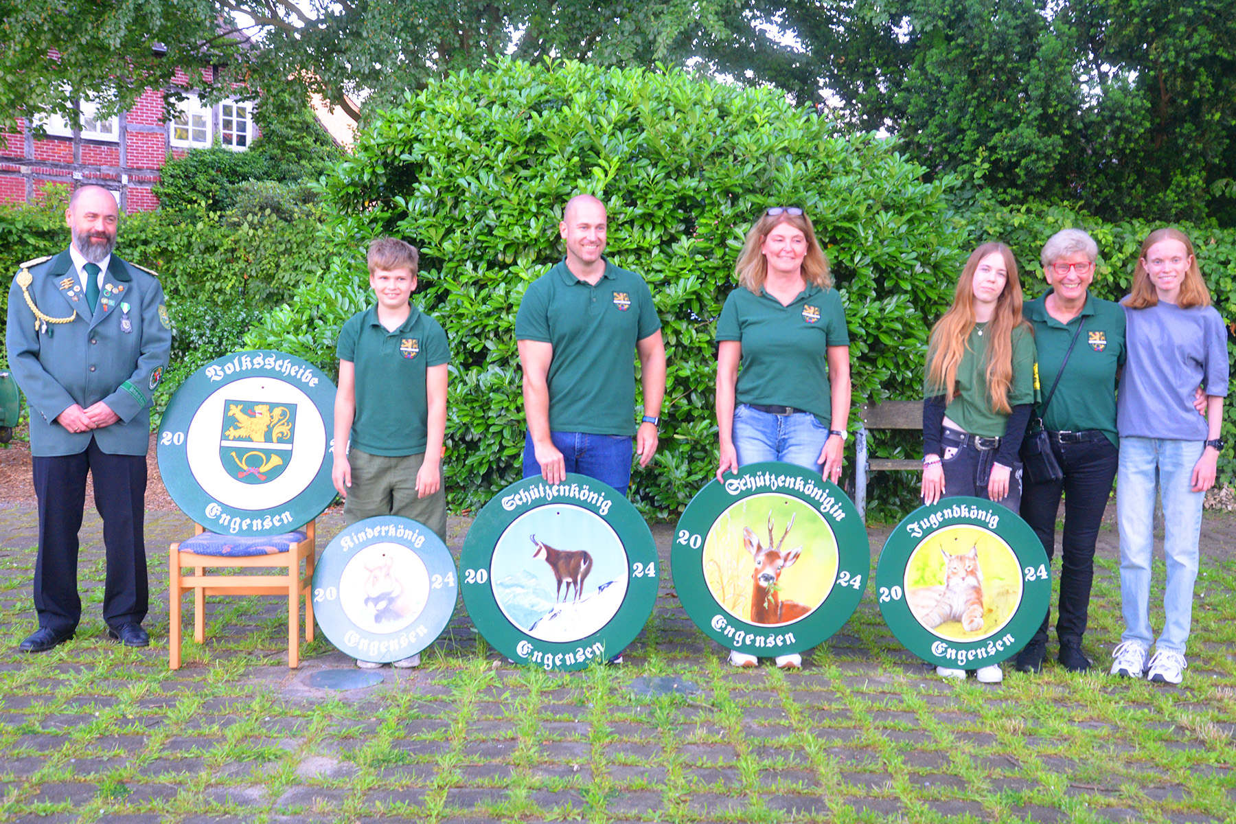 Die Schützengesellschaft "Zentrum" Engensen hat am gestrigen Sonntag, 23. Juni 2024, ihre Majestäten vor dem Vereinsdomizil Am Dorfteich proklamiert. Seit dem 30. Mai konnten an jedem Donnerstag Jugendliche sowie Erwachsene auf die Königswürden sowie auf Pokal- und Sachpreise beim Preisschießen schießen. Der Kinderkönig/in wurde am gestrigen Sonntag mit dem Lichtpunktgewehr ermittelt. Die Königsscheiben für Schützenkönig und Seniorenkönig/in wurden mit dem Kleinkalibergewehr auf 50 Meter ausgeschossen, die Königsscheiben für Schützenkönigin, Juniorenkönig/in, Jugendkönig/in und Volkskönig/in mit dem Luftgewehr auf zehn Meter ausgeschossen.