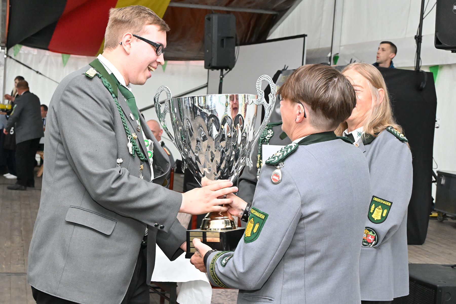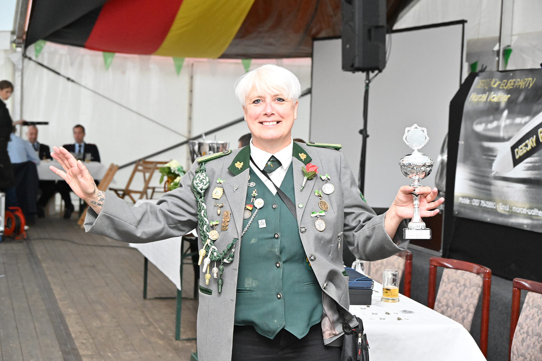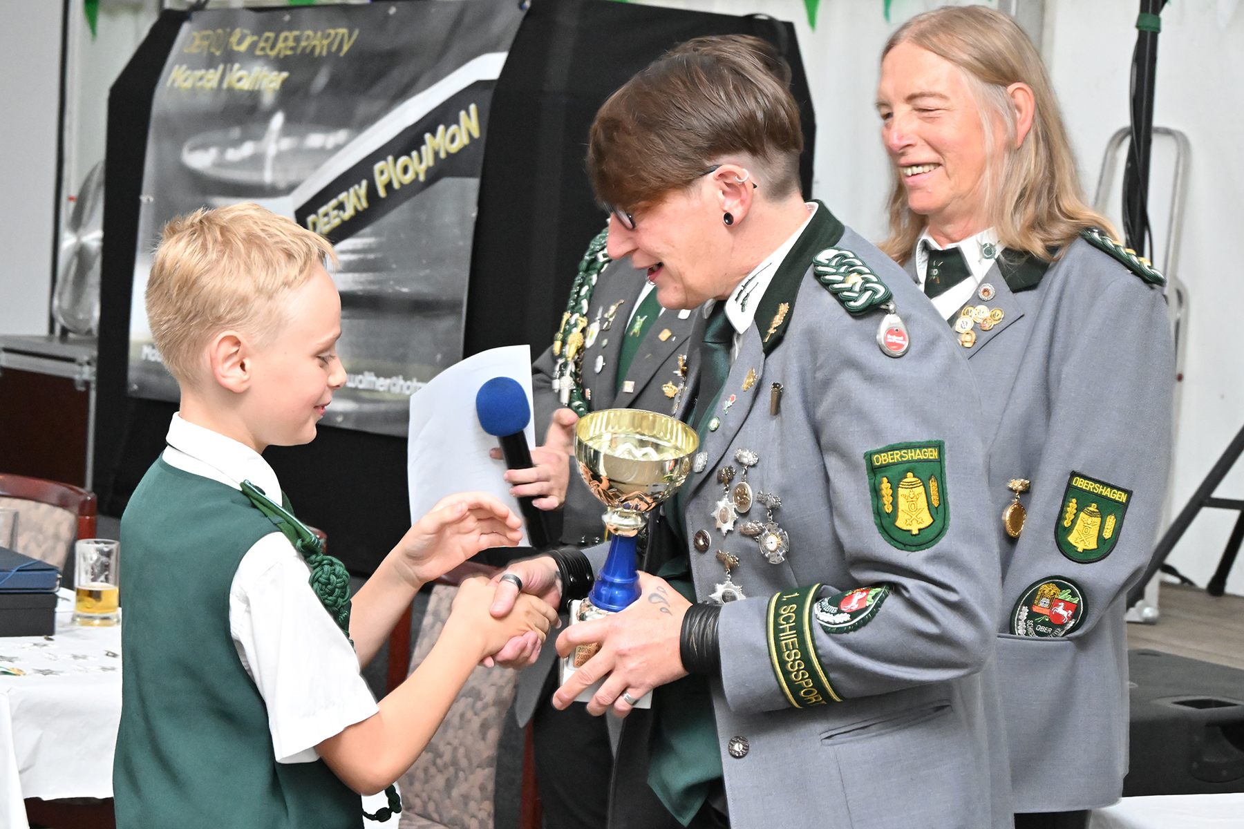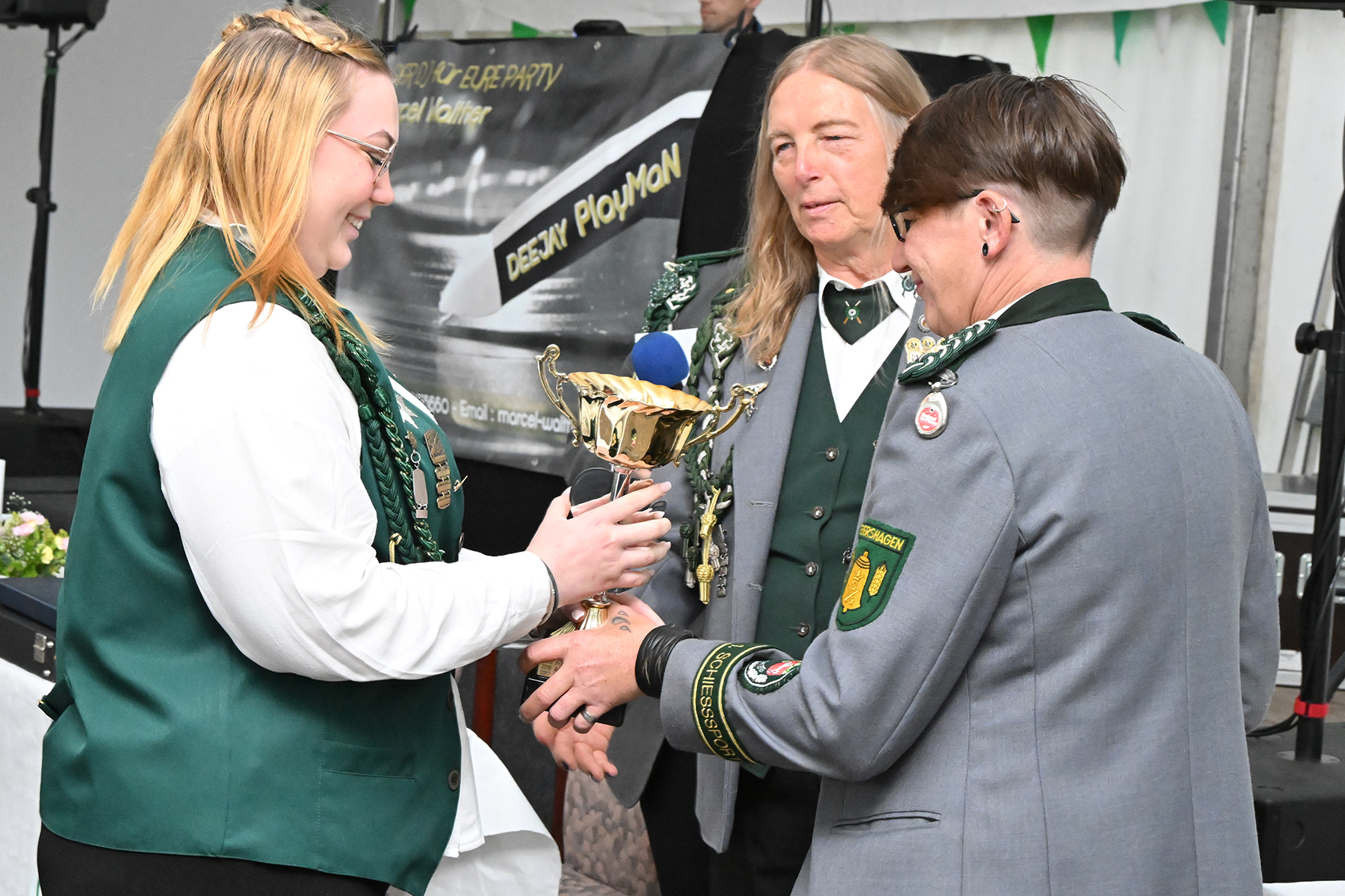 Ehe jedoch die neuen Majestäten bekannt gegeben wurden, standen die Preisverleihungen der Pokale auf dem Programm. Hier wurde schon ersichtlich, welche Namen beim Königsschießen ebenfalls eine große Rolle spielen könnten: Tobias Oskar Hoffmann, der sich den 21-Ring-Pokal, den 30-Ring-Pokal der Kinder, den 333-Teiler-Pokal und den Rote-Laterne-Pokal holte, ebenso wie sein Bruder Christopher Robin Hoffmann, der den Oppermann Kinder-Pokal gewann. Alicia Kohlmeyer sicherte sich den Nachwuchs-Pokal Jugend und den Jugend Wander-Pokal. Der Oppermann Jugend-Pokal ging an Marlon Kuschick und den Auenixen-Pokal holte sich Marie-Ann Beinsen. Plaketten gewannen Christopher Robin Hoffmann, Marlon Kuschick und Nadin Hoppe-Bukoll.