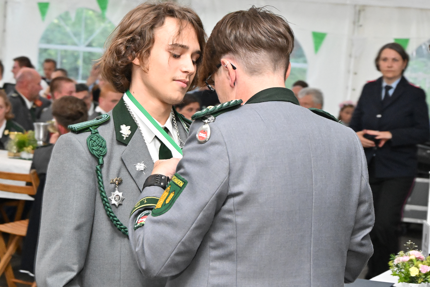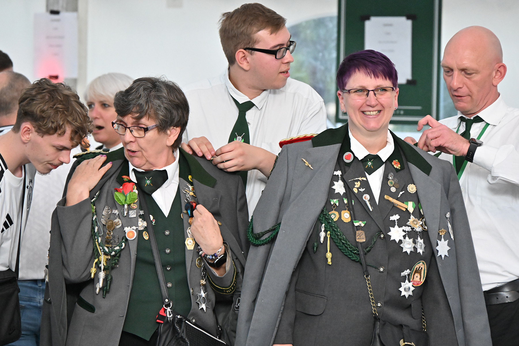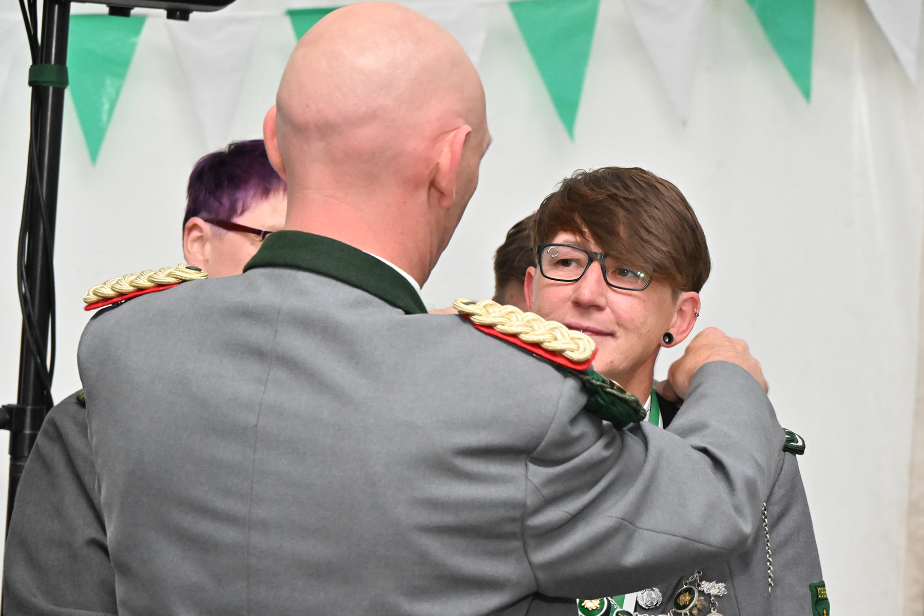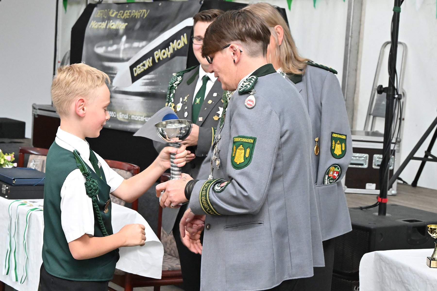 Ehe jedoch die neuen Majestäten bekannt gegeben wurden, standen die Preisverleihungen der Pokale auf dem Programm. Hier wurde schon ersichtlich, welche Namen beim Königsschießen ebenfalls eine große Rolle spielen könnten: Tobias Oskar Hoffmann, der sich den 21-Ring-Pokal, den 30-Ring-Pokal der Kinder, den 333-Teiler-Pokal und den Rote-Laterne-Pokal holte, ebenso wie sein Bruder Christopher Robin Hoffmann, der den Oppermann Kinder-Pokal gewann. Alicia Kohlmeyer sicherte sich den Nachwuchs-Pokal Jugend und den Jugend Wander-Pokal. Der Oppermann Jugend-Pokal ging an Marlon Kuschick und den Auenixen-Pokal holte sich Marie-Ann Beinsen. Plaketten gewannen Christopher Robin Hoffmann, Marlon Kuschick und Nadin Hoppe-Bukoll.
