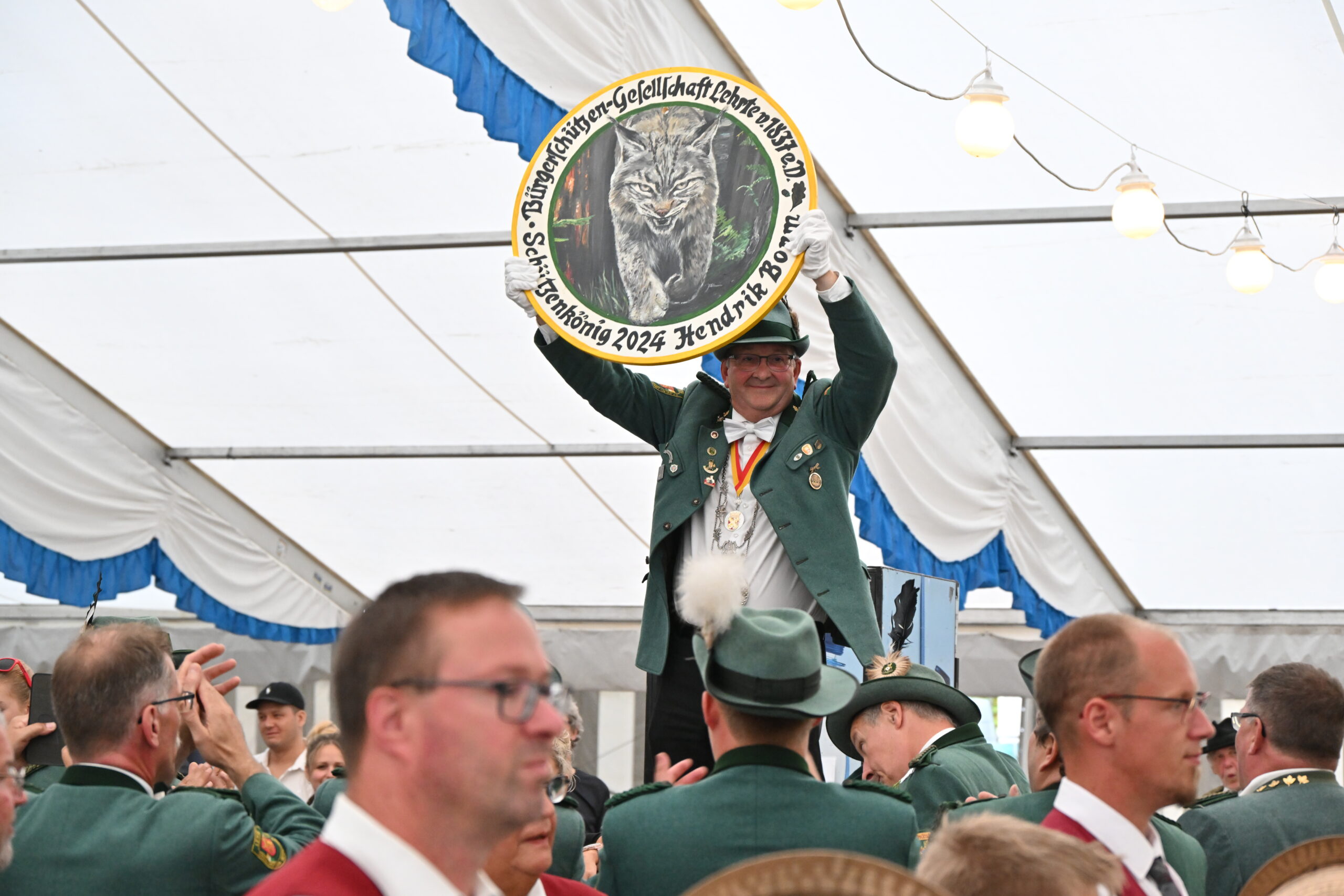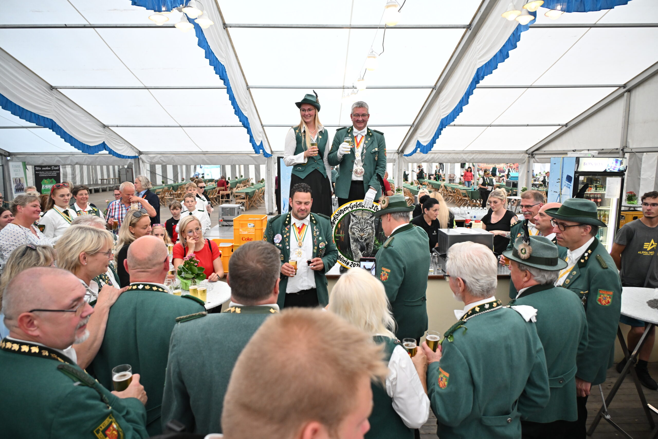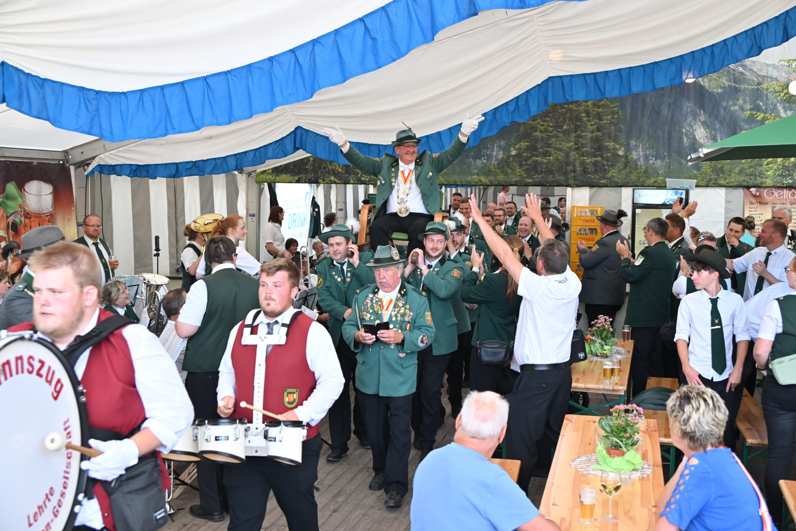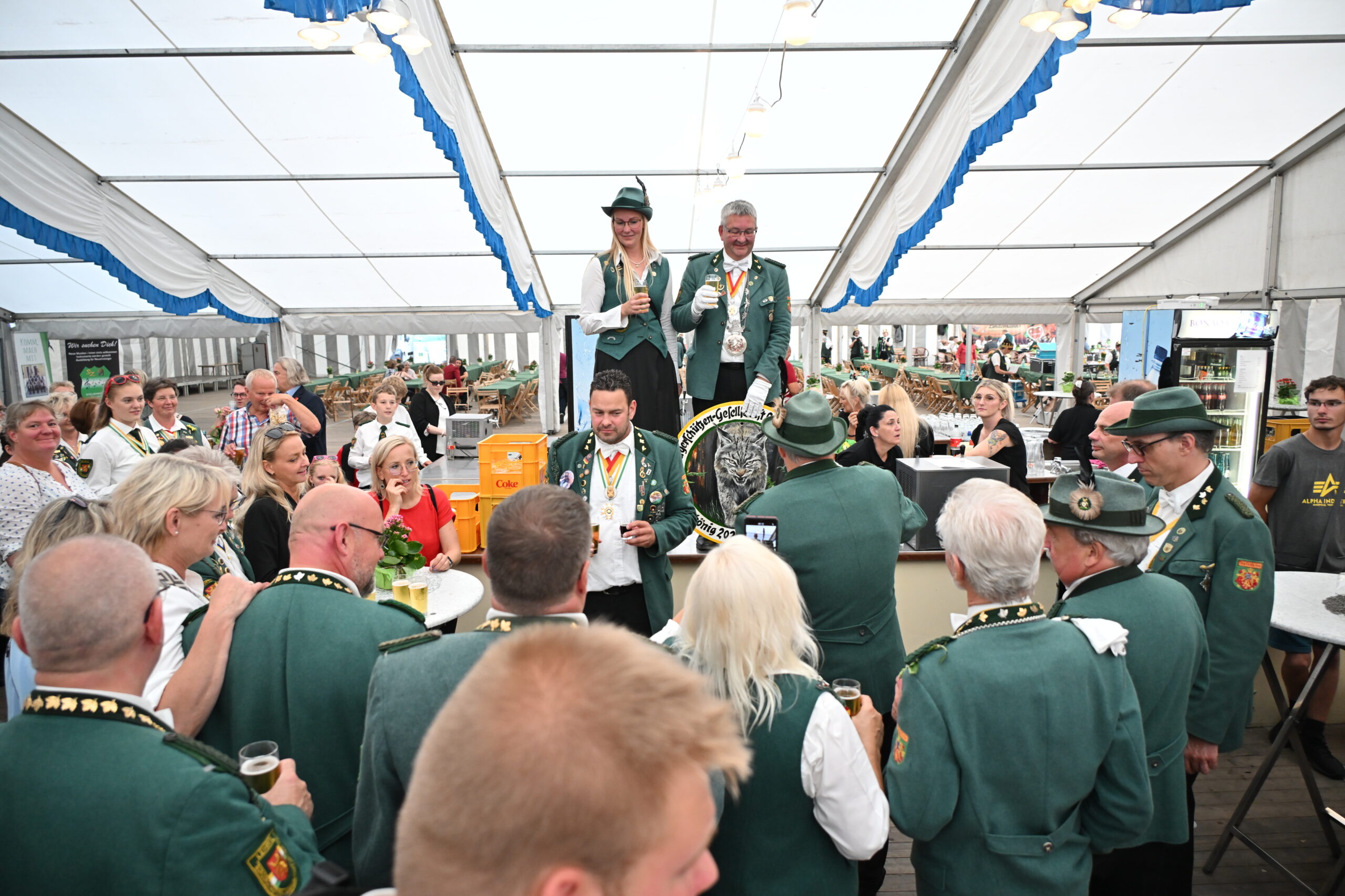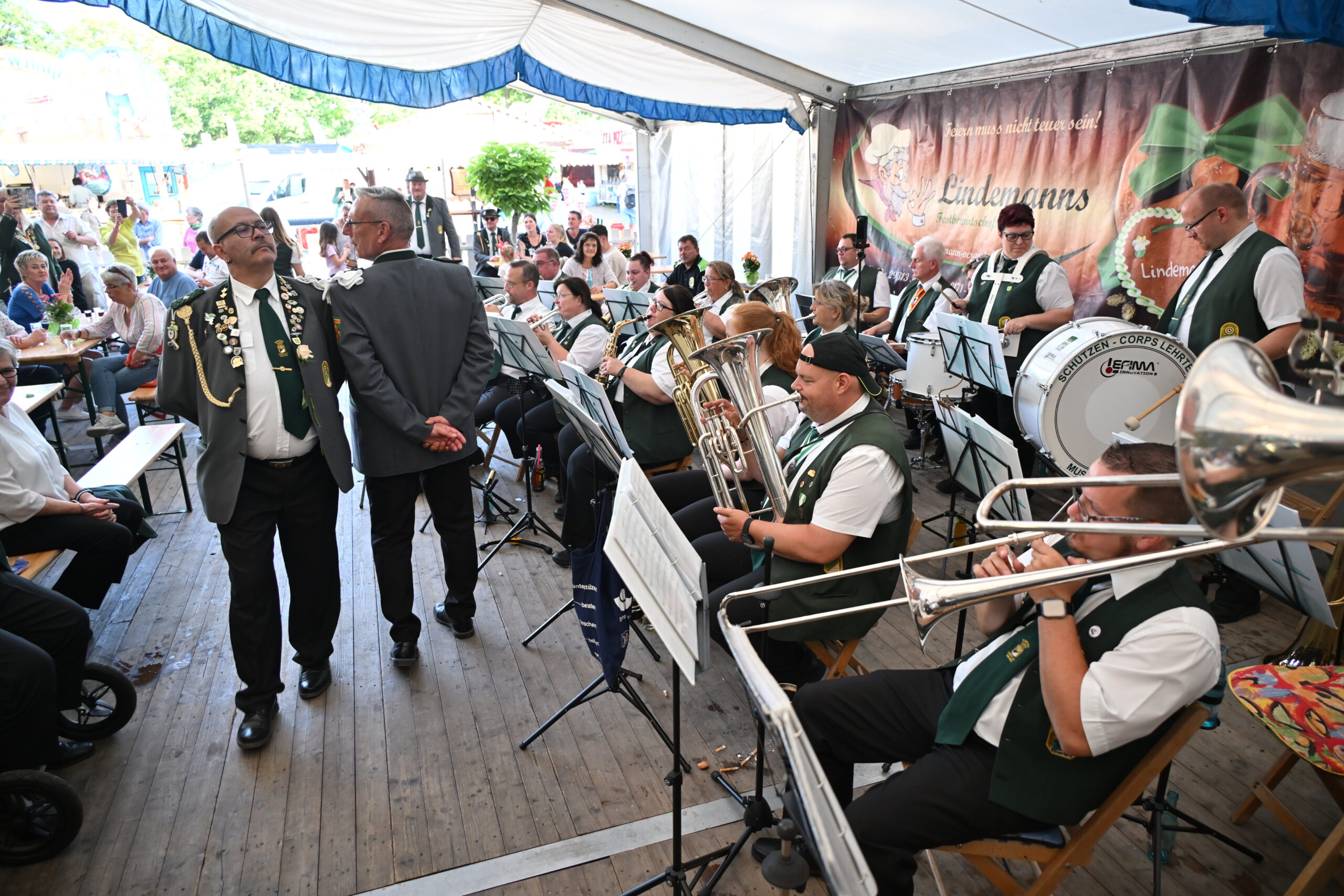 Zuvor hatten die Schützen nach dem Umzug und dem Auftritt der sechs teilnehmenden Musikzüge (wir berichteten) noch kräftig weiter gefeiert. Sie ließen ihre Könige hochleben und im Festzelt sowie auf der großen Terrasse wurden weitere Konzerte der vier Musikgruppen vom Schützen-Corps und der Bürgerschützen-Gesellschaft gegeben. So spielten von der Bürgerschützen-Gesellschaft Lehrte der Spielmannszug und die Brassband, vom Schützen-Corps der Musikzug und der Spielmannszug. Beide Vereine zeigten hierbei wieder das gute Miteinander, sodass jeweils abwechselnd die Musiker beider Vereine zum Zuge kamen.