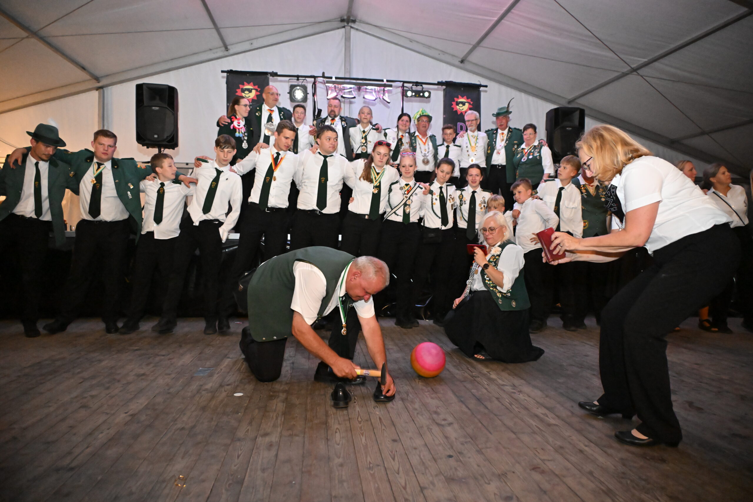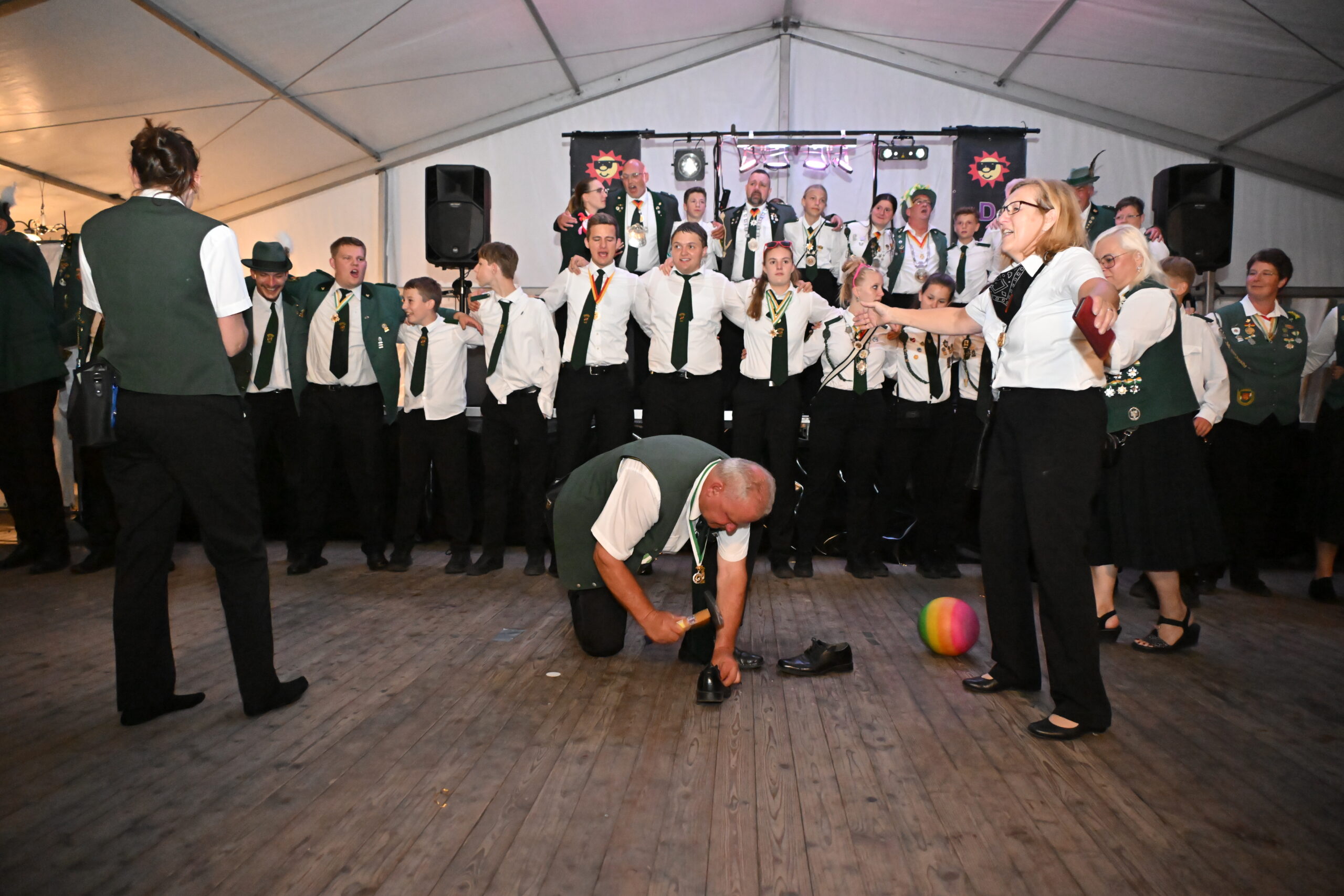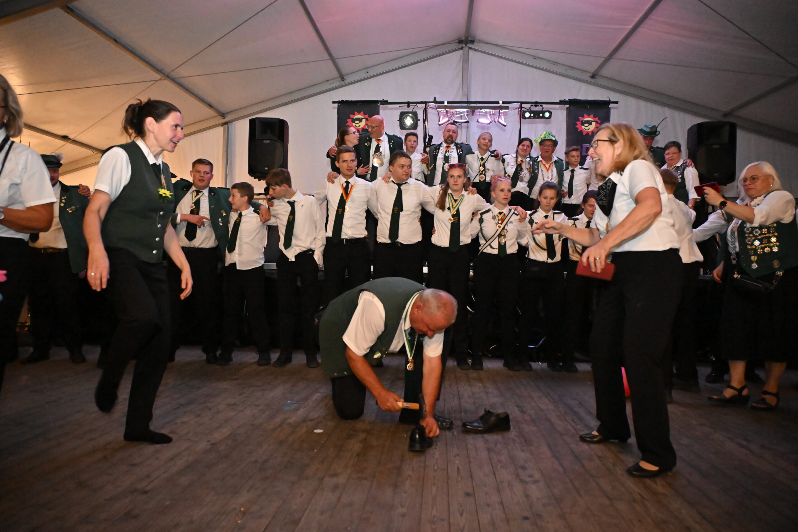 Um 23 Uhr versammelten sich dann die Majestäten auf der Bühne, um mit den Gästen gemeinsam traditionell "Johnny Walker" zu singen und einen Schuh auf dem Boden des Festzeltes zu nageln, womit das Ende der viertägigen Sause besiegelt wurde.