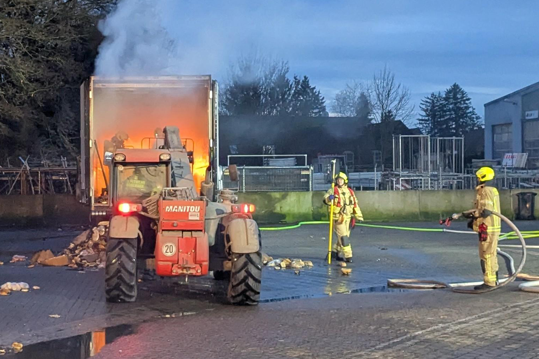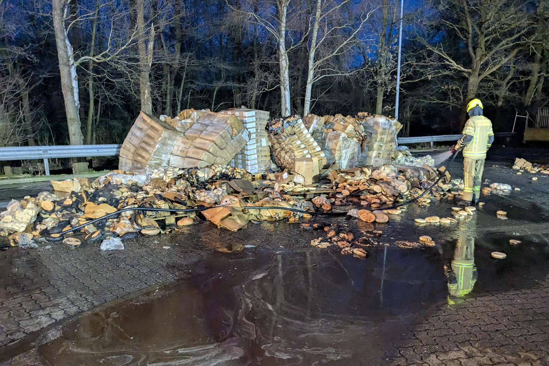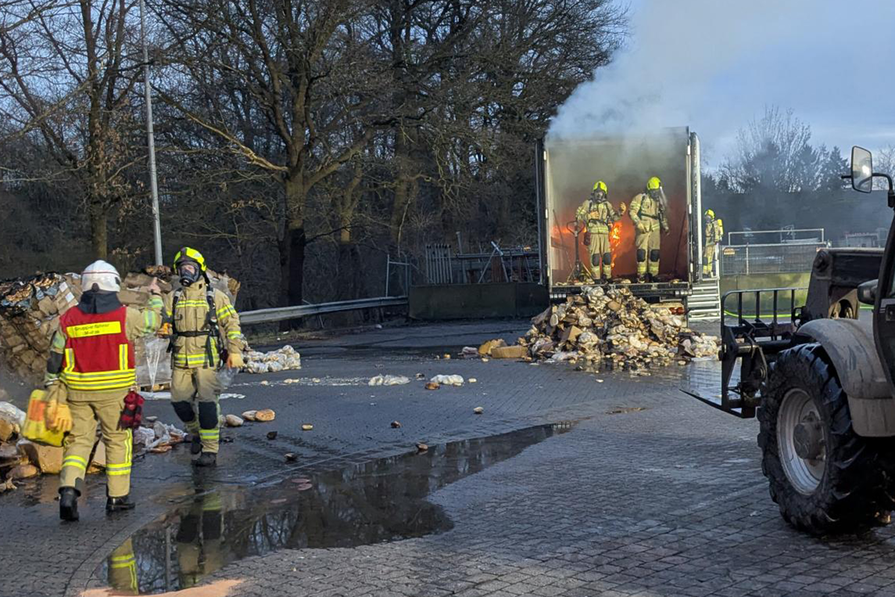 Der Lkw war voll beladen mit tiefgefrorenen Backwaren. Mit Hilfe eines Teleskopladers und im späteren Verlauf per Hand musste der Lkw entladen werden. Hierfür würde im weiteren Verlauf des Einsatzes die Ortsfeuerwehr Elze mit weiteren Atemschutzgeräteträgern nachalarmiert.