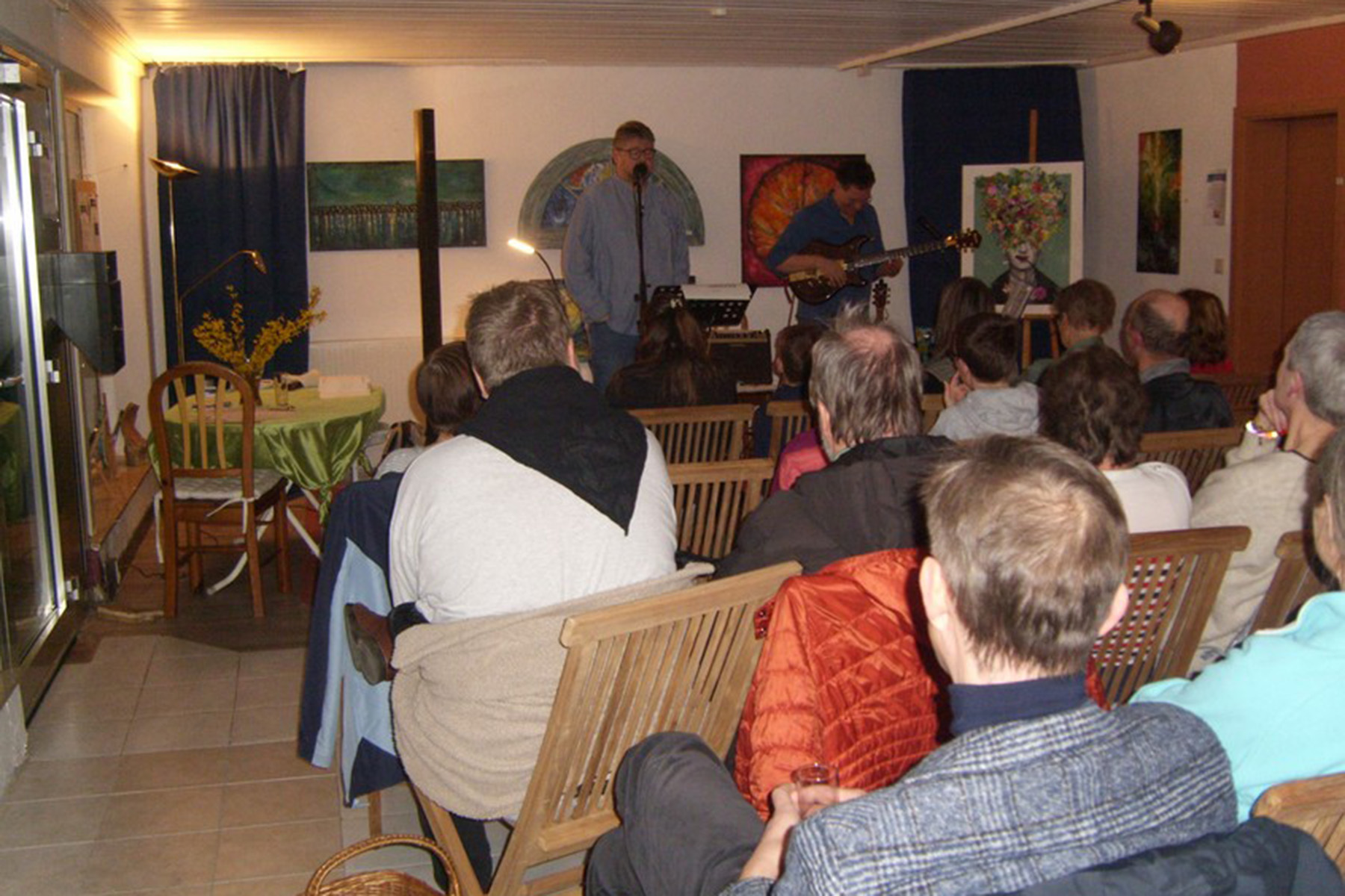 Den Auftakt machten Harald (Gesang) und Volker (Gitarre), die als Duo Artano Soiree auftraten. Mit einer ausdrucksstarken Männerstimme, virtuosem Gitarrenspiel und eigenen Liedern zogen sie das Publikum direkt in ihren Bann. Danach folgte eine Premiere: Astrid K. las ihren selbst verfassten Text „frozen zone“, in dem sie die aktuelle gesellschaftliche Lage reflektierte und zu mehr Respekt und Freundlichkeit aufrief. Anschließend brachte Susanne mit selbst begleiteten Liedern auf der Gitarre die musikalische Stimmung zurück. Vor der Pause beeindruckte Astrid U. mit dem Klavierstück „Experience“ von Ludovico Einaudi.