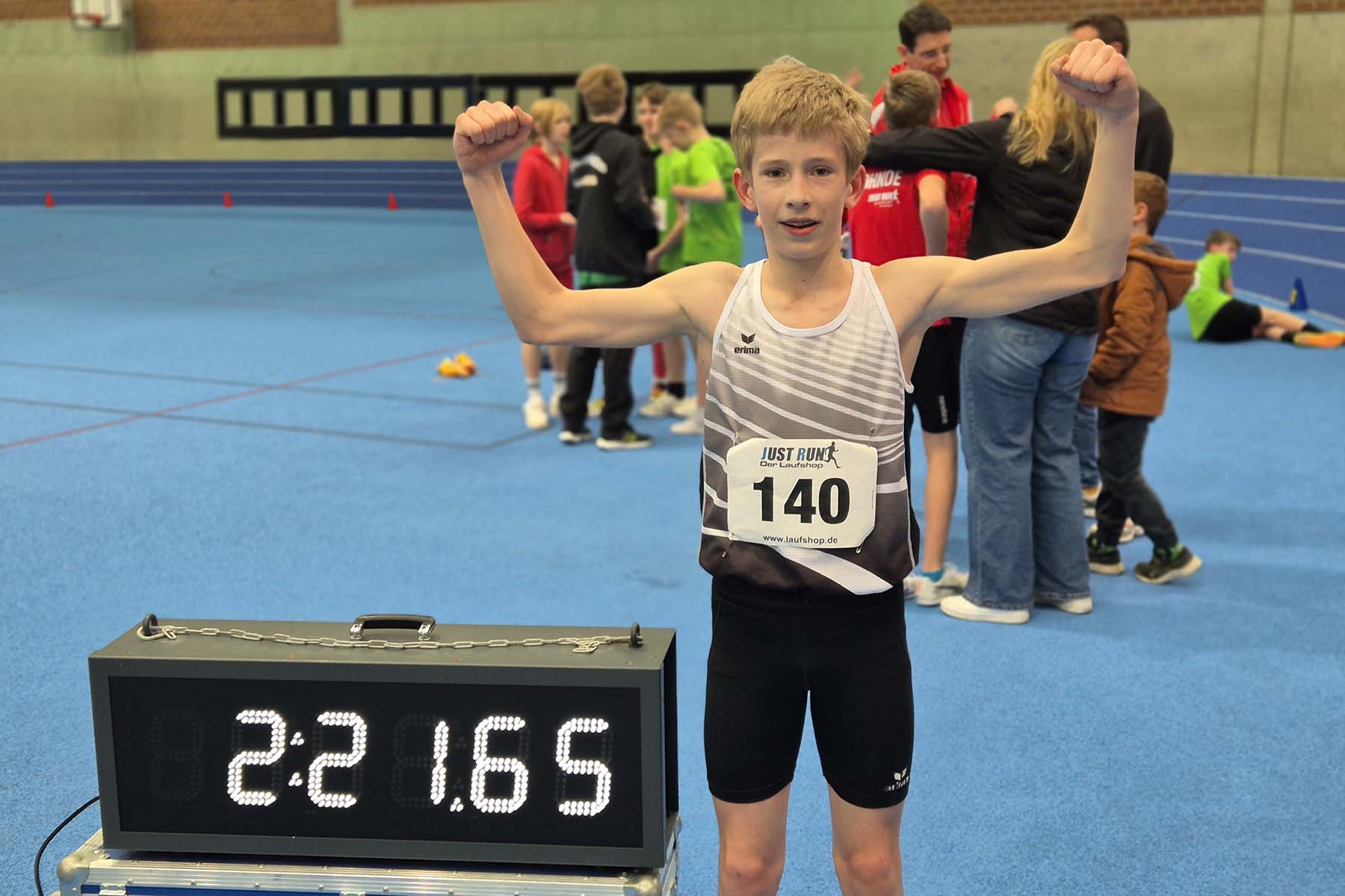Gleich zu Anfang ging es mit einem Doppelschlag los. Über die 60 Meter Hürden sprinteten Bela und Jonne „wie die Wahnsinnigen“ über die 76,2 Zentimeter hohen Hindernisse. Für Jonne blieb die Uhr bei 9,91 Sekunden stehen; Platz 2 in persönlicher Bestzeit. Für Bela stoppte die Uhr bereits nach 9,75 Sekunden; Platz 1 ebenfalls mit persönlicher Bestzeit und neuem Vereinsrekord. „Wie stark diese beiden Zeiten zu bewerten sind, sieht man daran, dass die Bestzeit in der Landesbestenliste von Niedersachsen letzte Saison 10,01 Sekunden betrug“, unterstreichen die TSV_Leichtathleten.