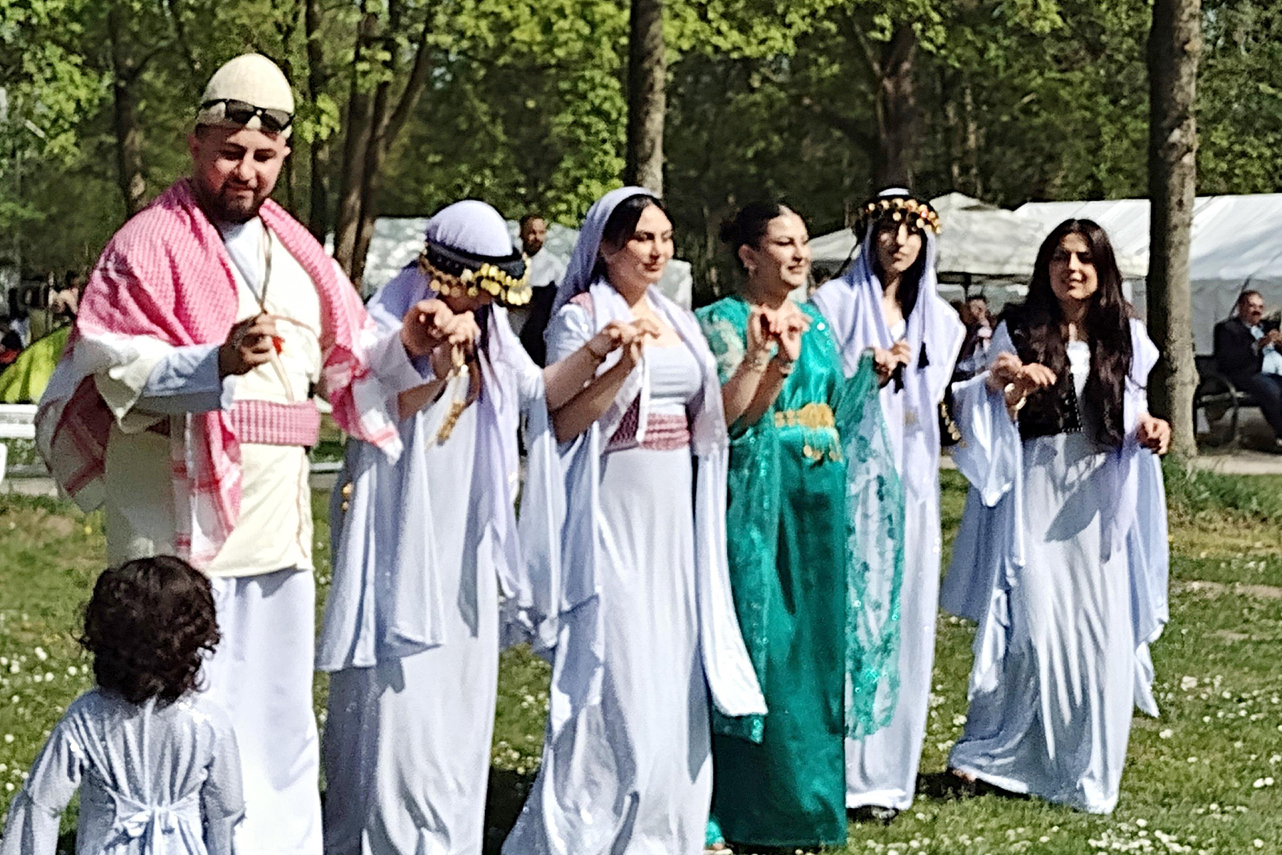 Währenddessen hatten sich auf den Wiesen hinter der „Alten Landratsvilla“ bereits viele Familien unter sonnig-blauem Aprilhimmel zum gemeinsamen Picknick und Tanz getroffen. Der für Jesiden heilige Monat April wird auch „Braut des Jahres“ (Bûka Salê) genannt, weil der Mythologie nach in dieser Zeitspanne die Engel heiraten. Die Menschen müssen dann eben mit ihrer Vermählung auf den Wonnemonat Mai warten.