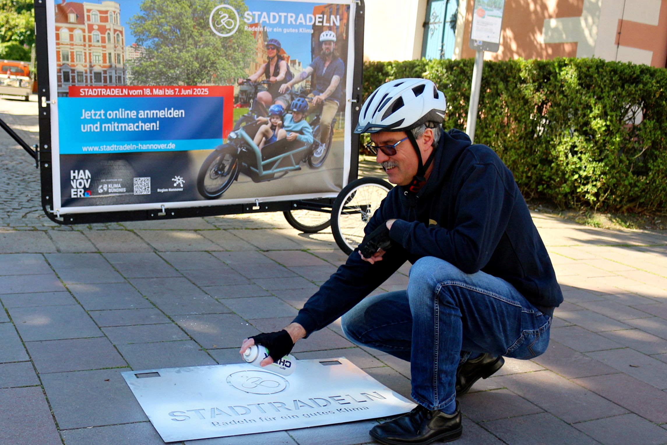 Noch bevor am morgigen Sonnabend, 10. Mai 2025, der ADFC Burgdorf-Uetze auf dem Burgdorfer Wochenmarkt über die deutschlandweite Kampagne informiert und die Werbetrommel rührt, fand heute, 9. Mai 2025, auf dem Spittaplatz eine Sprayaktion von der hannoverschen Eventagentur SoulStyle mit dem Klimaschutzmanager der Stadt Burgdorf, Volker Krüger, statt, um möglichst viele Burgdorferinnen und Burgdorfer zur Teilnahme an der Strampelei zu bewegen.
