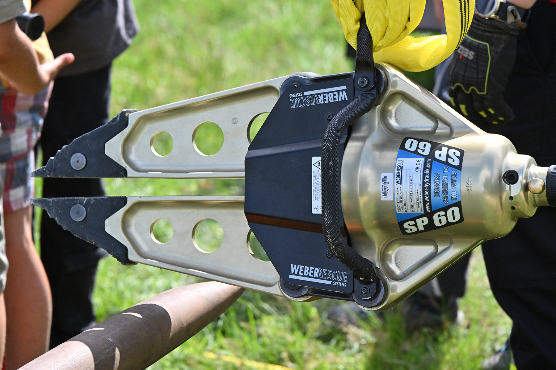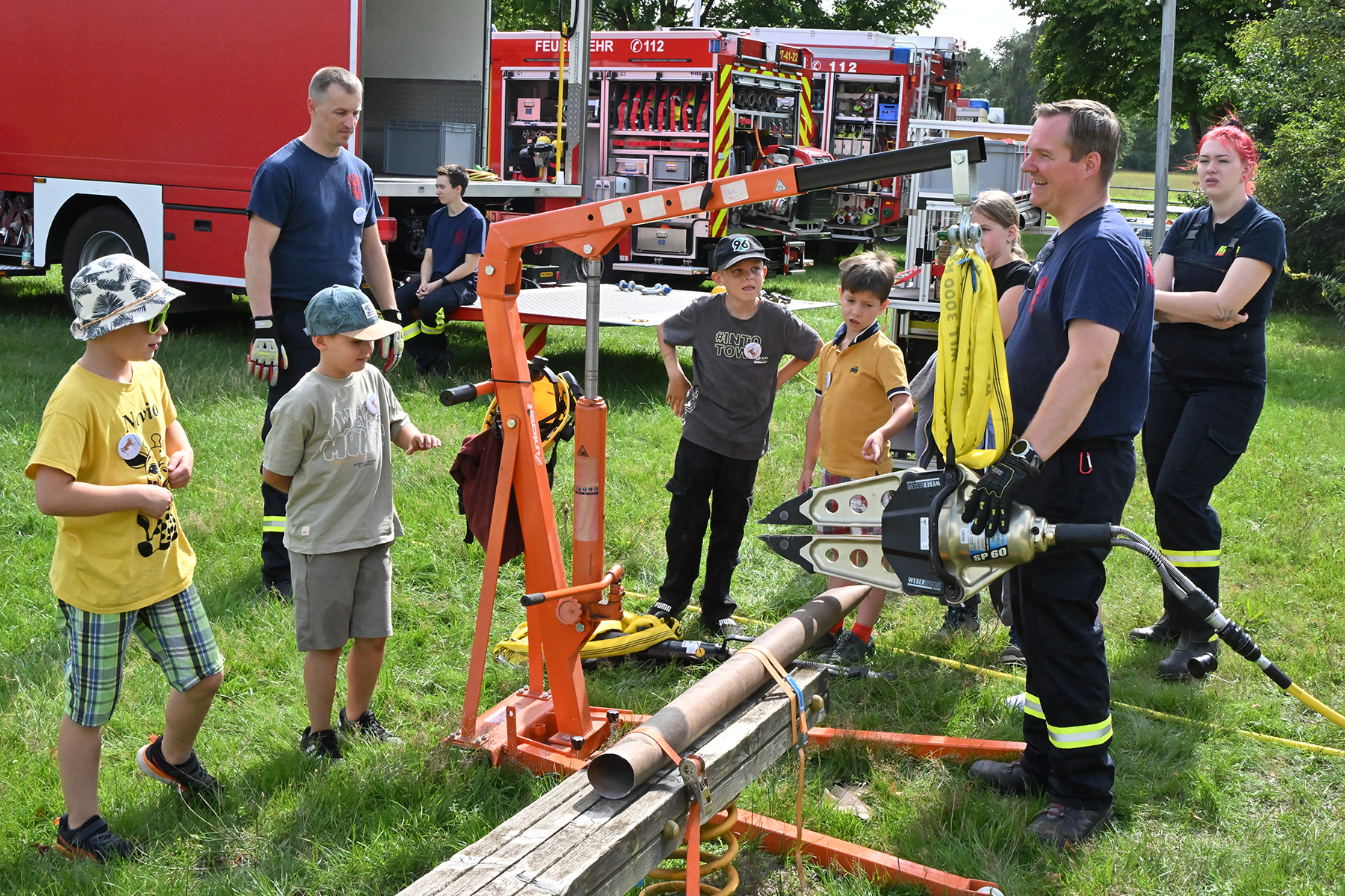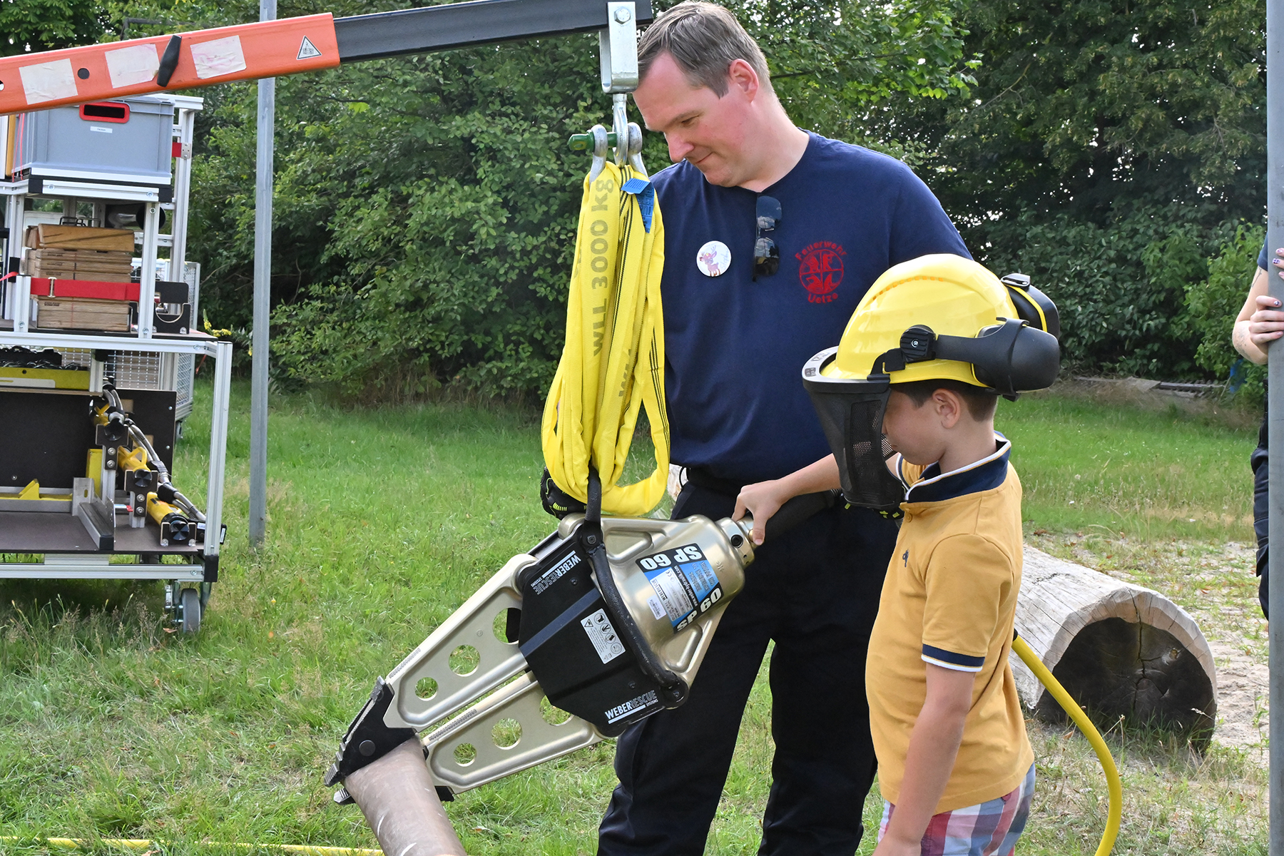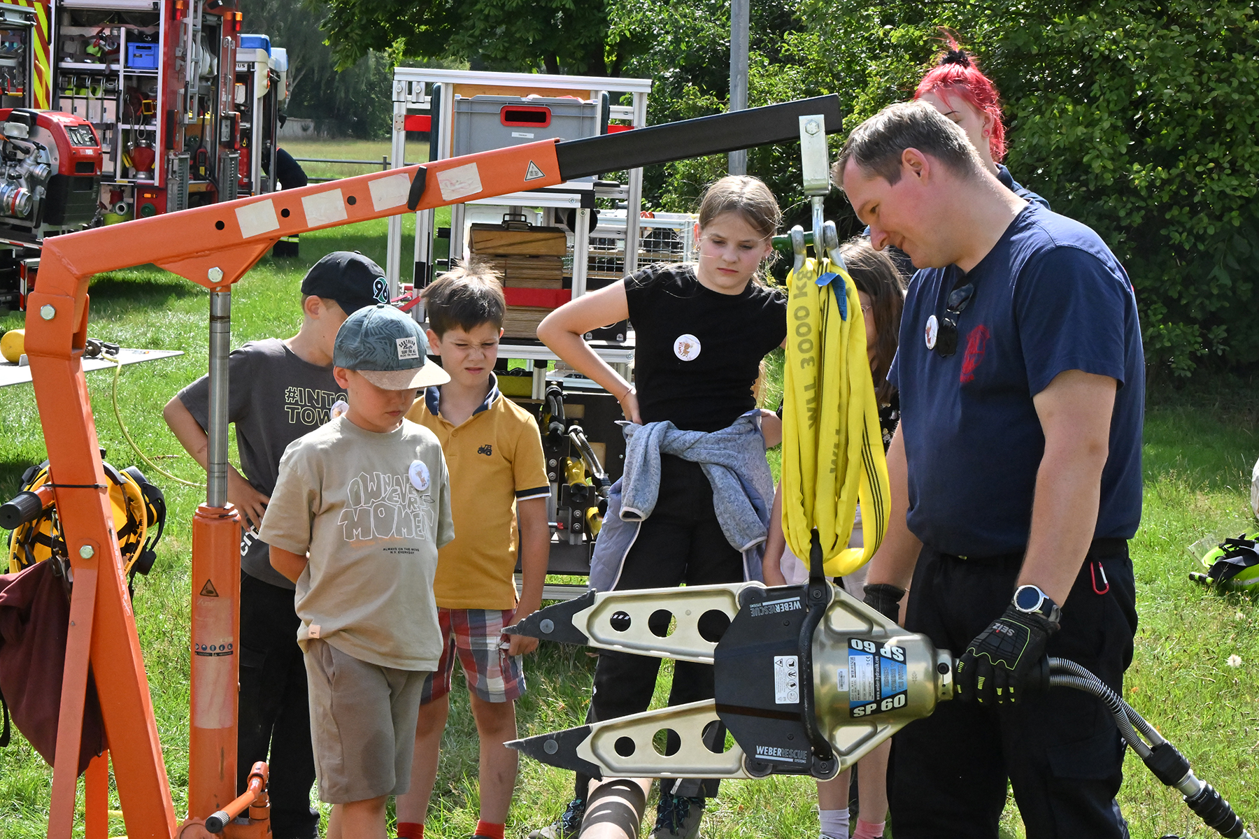 Jugendfeuerwehrwart Julian Sacher hatte gemeinsam mit rund 20 engagierten Helferinnen und Helfern ein abwechslungsreiches Programm vorbereitet. An fünf Stationen erhielten die Teilnehmer, die in drei Gruppen aufgeteilt worden waren, spannende Einblicke – und das nicht nur zum Zuschauen, sondern vor allem zum Mitmachen. Besonders faszinierend war für viele das Arbeiten mit dem schweren hydraulischen Rettungsgerät. Auch wenn das Gerät für Kinderhände kaum zu bewältigen ist, durften die Teilnehmer mit gesichertem Spreizer ein Rohr zerdrücken oder mit der hydraulischen Schere ein Stück Metall abschneiden – ein eindrucksvolles Erlebnis.
