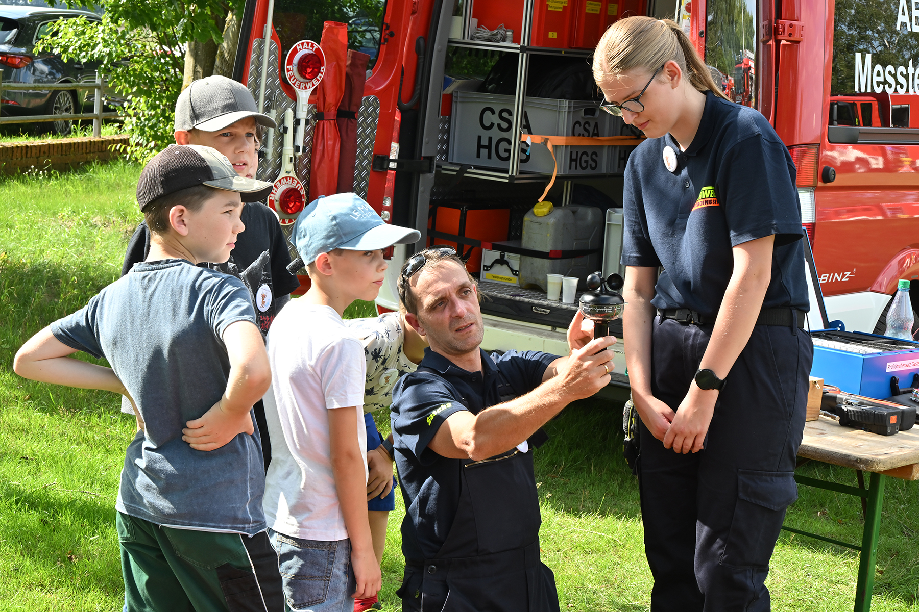 Nicht weniger spannend war die Station rund um die wasserführenden Armaturen, wo aus diesen ein Männchen gebaut und erklärt wurde, wie ein Unterflurhydrant funktioniert. Große Augen machten die Teilnehmenden auch bei der Fahrzeugschau. Neben den Einsatzfahrzeugen der Ortsfeuerwehr Altmerdingsen wurden eigens aus Uetze und Hänigsen ein Löschfahrzeug, der Gerätewagen Logistik sowie der Gerätewagen Messtechnik präsentiert, so dass am Ende fünf Feuerwehrfahrzeuge und ein Anhänger erkundet werden konnten.