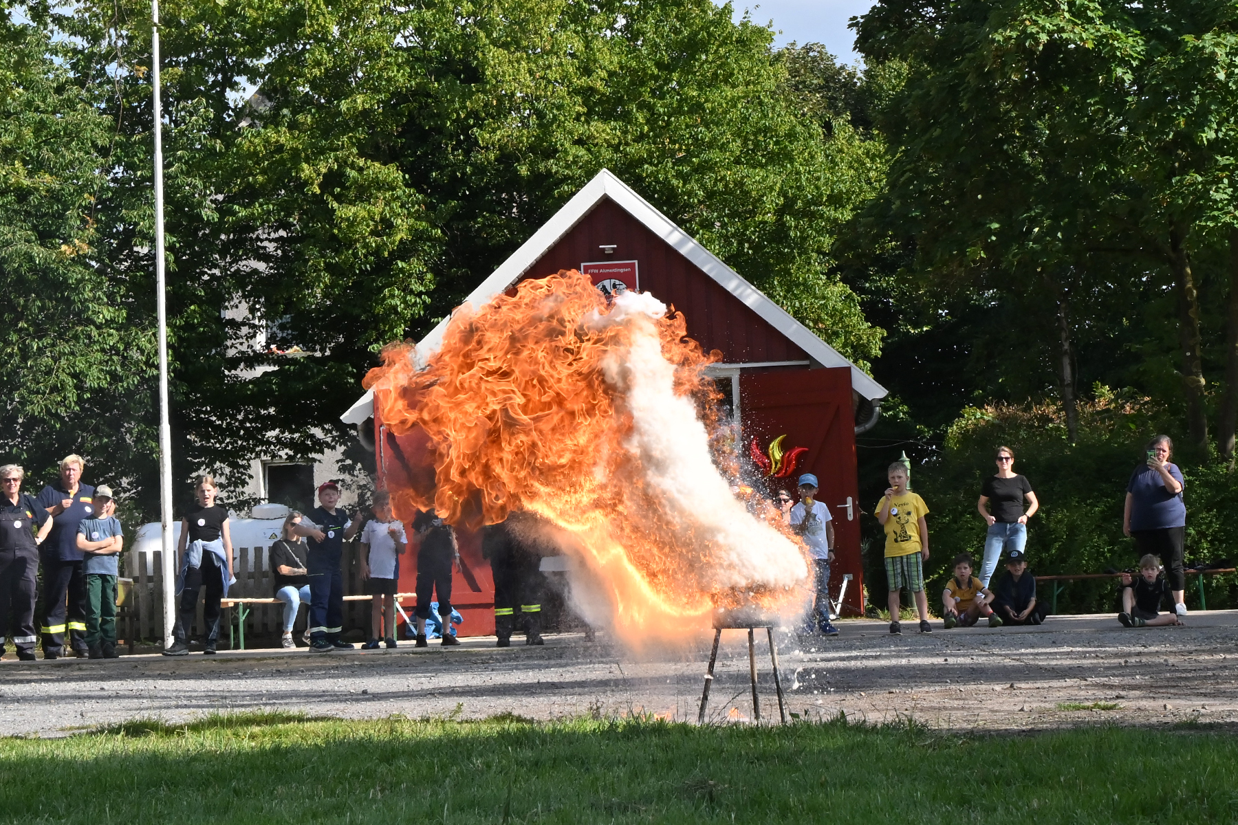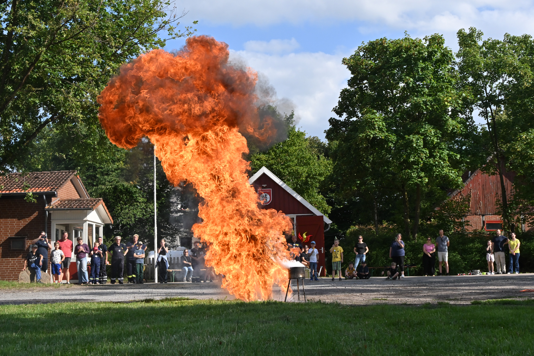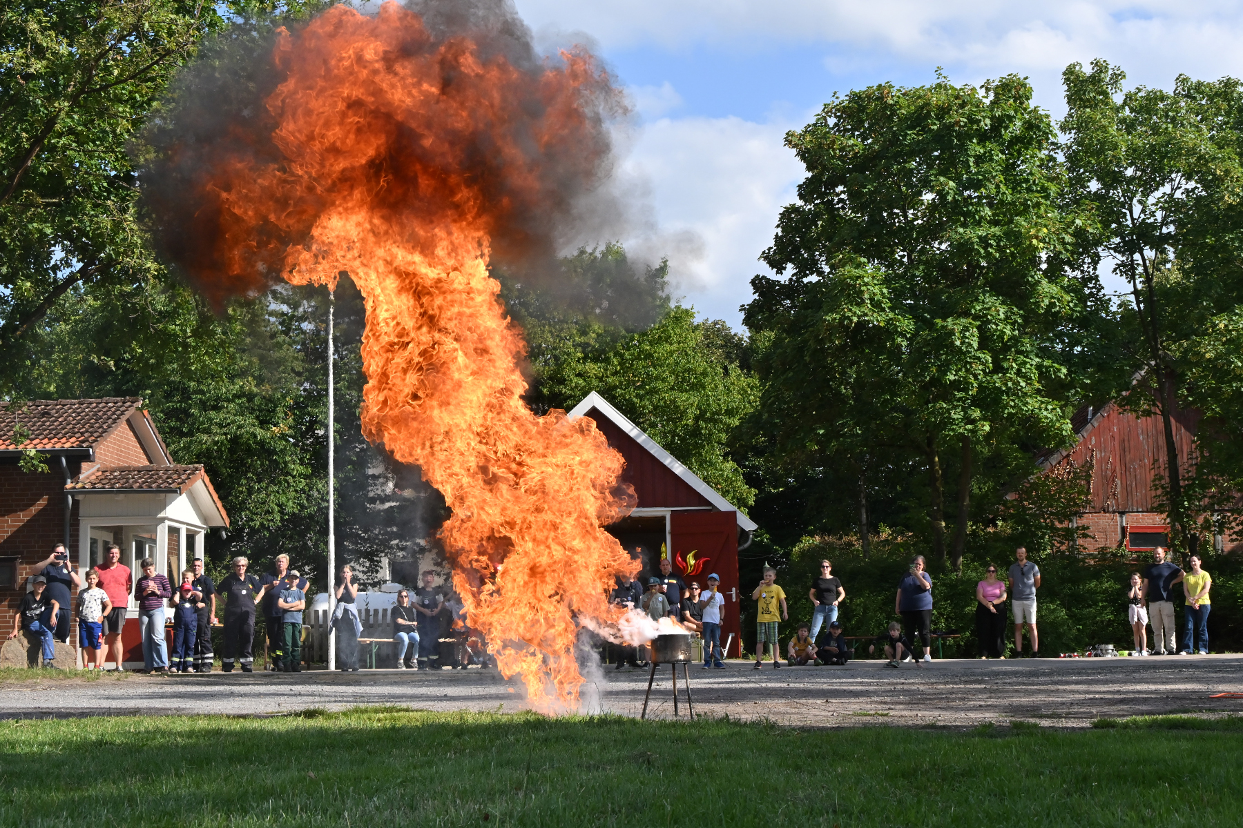Viel Andrang herrschte auch am Brandhaus und am Brandsimulator. Besonders das Löschen eines echten Feuers mit einem Feuerlöscher sorgte für Begeisterung – viele wollten am liebsten gar nicht mehr aufhören. Krönender Abschluss des Nachmittags war die eindrucksvolle Demonstration einer Fettexplosion. Wie gefährlich es ist, brennendes Fett mit Wasser zu löschen, wurde eindrucksvoll sichtbar, als eine meterhohe Stichflamme in den Himmel schoss. Das zuvor verteilte Eis geriet hier für einen kurzen Augenblick in Vergessenheit.