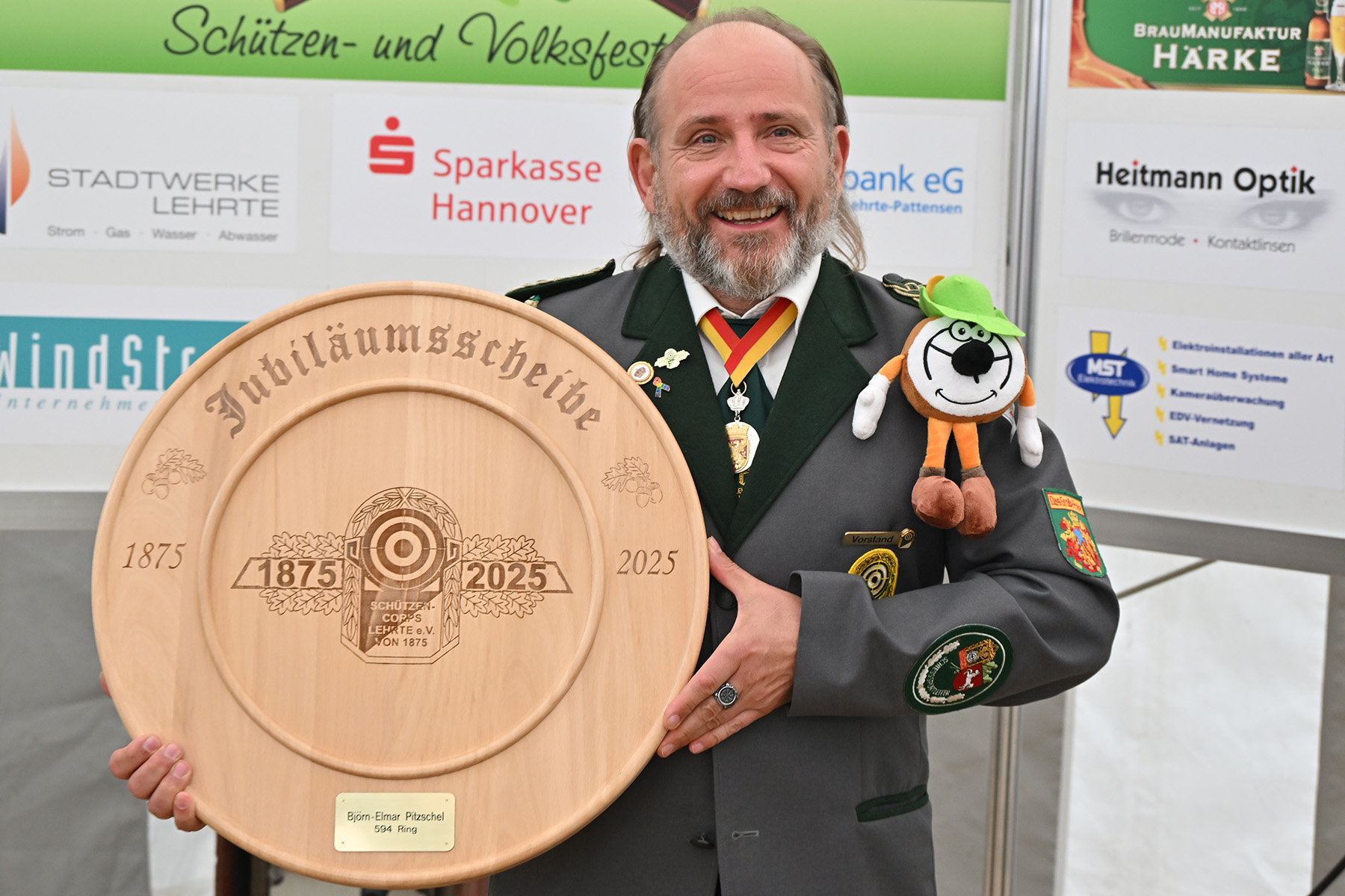 Zum Abschluss wurde noch der Gewinner der Jubiläumsscheibe des Schützen-Corps bekanntgegeben. Diese wurde anlässlich des 150. Geburtstages des Corps ausgeschossen. Der Überraschungssieger ist Björn-Elmar Pitzschel, der nun neben der Stadtkönigsscheibe auch die Jubiläumsscheibe in Empfang nehmen durfte.