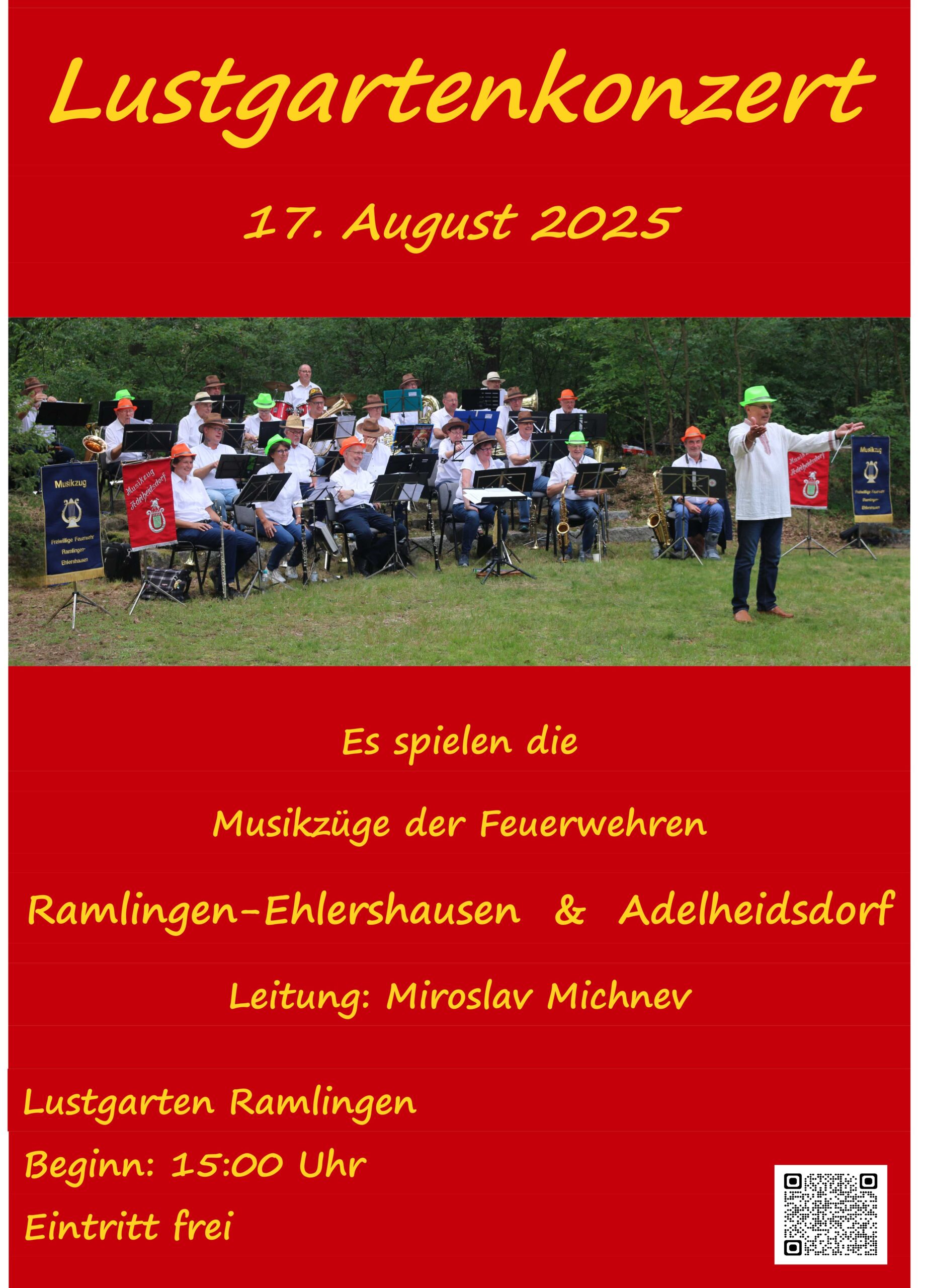 Am Sonntag, 17. August 2025, wird im Lustgarten in Ramlingen das traditionelle Lustgartenkonzert begangen. Ab 15 Uhr spielen die Musikzüge der freiwilligen Feuerwehren Ramlingen-Ehlershausen und Adelheidsdorf unter musikalischer Leitung von Miroslav Michnev.