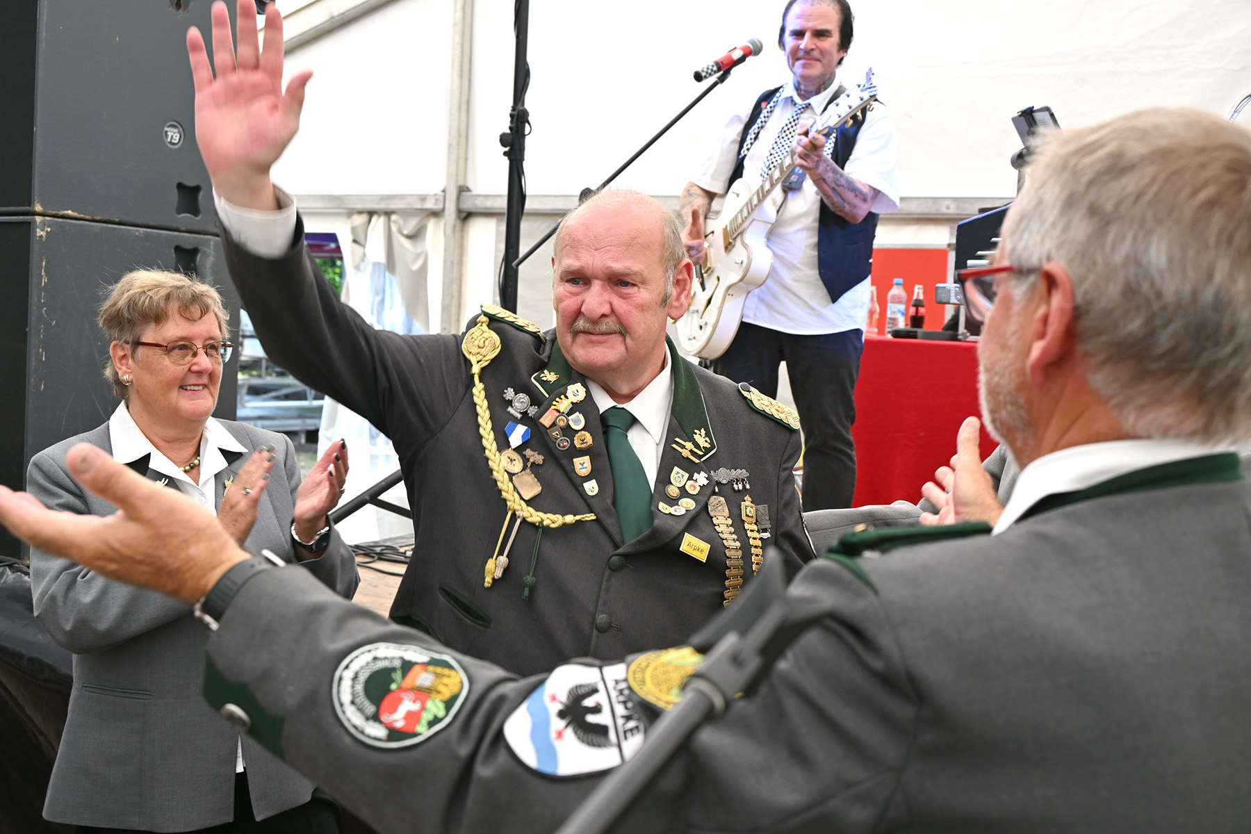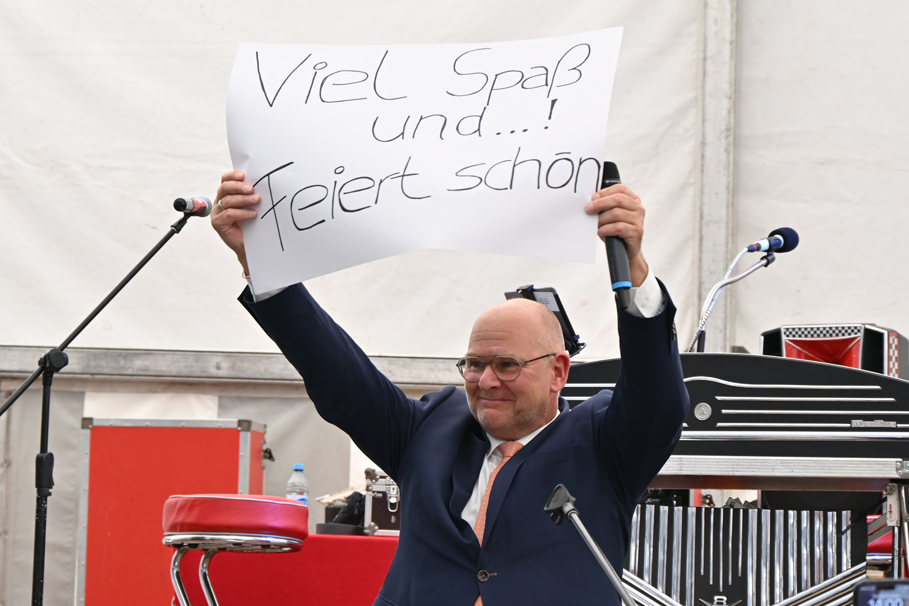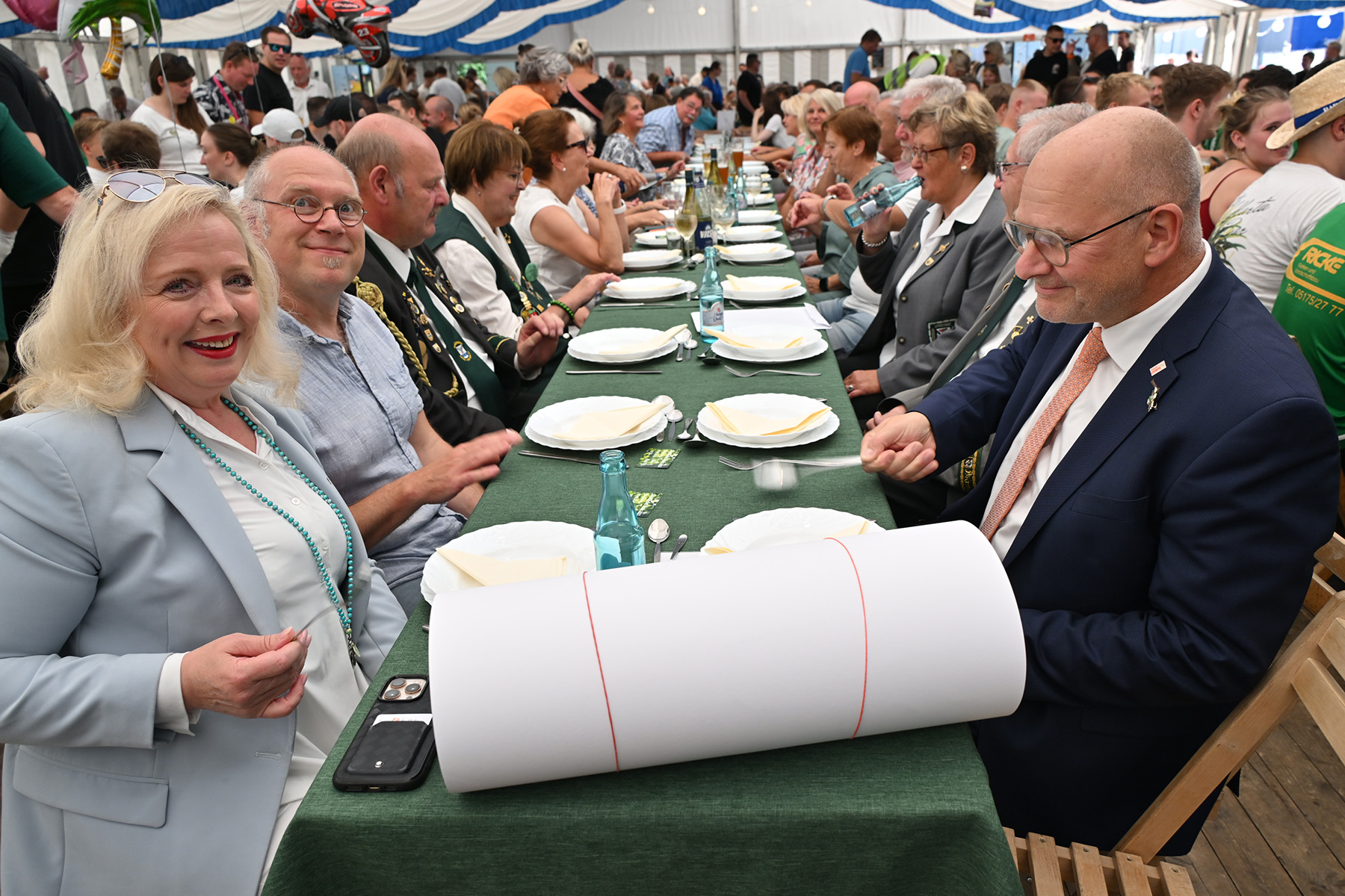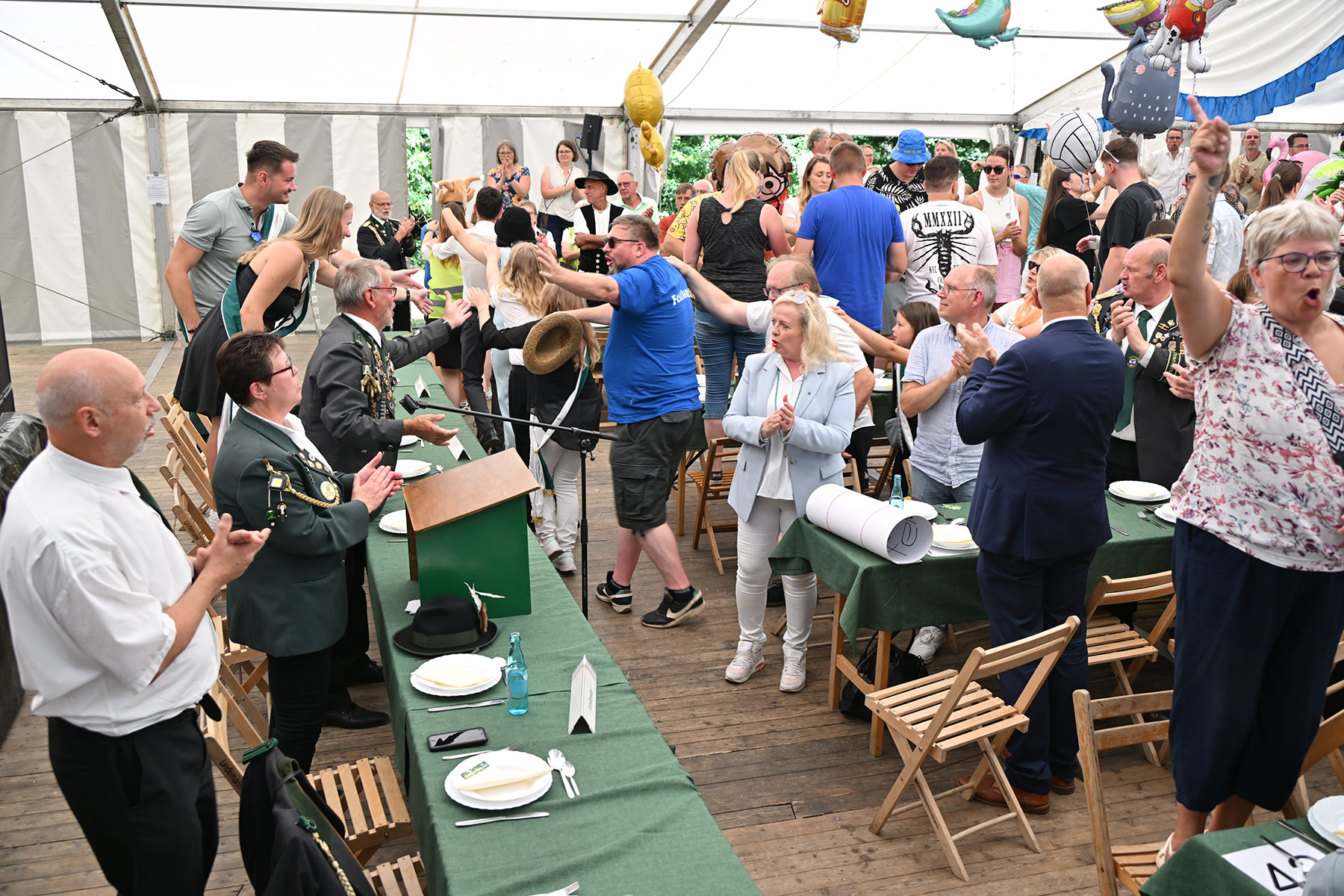 Unter den Gästen begrüßte Susanne Sieg unter anderem Lehrtes Bürgermeister Frank Prüße wie auch Ortsbürgermeister Klaus Schulz. Nach dem Applaus zu urteilen, hat der Ortsbürgermeister seinen Laden im Griff, während Prüße doch ein paar Buhrufe entgegenschallten, die er jedoch gekonnt retournierte. Seine angekündigte 25-minütige Rede mit PowerPoint-Präsentation fiel dann unverhofft sehr kurz aus. Statt Worten ließ er große beschriftete Zettel für sich sprechen. Er wie auch Ortsbürgermeister Klaus Schulz sprachen dem Schützenverein und den vielen Helfern, die das Fest auf die Beine gestellt haben, ihren ganz besonderen Dank aus.