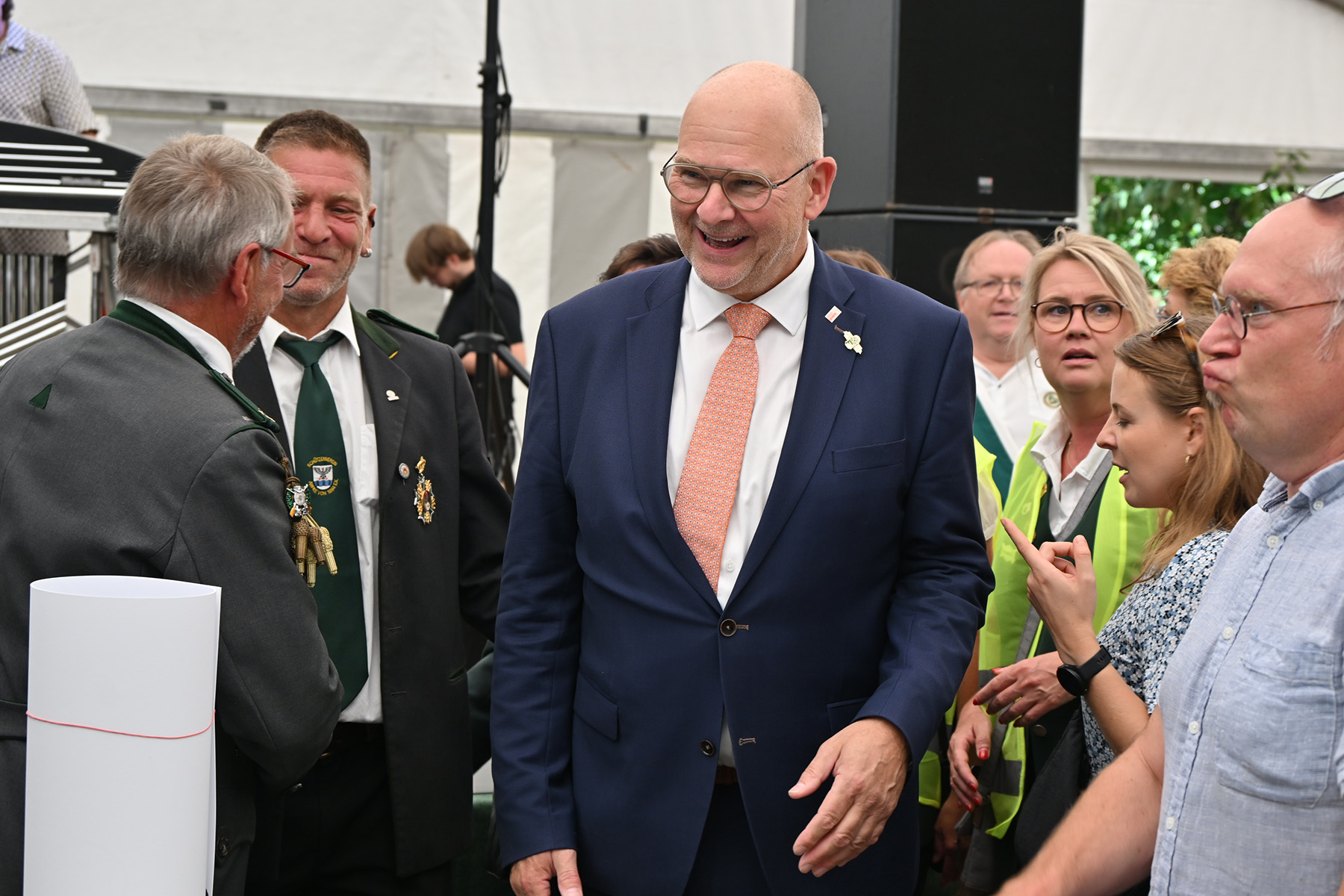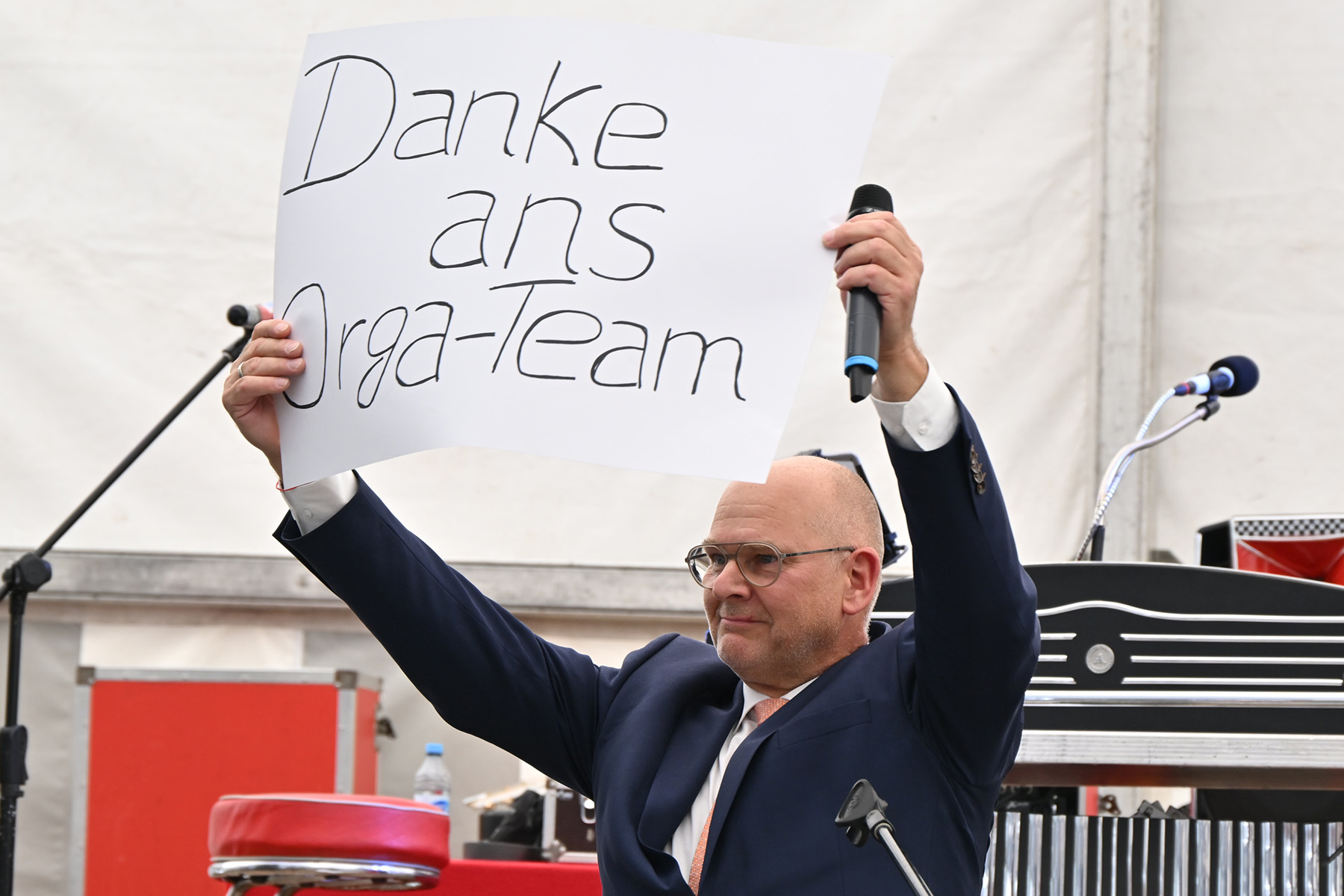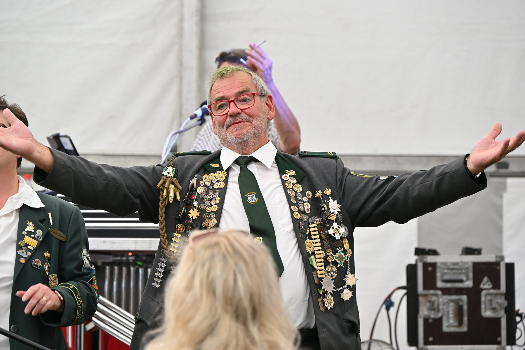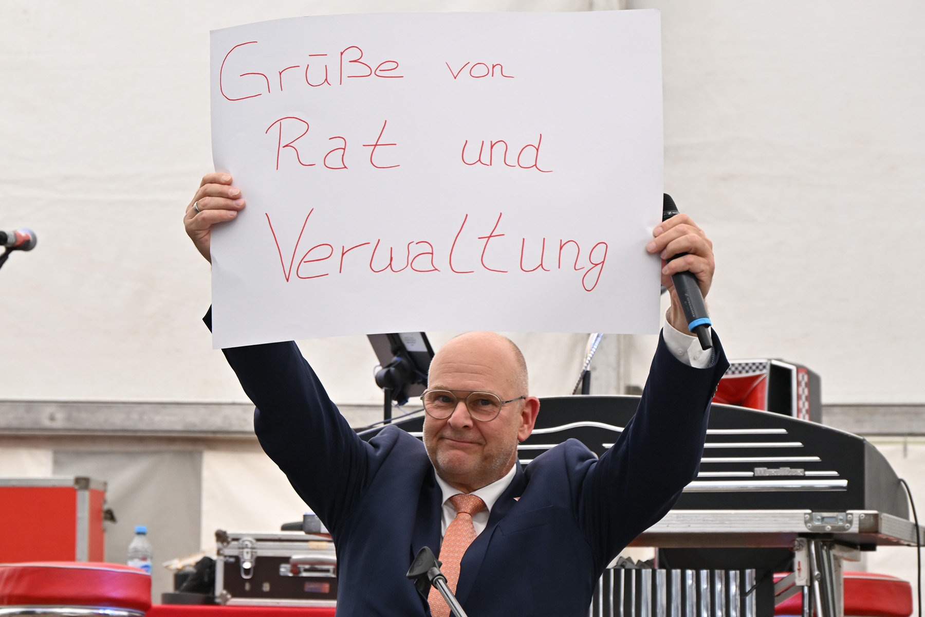 Unter den Gästen begrüßte Susanne Sieg unter anderem Lehrtes Bürgermeister Frank Prüße wie auch Ortsbürgermeister Klaus Schulz. Nach dem Applaus zu urteilen, hat der Ortsbürgermeister seinen Laden im Griff, während Prüße doch ein paar Buhrufe entgegenschallten, die er jedoch gekonnt retournierte. Seine angekündigte 25-minütige Rede mit PowerPoint-Präsentation fiel dann unverhofft sehr kurz aus. Statt Worten ließ er große beschriftete Zettel für sich sprechen. Er wie auch Ortsbürgermeister Klaus Schulz sprachen dem Schützenverein und den vielen Helfern, die das Fest auf die Beine gestellt haben, ihren ganz besonderen Dank aus.