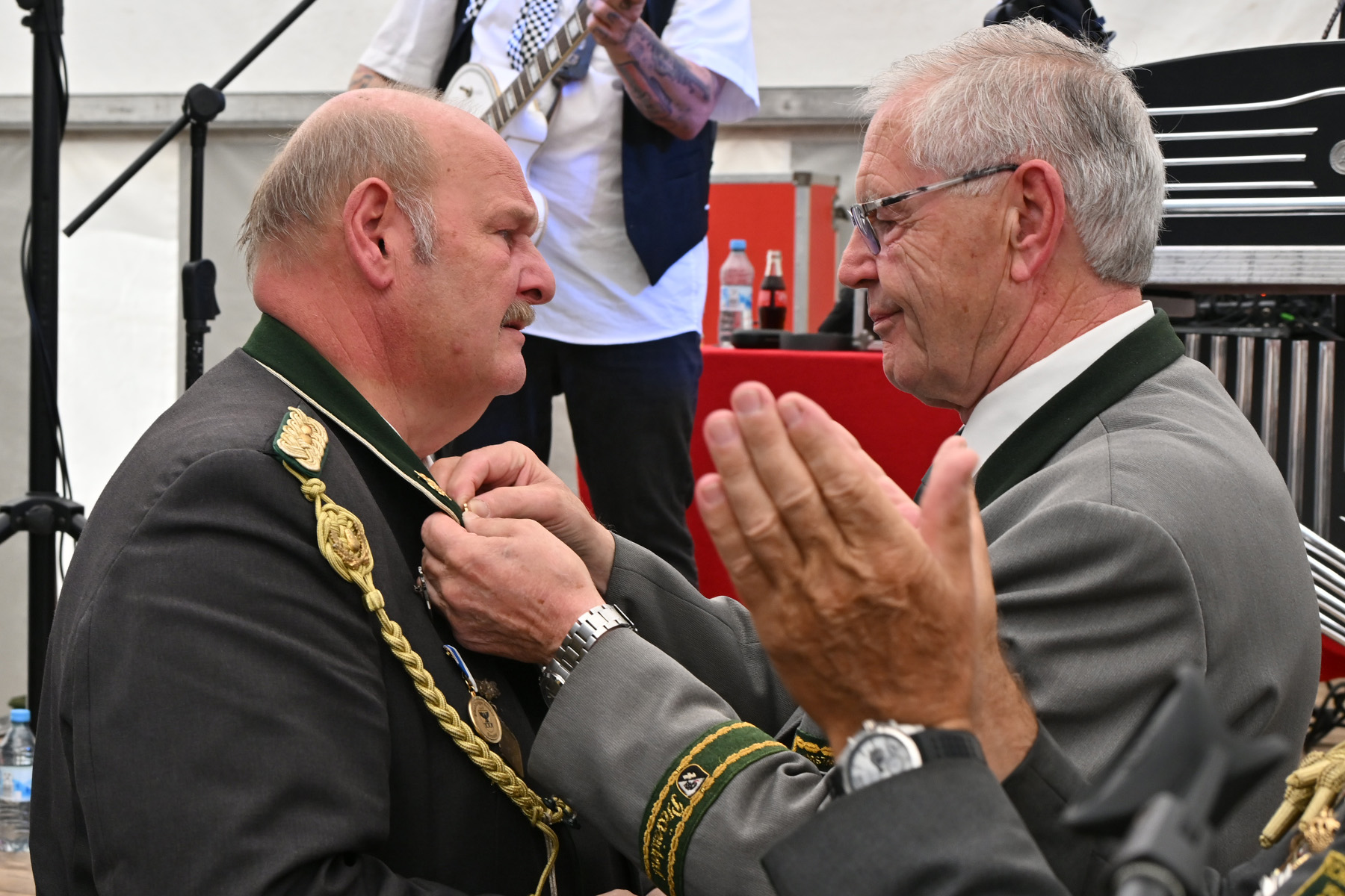 Das Festessen wurde auch wieder für besondere Ehrungen genutzt. In Abwesenheit wurde Schießsportleiter Nils Tuchtenhagen die Ehrennadel in Bronze des Niedersächsischen Sportschützenverbandes verliehen. Zudem hatte KSV-Präsident Werner Bösche eine sehr seltene Ehrung im Gepäck. Für seinen Einsatz um das Schützenwesen wurde dem ehemaligen Vorsitzenden des Schützenvereins Arpke und ehemaligen KSV-Vizepräsidenten Edmund „Eddi“ Potratz die Ehrennadel in Gold mit Eichenkranz verliehen. Dieser konnte seine Tränen der Rührung nicht zurückhalten und wurde unter großem Applaus und „Eddi, Eddi, Eddi“-Rufen gefeiert. Potratz war viele Jahre KSV-Vizepräsident und 15 Jahre 1. Vorsitzender des Schützenvereins Arpke. Er durfte zur Feier des Tages auch noch mal seine Intonierung von „Anton aus Tirol“ zum Besten geben.