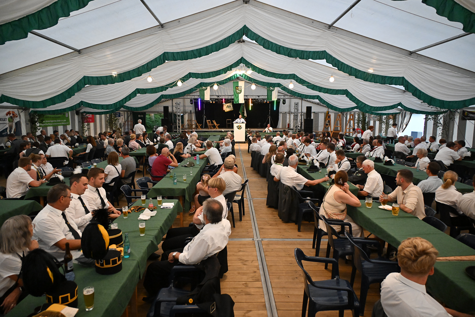 „Ich freue mich auf vier tolle Tage“, betonte Olaf Wolff, 1. Vorsitzender des Bürgerschützenvereins (BSV), mehrfach beim Festkommers vor rund 250 Gästen im Festzelt auf dem Schützenplatz. „Der Große Zapfenstreich wird Gänsehaut pur“, betonte er – und sollte am Ende Recht behalten, als mehr als 500 Zuschauer im feierlichen Rahmen den 100. Geburtstag des BSV gebührend begingen.