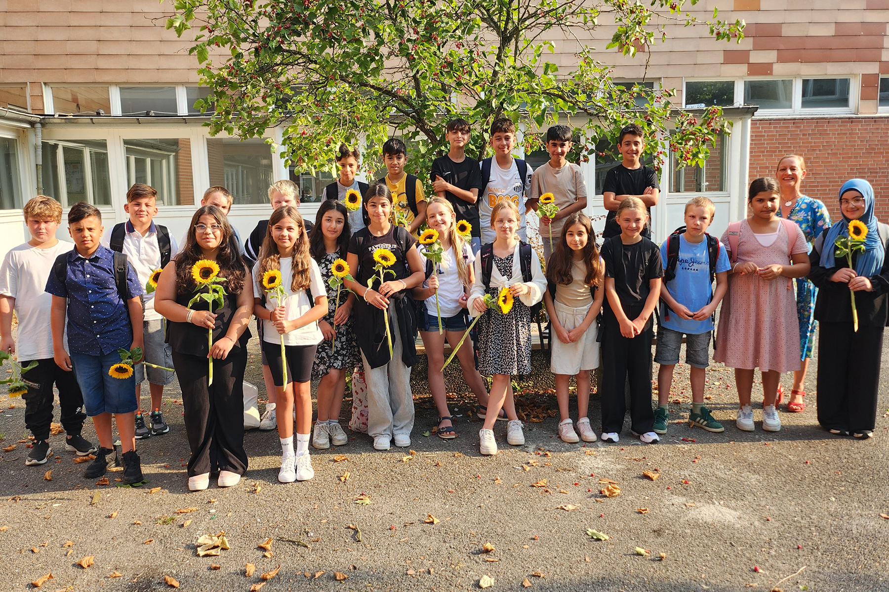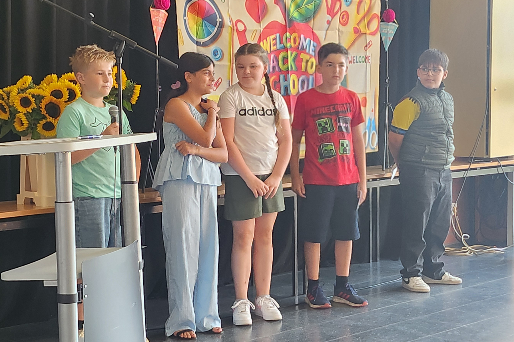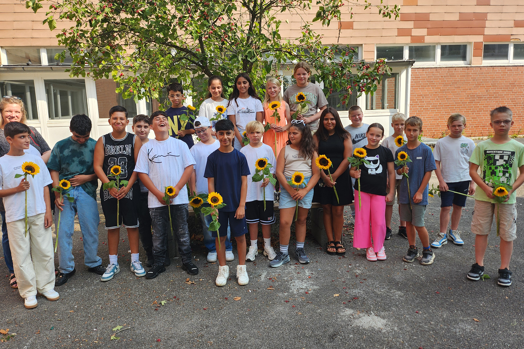 Das Rahmenprogramm gestalteten unter anderem die Schüler der Klasse 6c, die ein Willkommensgedicht vortrugen, um den Neuen die Angst zu nehmen und Freude auf die kommenden Jahre zu machen. Auch der Wahlpflichtkurs Theater sorgte mit einer musikalischen Begrüßung für gute Stimmung. Als kleine Aufmerksamkeit und passend zum warmen Spätsommerwetter erhielt jedes Kind eine Sonnenblume.