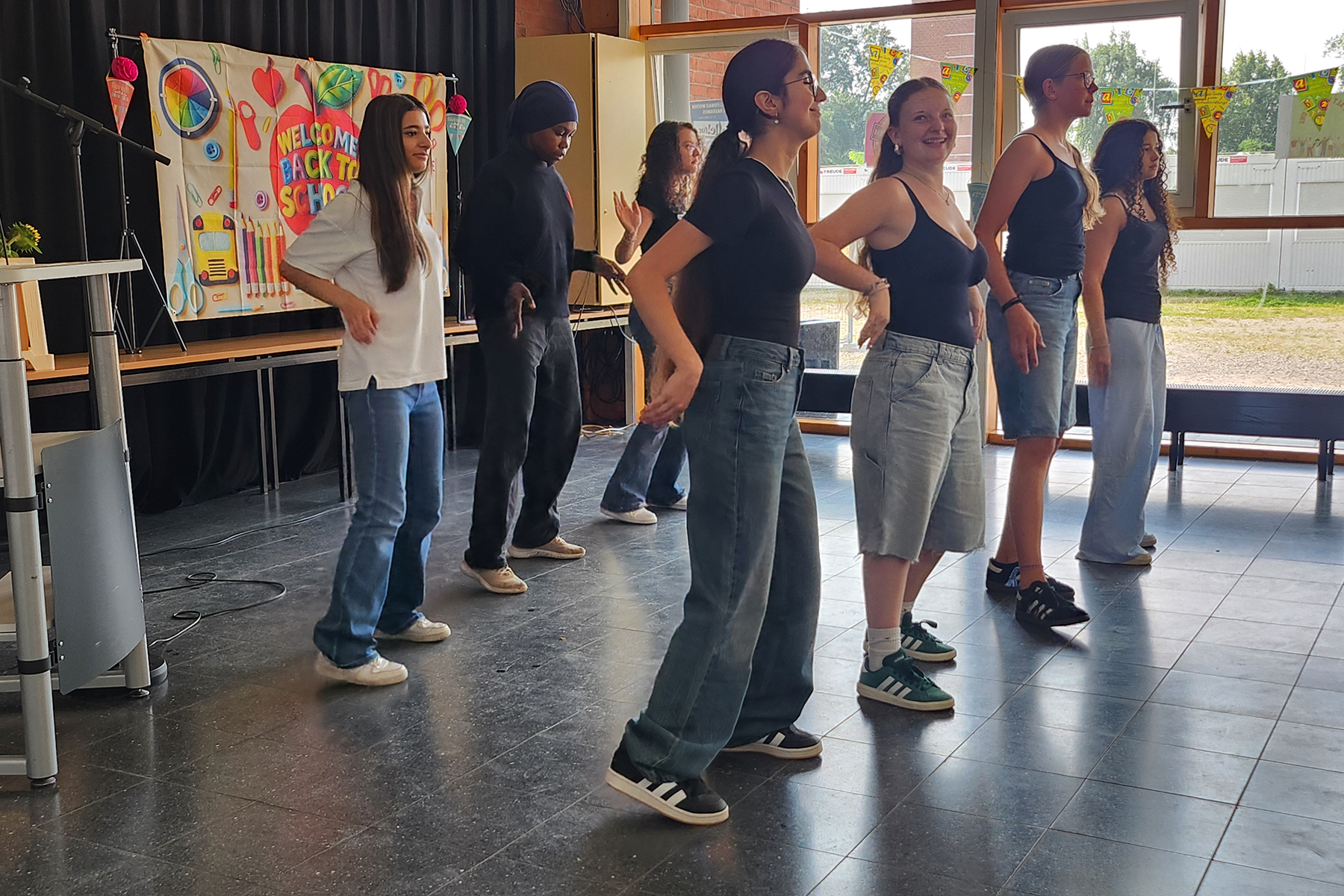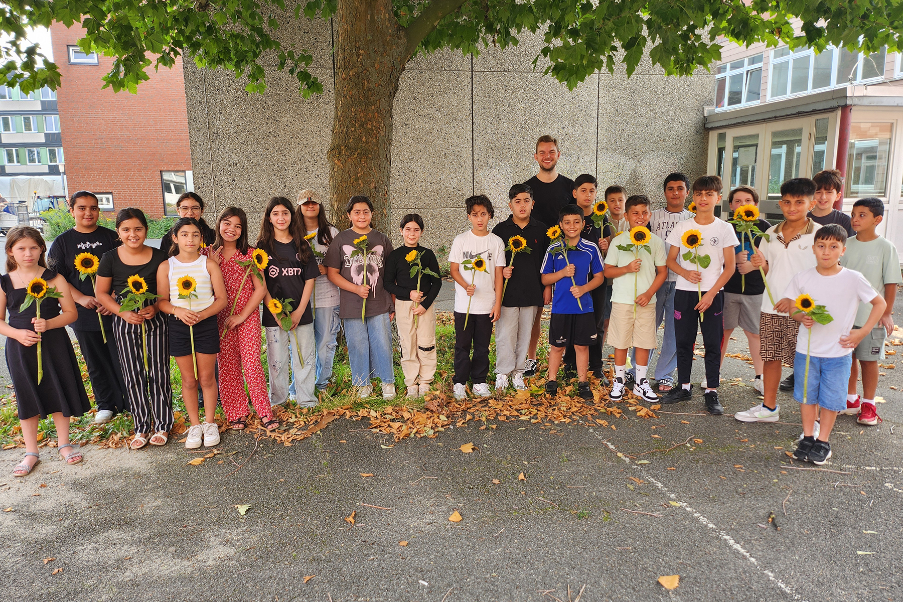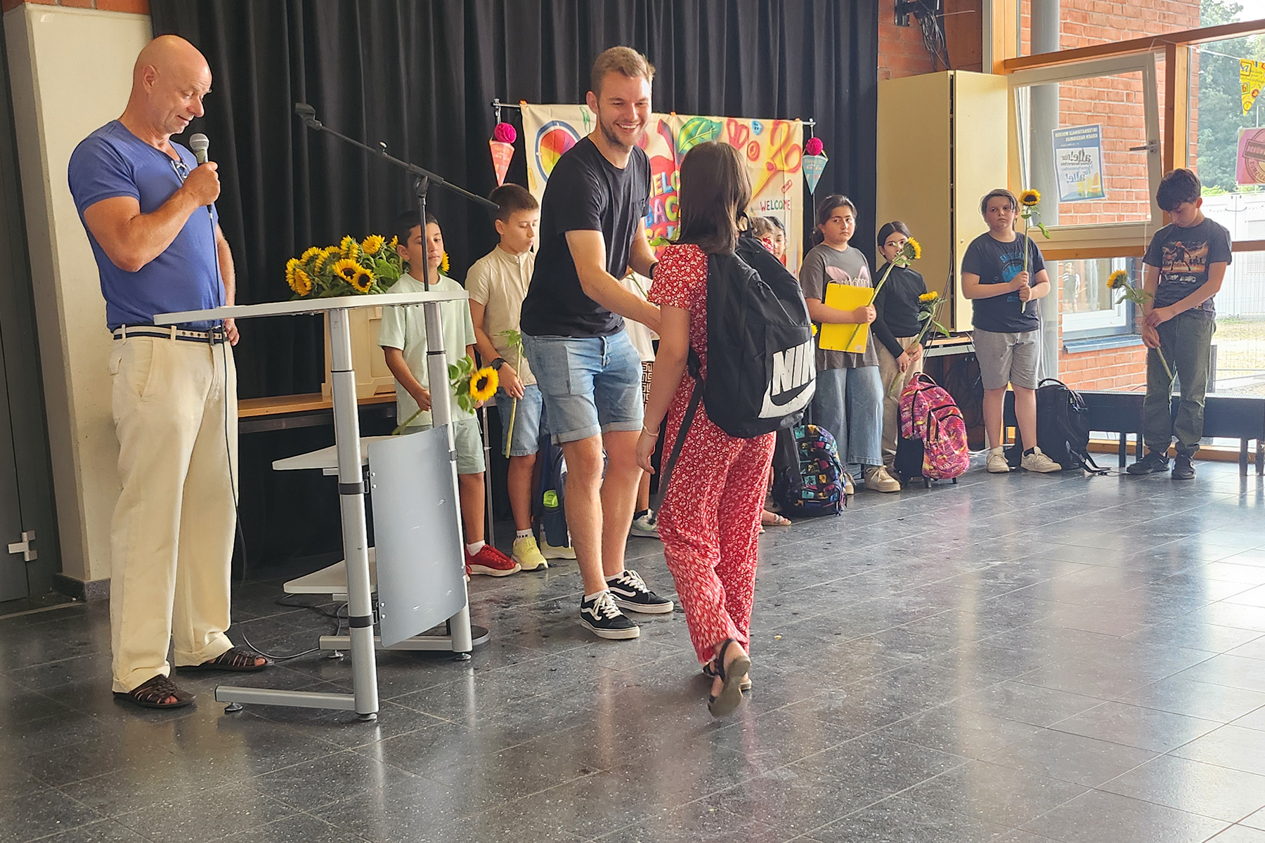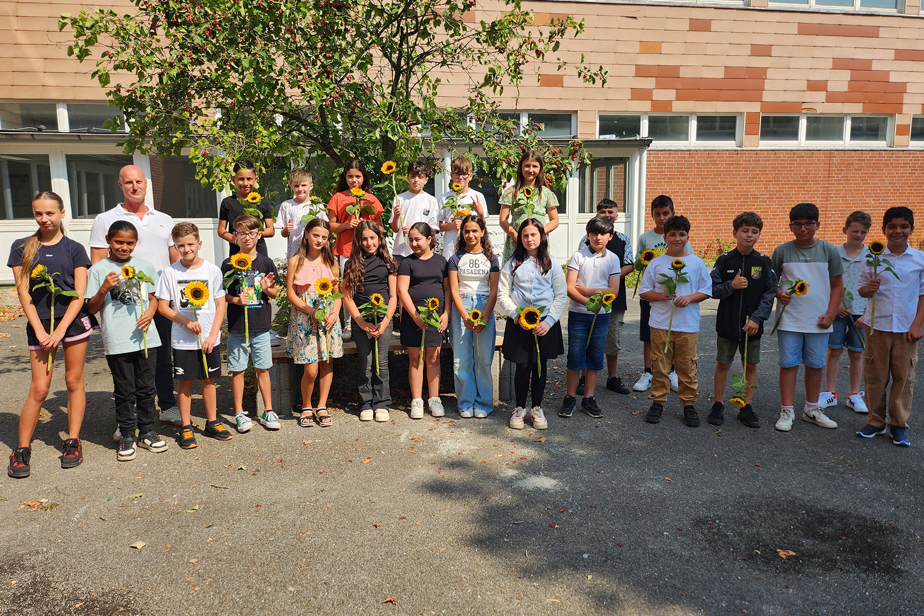 Das Rahmenprogramm gestalteten unter anderem die Schüler der Klasse 6c, die ein Willkommensgedicht vortrugen, um den Neuen die Angst zu nehmen und Freude auf die kommenden Jahre zu machen. Auch der Wahlpflichtkurs Theater sorgte mit einer musikalischen Begrüßung für gute Stimmung. Als kleine Aufmerksamkeit und passend zum warmen Spätsommerwetter erhielt jedes Kind eine Sonnenblume.