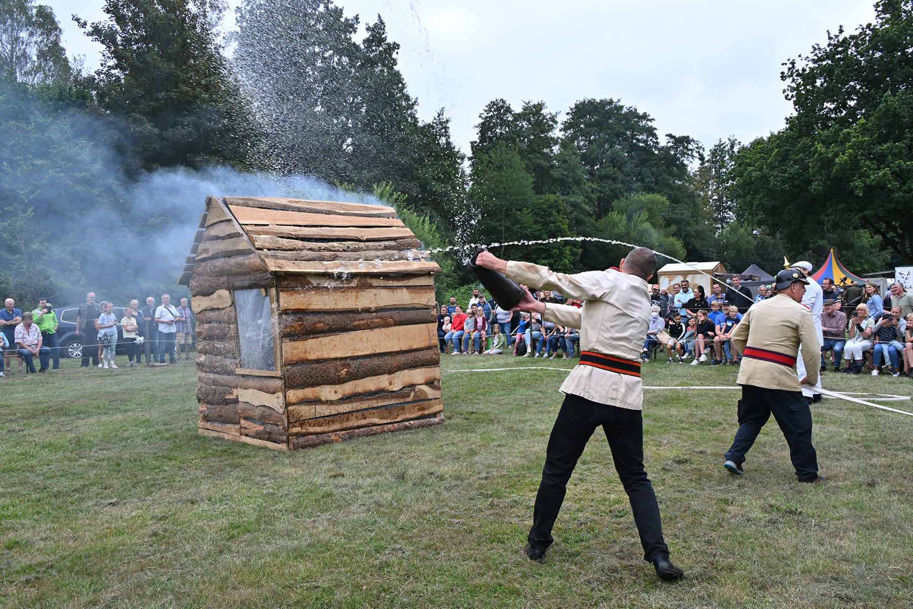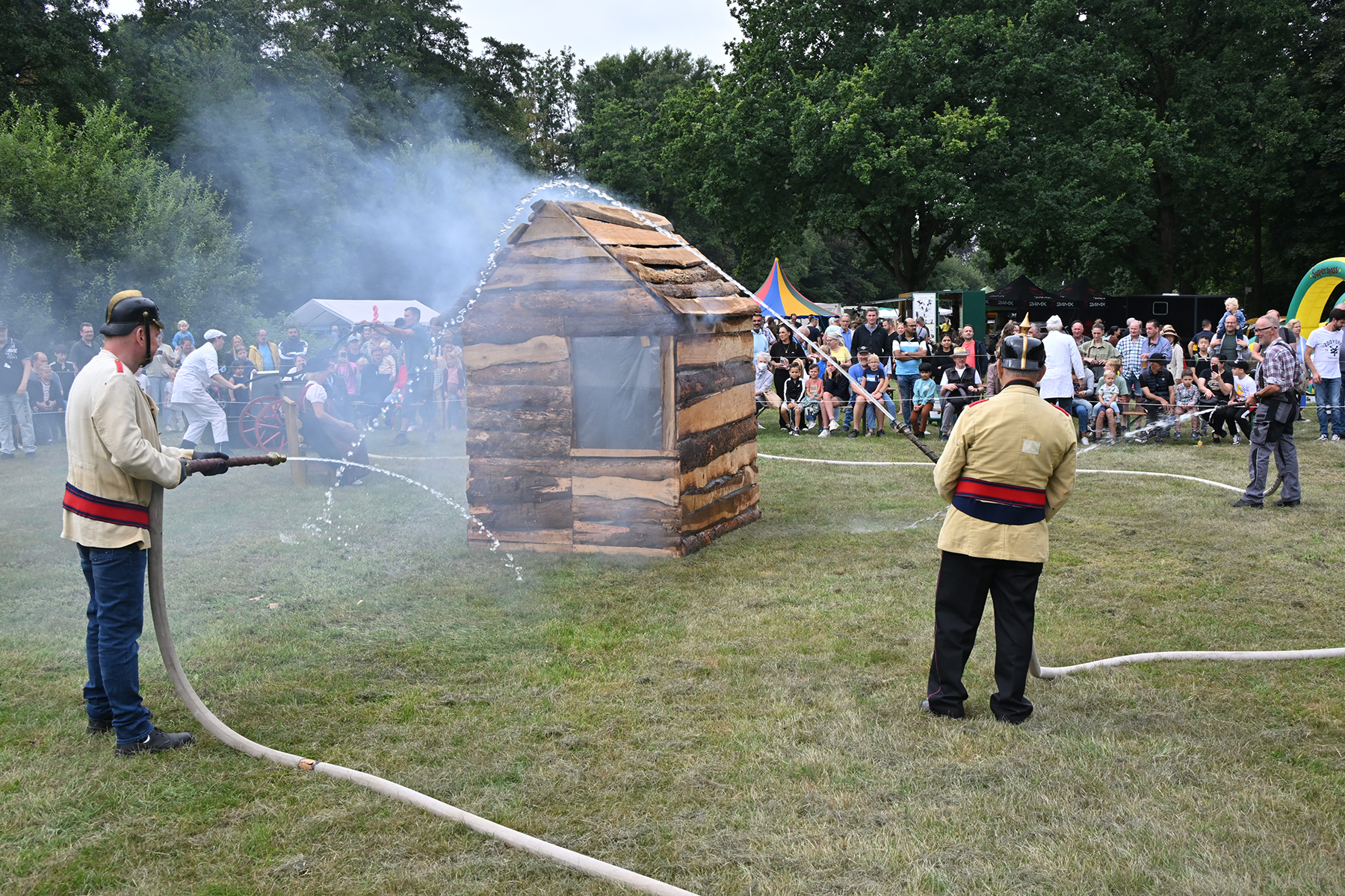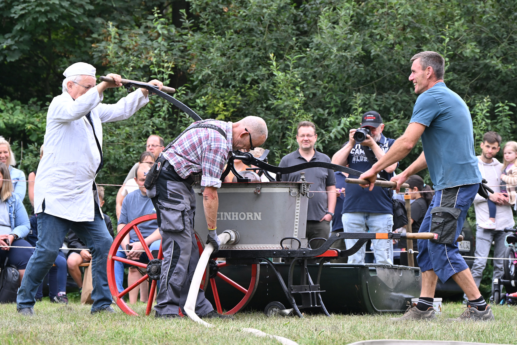 Schnell wurden die Handdruckspritzen herangeschafft: fünf besitzt der Historische Löschzug, drei davon kamen heute erneut zum Einsatz: die Handdruckspritze der Bürgerwehr Beinhorn-Heeßel aus dem Jahr 1882, aus Dachtmissen aus dem Jahr 1889 sowie die mit Pferden gezogene Spritze aus Ramlingen-Ehlershausen aus dem Jahr 1893.
