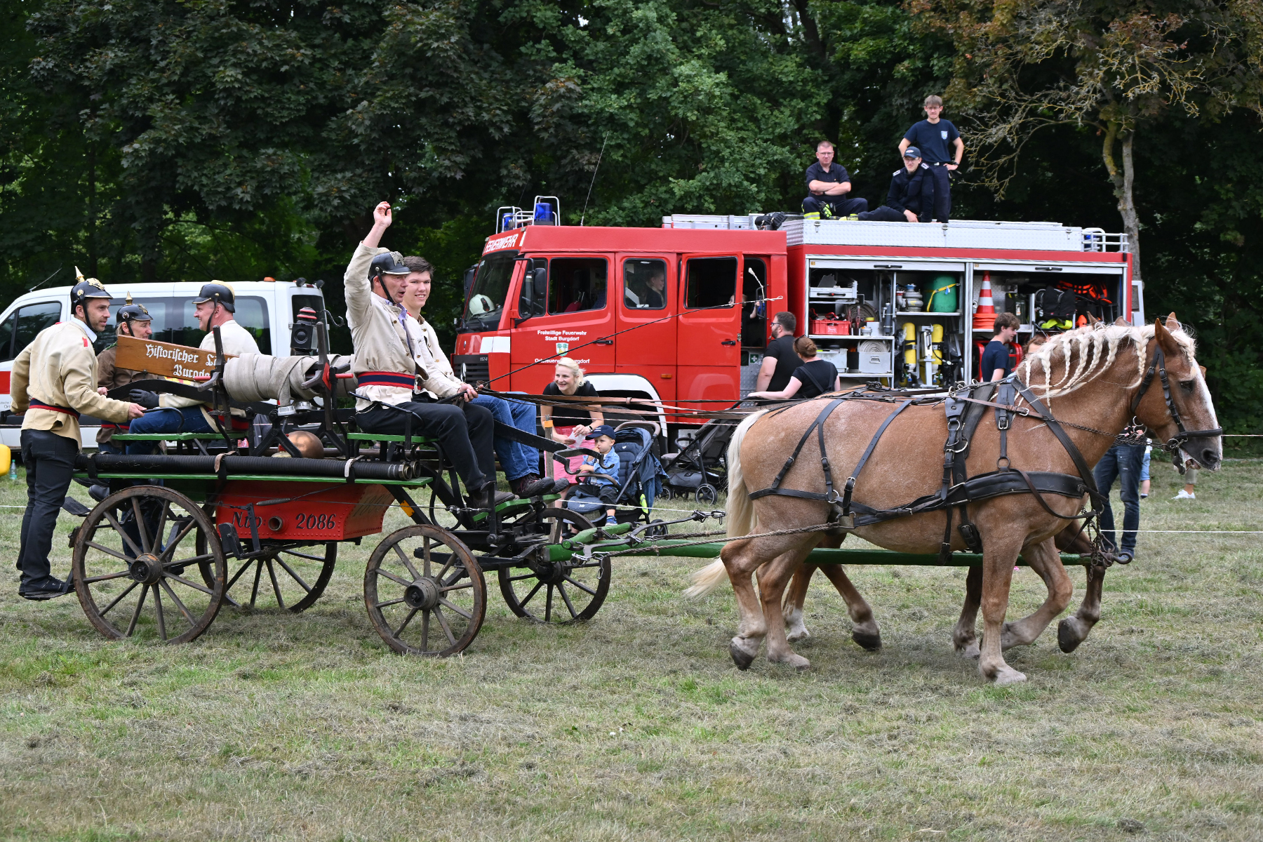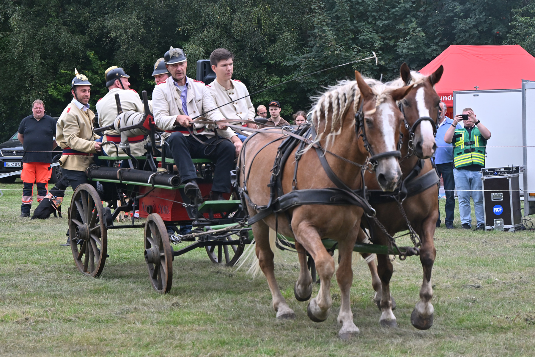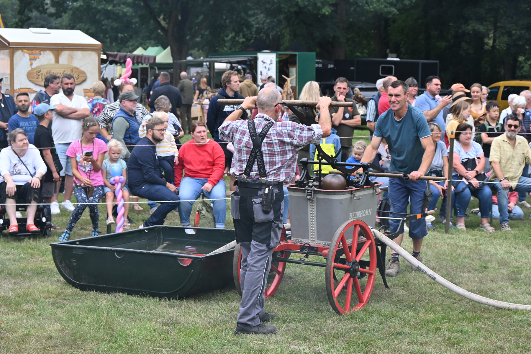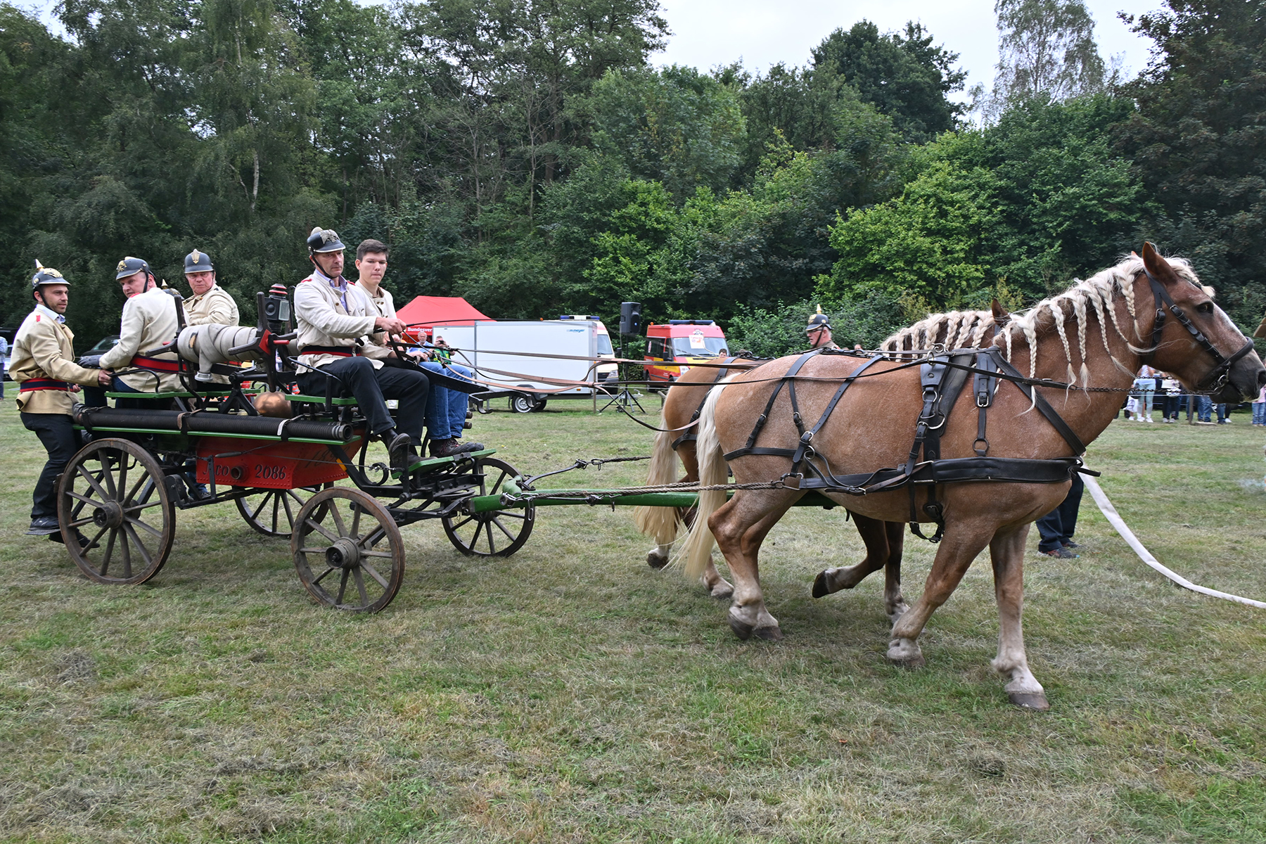 Schnell wurden die Handdruckspritzen herangeschafft: fünf besitzt der Historische Löschzug, drei davon kamen heute erneut zum Einsatz: die Handdruckspritze der Bürgerwehr Beinhorn-Heeßel aus dem Jahr 1882, aus Dachtmissen aus dem Jahr 1889 sowie die mit Pferden gezogene Spritze aus Ramlingen-Ehlershausen aus dem Jahr 1893.