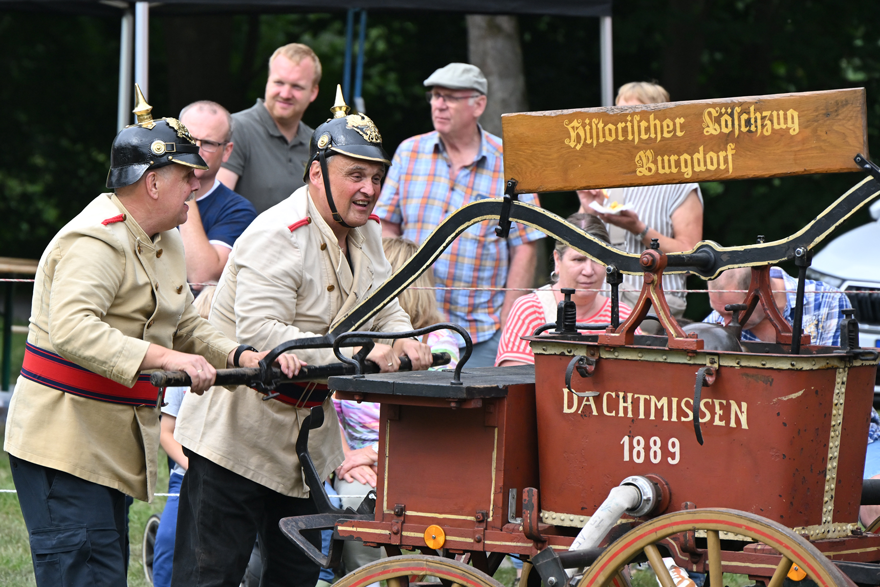 Die zahlreichen Zuschauer merkten schnell: Das Löschen eines Feuers war damals nicht so einfach und mit viel Muskelkraft verbunden. Mit großem Applaus wurden die historischen Feuerwehrkräfte entlassen. Wer mitmachen möchte, kann beim Historischen Löschzug gerne mitmachen. „Es sind keine Vorkenntnisse erforderlich“, so Jörg Neitzel. Weitere Informationen gibt es unter www.historischer-loeschzug-burgdorf.de.