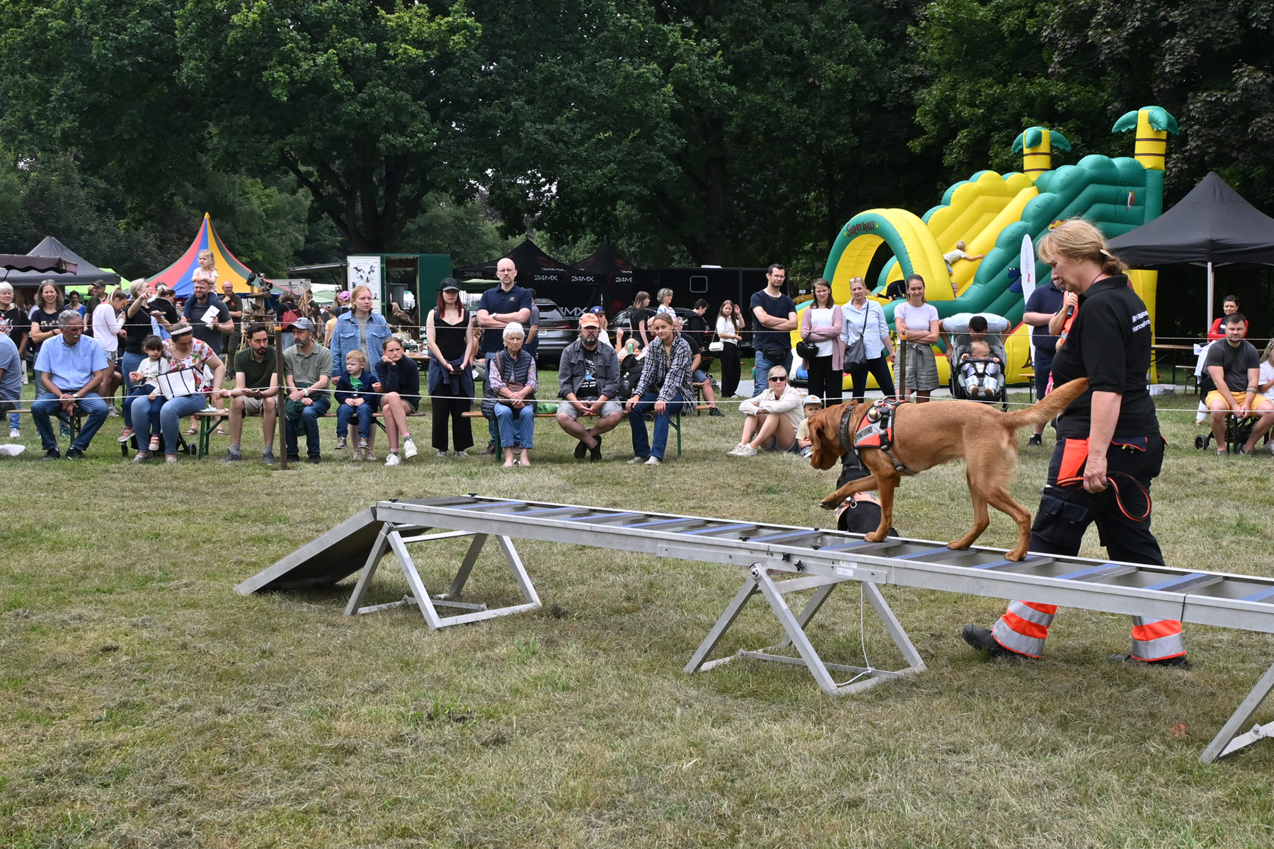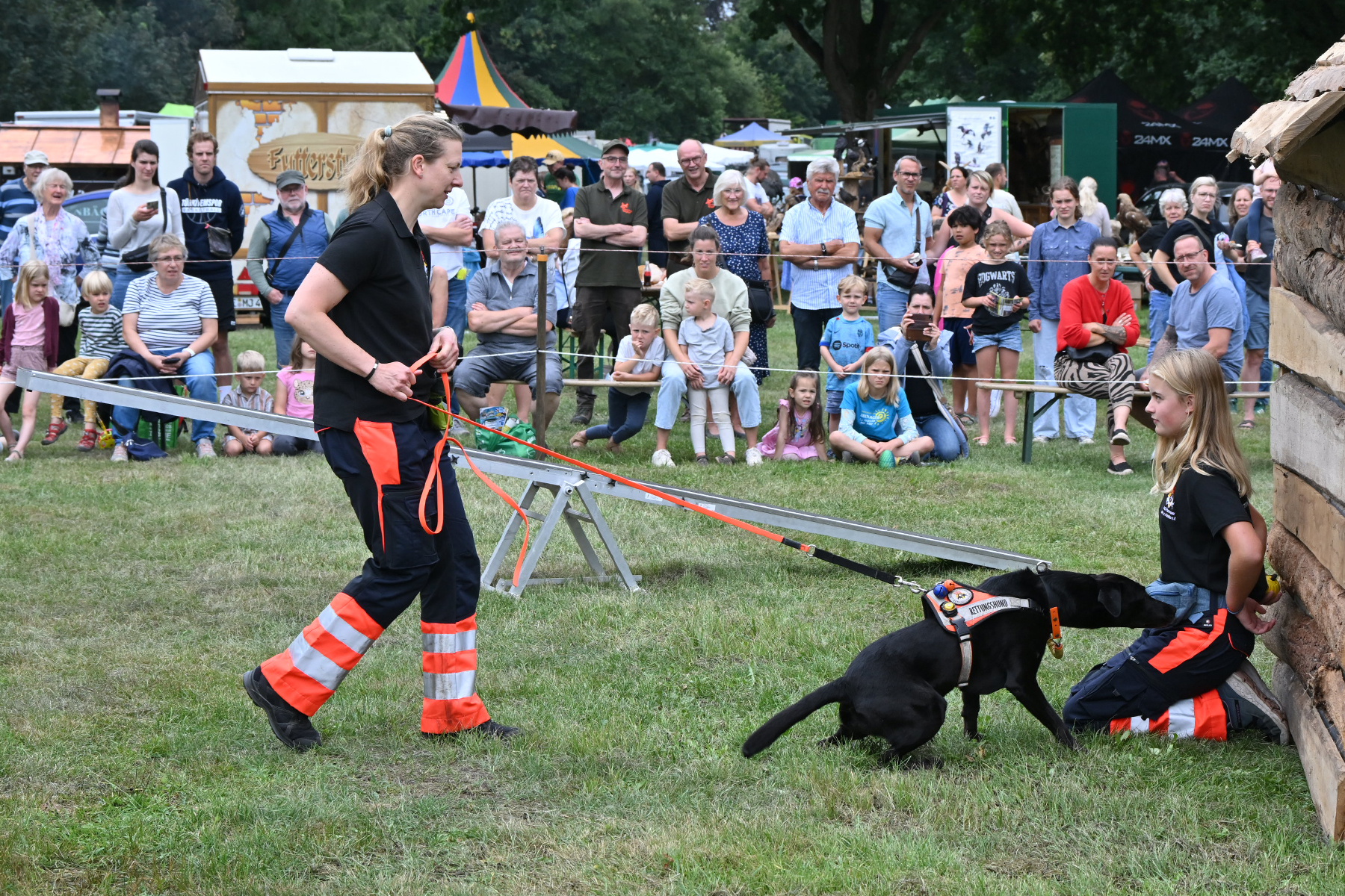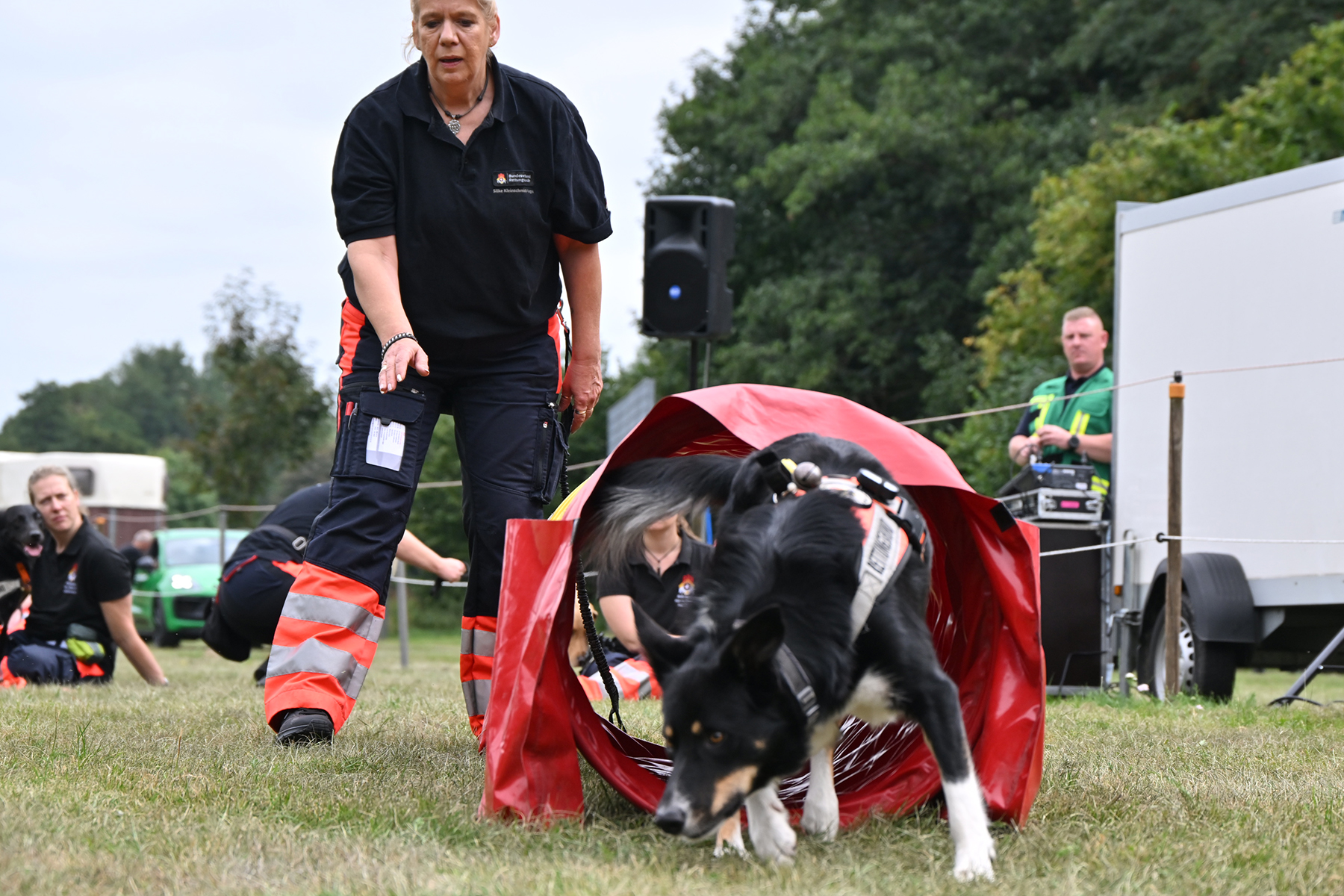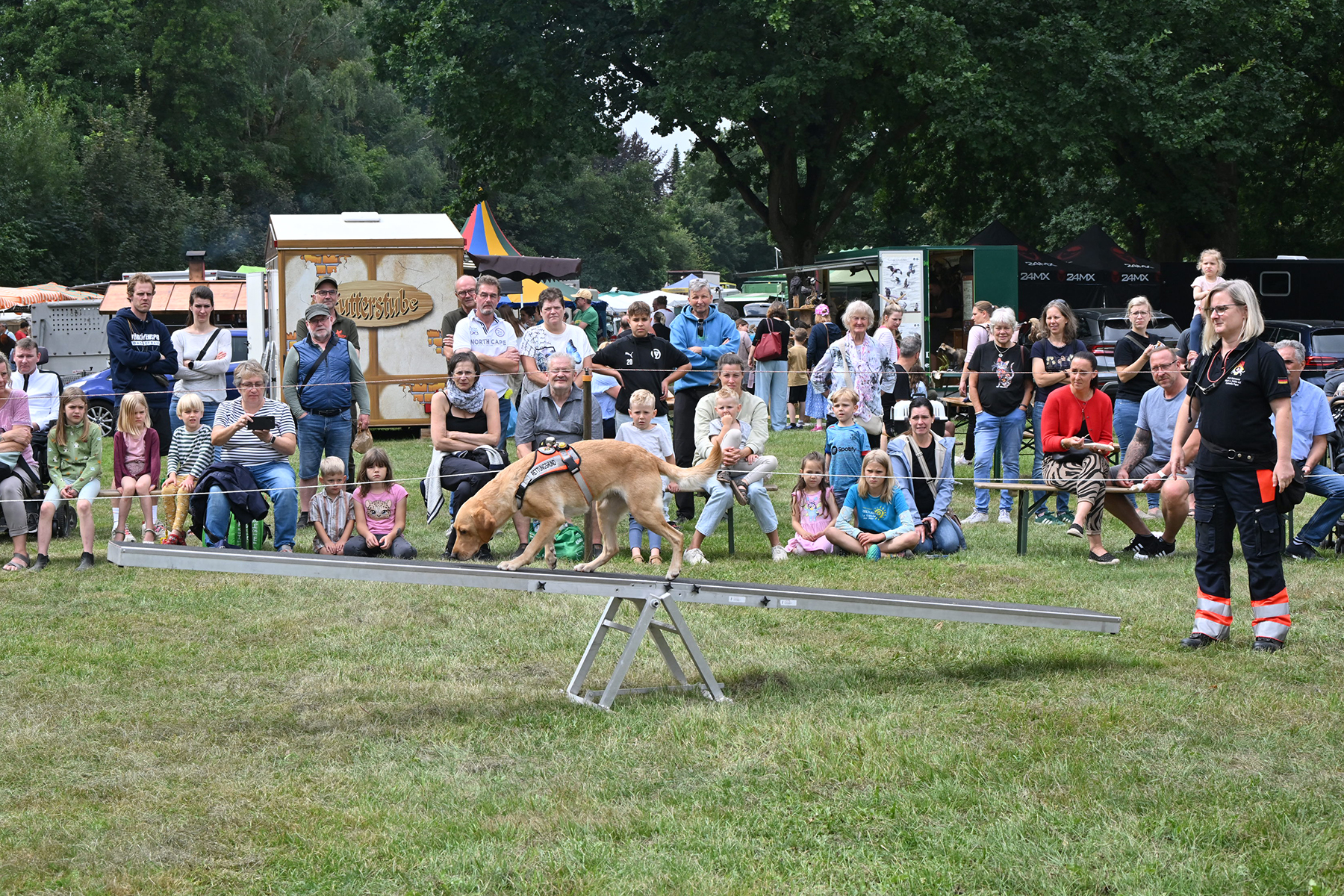 Viel Applaus erhielt auch die BRH Rettungshundestaffel Hannover, Harz und Heide. Benjamin Bartel brachte den Zuschauern die Arbeit der Rettungshunde und ihrer Führer näher. Es wurden verschiedene Anzeigetechniken und ihre Vor- und Nachteile erklärt. Auch wenn die Rettungshunde eher in der Fläche arbeiten „und alles anzeigen, was ein Mensch ist“, so wurde auch die Suche von Personen in einem Gebäude vorgeführt. “Die Hunde müssen auch Hilfsmittel benutzen können, wie eine Leiter”, erklärte Benjamin Bartel. “Sie kennen es sicherlich selbst: die Füße sehen wir noch, aber bei einem Hund ist das anders – er sieht seine Hinterläufe nicht”, erklärte er. Sichtlich beeindruckt und mit vielen neuen Informationen quittierten die Zuschauer die rund 20-minütige Aufführung mit viel Applaus.