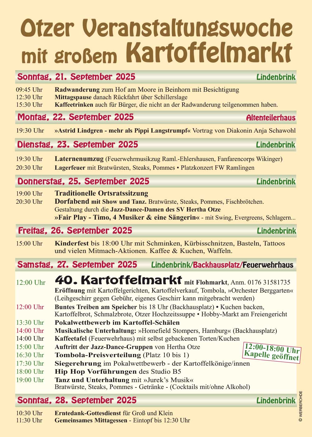 Der Bürgerverein „Otzer Vereine & Verbände“ veranstaltet vom 21. bis 28. September 2025 seine traditionelle Otzer Woche. Der Vorsitzende Hans Jörg Fischer kann auf etwa 150 helfende Aktive zurückgreifen und hat somit wieder ein Dorffest nach bewährter Weise vorbereitet. Dazu sind jung und alt eingeladen. Die Besucher kommen jedes Jahr auch aus dem weiten Umfeld, um die Aktionen der rein ehrenamtlich arbeitenden Otzer zu erleben.