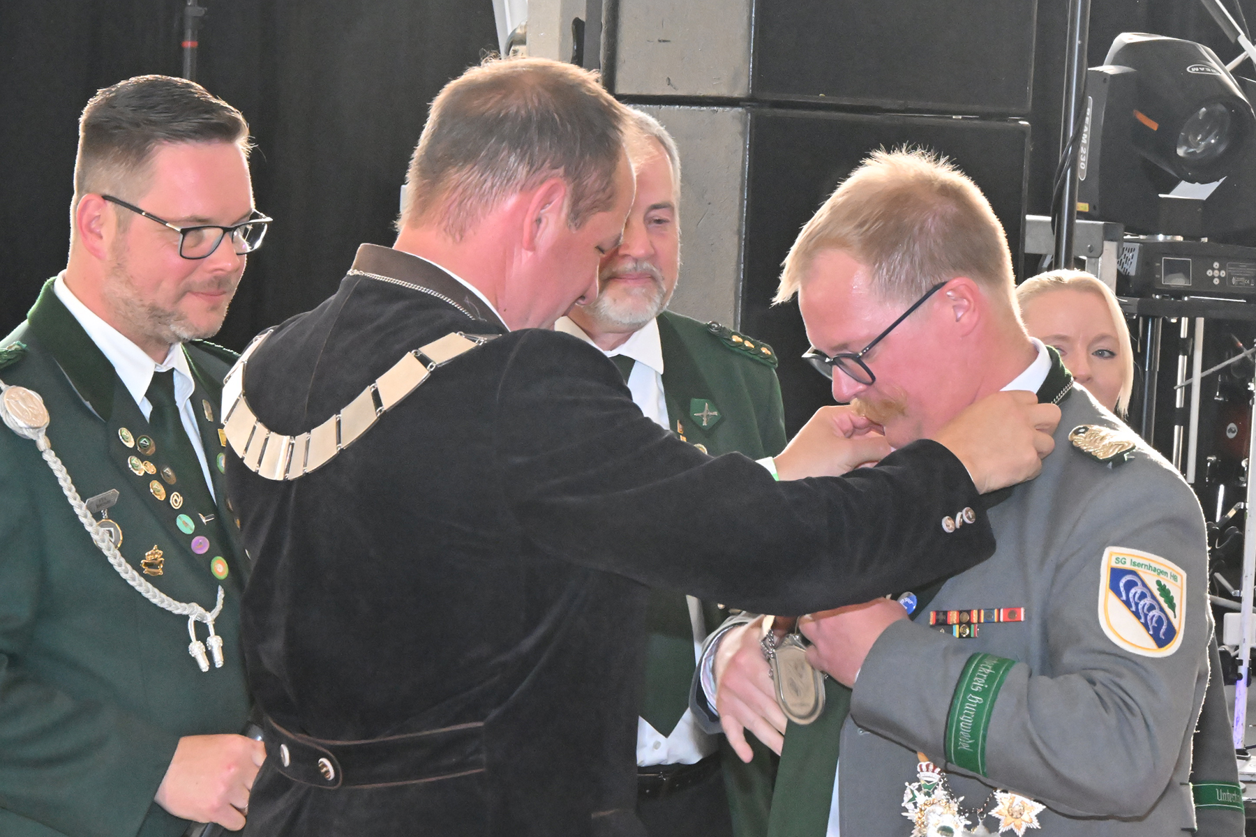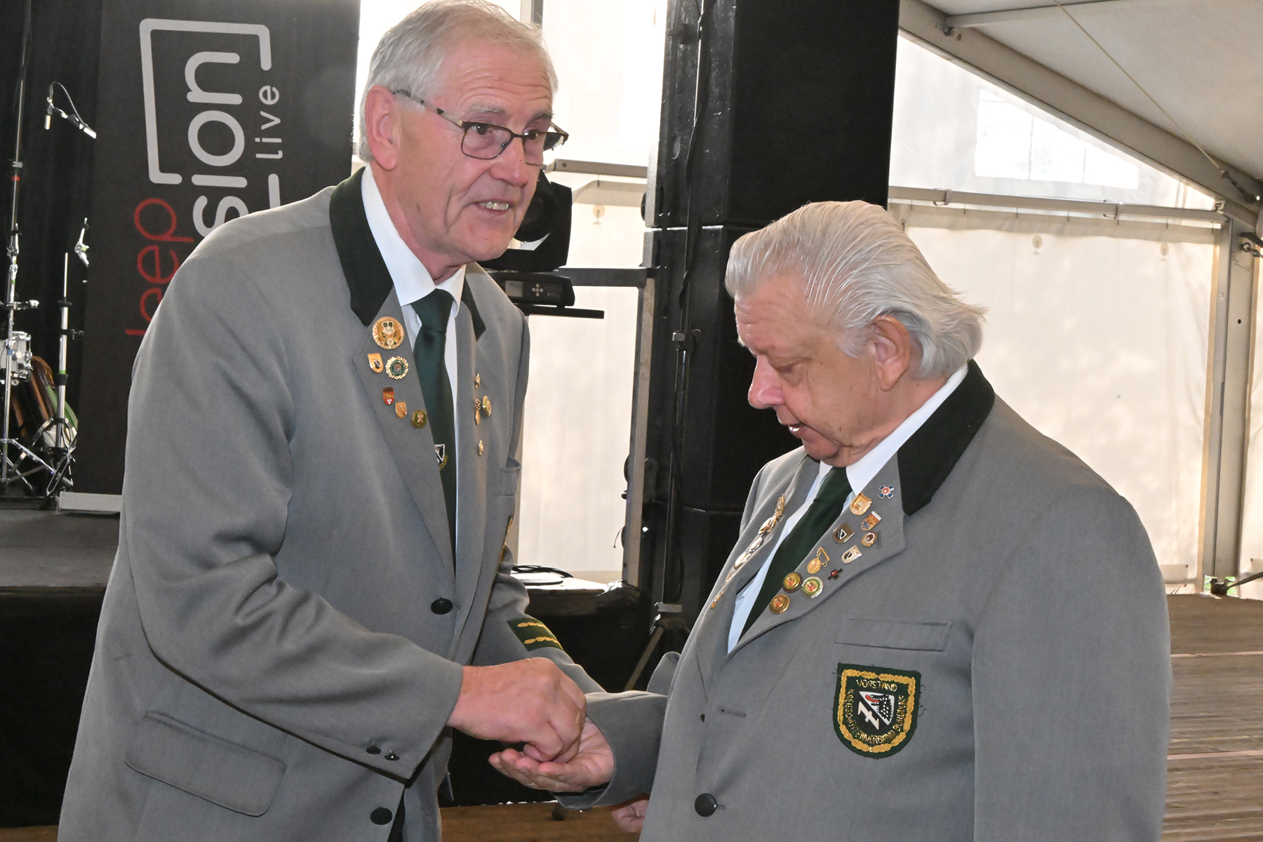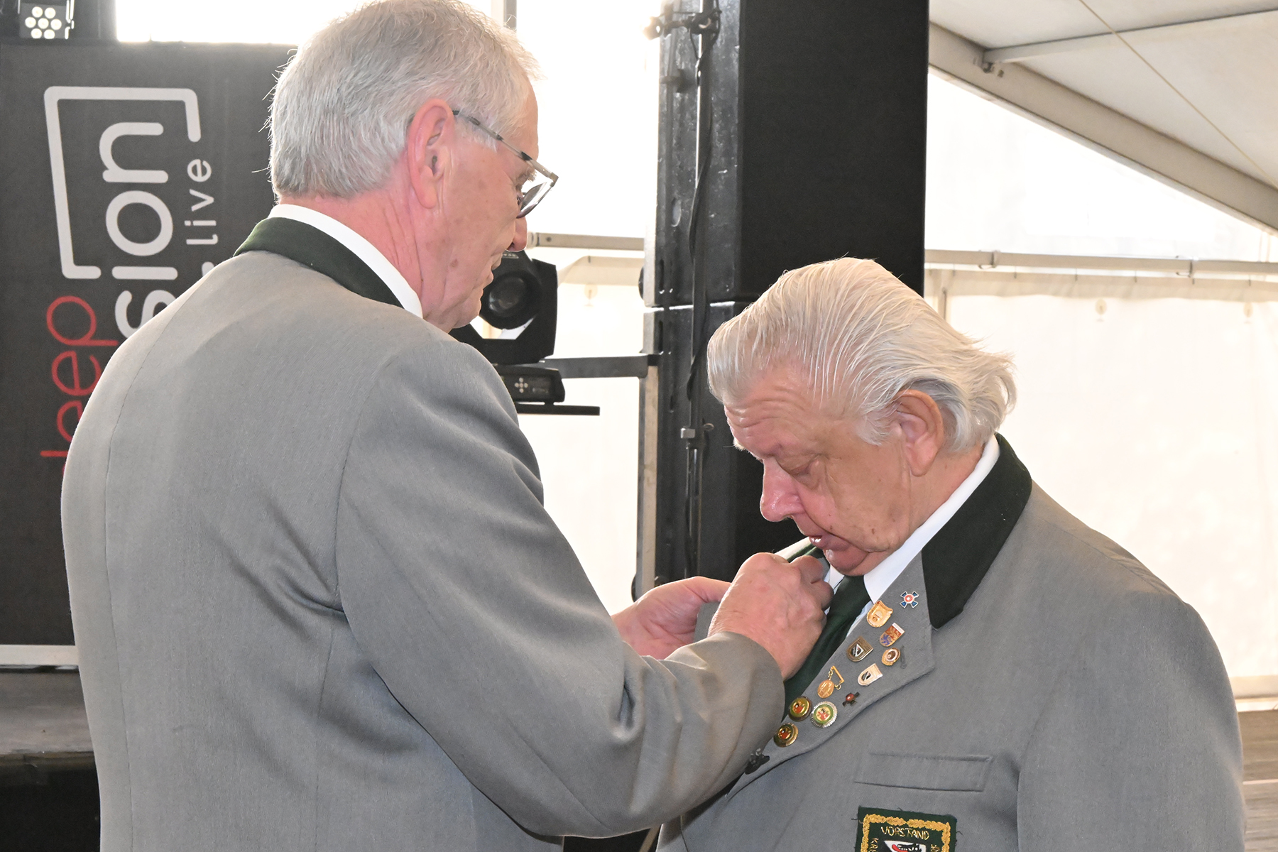 „Gemeinsamkeit, Tradition – ein Dorf“, fasste Werner Bösche, Präsident des Kreisschützenverbandes (KSV) Burgdorf, den Geist der Veranstaltung zusammen. Er hatte zwei besondere Ehrungen mitgebracht: Für seinen langjährigen Einsatz im Schützenwesen, insbesondere als Sprecher der Isernhagener Schützenvereine, erhielt Herbert Eggert die Ehrennadel in Gold mit Eichenkranz – die höchste Auszeichnung des KSV. Er wurde dafür mit stehendem Applaus bedacht. Für seine Verdienste um das Schützenwesen, insbesondere für die jahrelange Berichterstattung, wurde Bastian Kroll, Herausgeber des AltkreisBlitz, mit der Ehrennadel in Gold des Regionsfachverbands Schießsport ausgezeichnet.