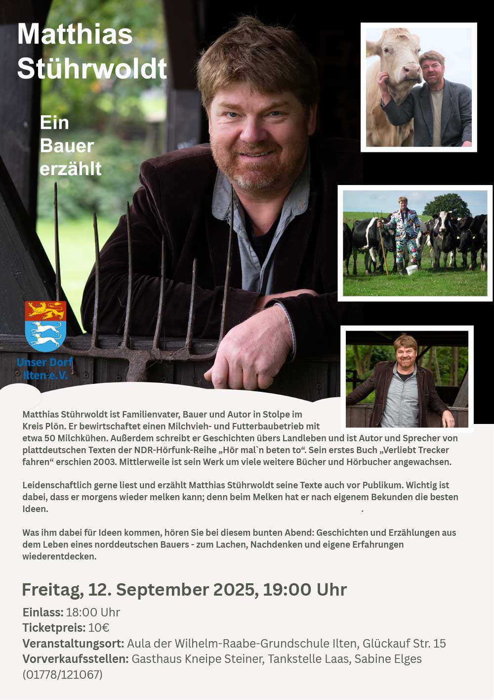 Eine besondere kulturelle Bereicherung erwartet Ilten im September: Am Freitag, 12. September 2025, um 19 Uhr gastiert Matthias Stührwoldt in der Aula der Wilhelm-Raabe-Schule, Glückaufstraße 1 in Ilten. Der Verein „Unser Dorf Ilten“ lädt zu diesem Abend ein, der ganz im Zeichen humorvoller, nachdenklicher und authentischer Geschichten vom Landleben steht.