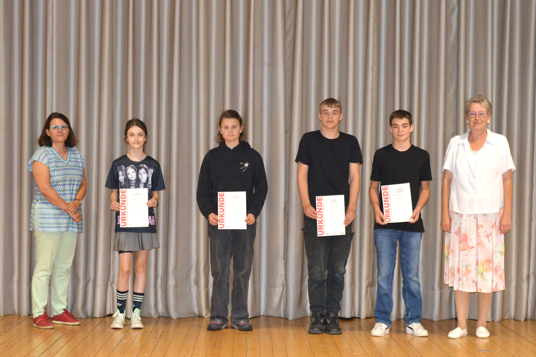 Für den Beitrag „Die innerdeutsche Grenze zur DDR“ wurden Simon Blank, Anna Bosche, Maria Bühring, Finn Kaufmann, Leni Bölscher und Lisa-Marie Gramann mit einem Förderpreis ausgezeichnet, der mit 200 Euro dotiert ist. Die Schülerinnen und Schüler aus den Jahrgängen 5, 6 und 7 wollten im Rahmen der Geschichts-AG „Lebendige Vergangenheit“ herausfinden, warum es die innerdeutsche Grenze gab, wie sie aussah und ob diese Grenze überwunden werden konnte. Dazu recherchierten sie, befragten einen Zeitzeugen und setzten die Ergebnisse in einem Film um. „Insgesamt haben wir während unserer Arbeit zum Geschichtswettbewerb viel gelernt: Wir wissen jetzt viel mehr über die innerdeutsche Grenze und das Leben in der DDR. Auch haben wir methodisch und technisch dazugelernt“, berichten die Preisträger. Sie freuen sich schon sehr auf die Landespreisverleihung im Niedersächsischen Landtag am 23. September 2025, zu der sie eingeladen sind.