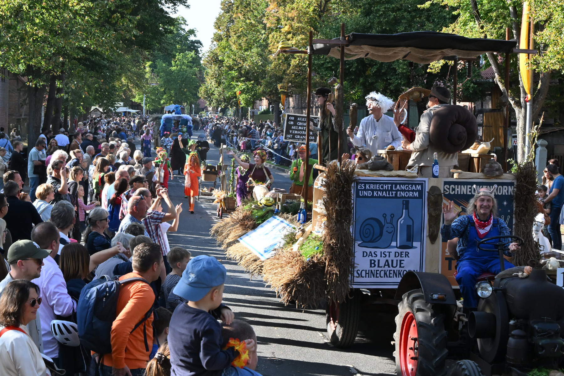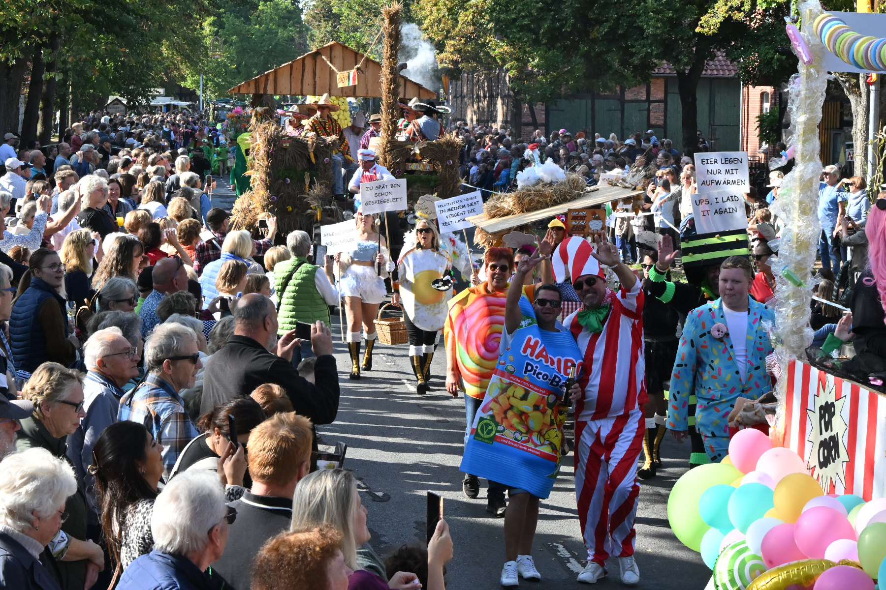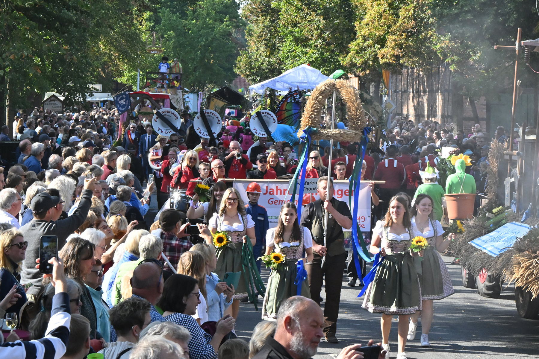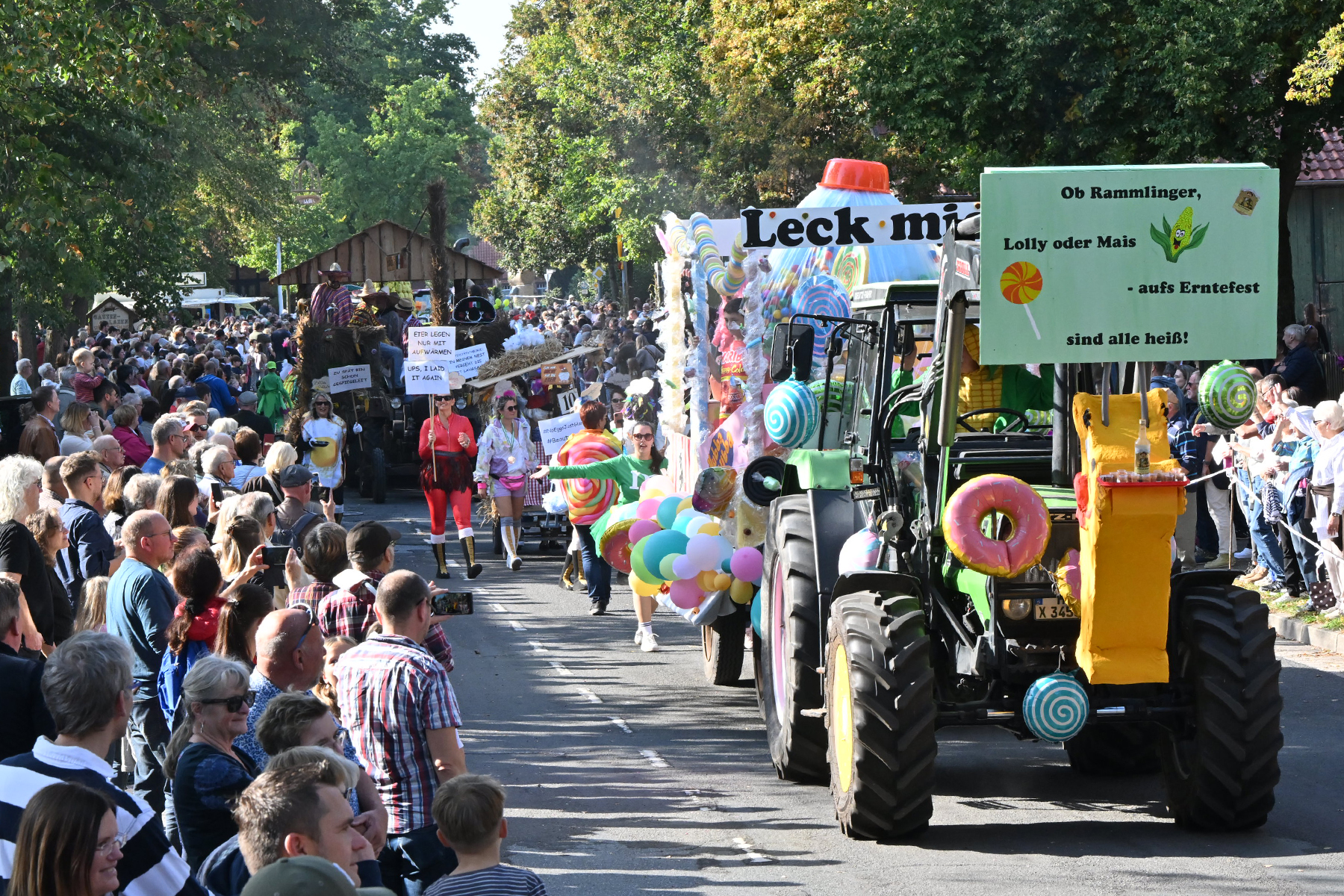 Anschließend setzte sich der Festumzug, angeführt von der Erntekrone, getragen von Dominik Schlumbohm und begleitet von den sechs Kronengirls, auf die zweifache Runde durch den Ort. Die Zuschauer jubelten den Umzugsteilnehmern zu, und für die jüngsten Besucher sprang dabei auch die eine oder andere Süßigkeit heraus.