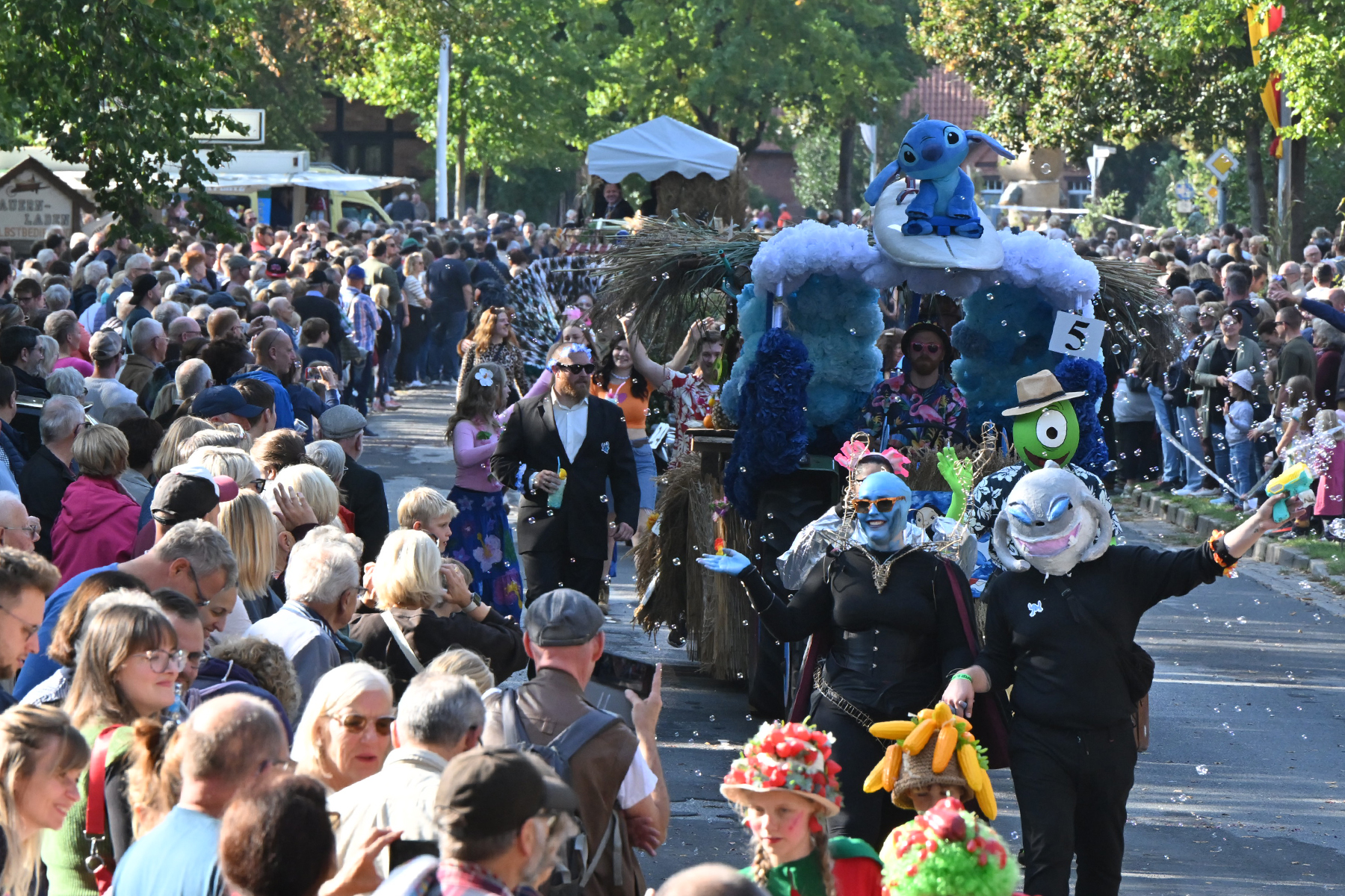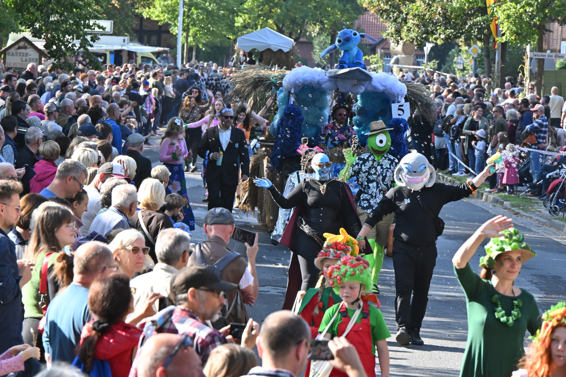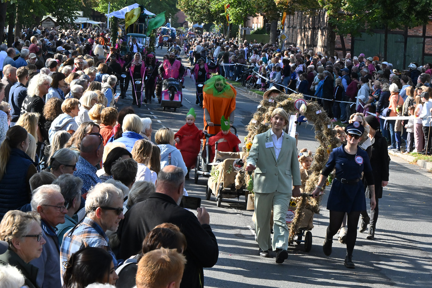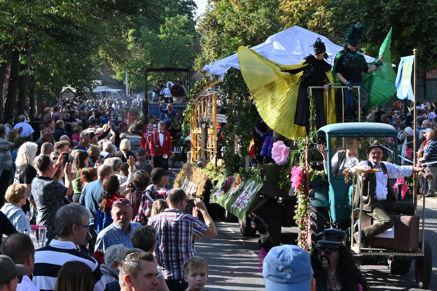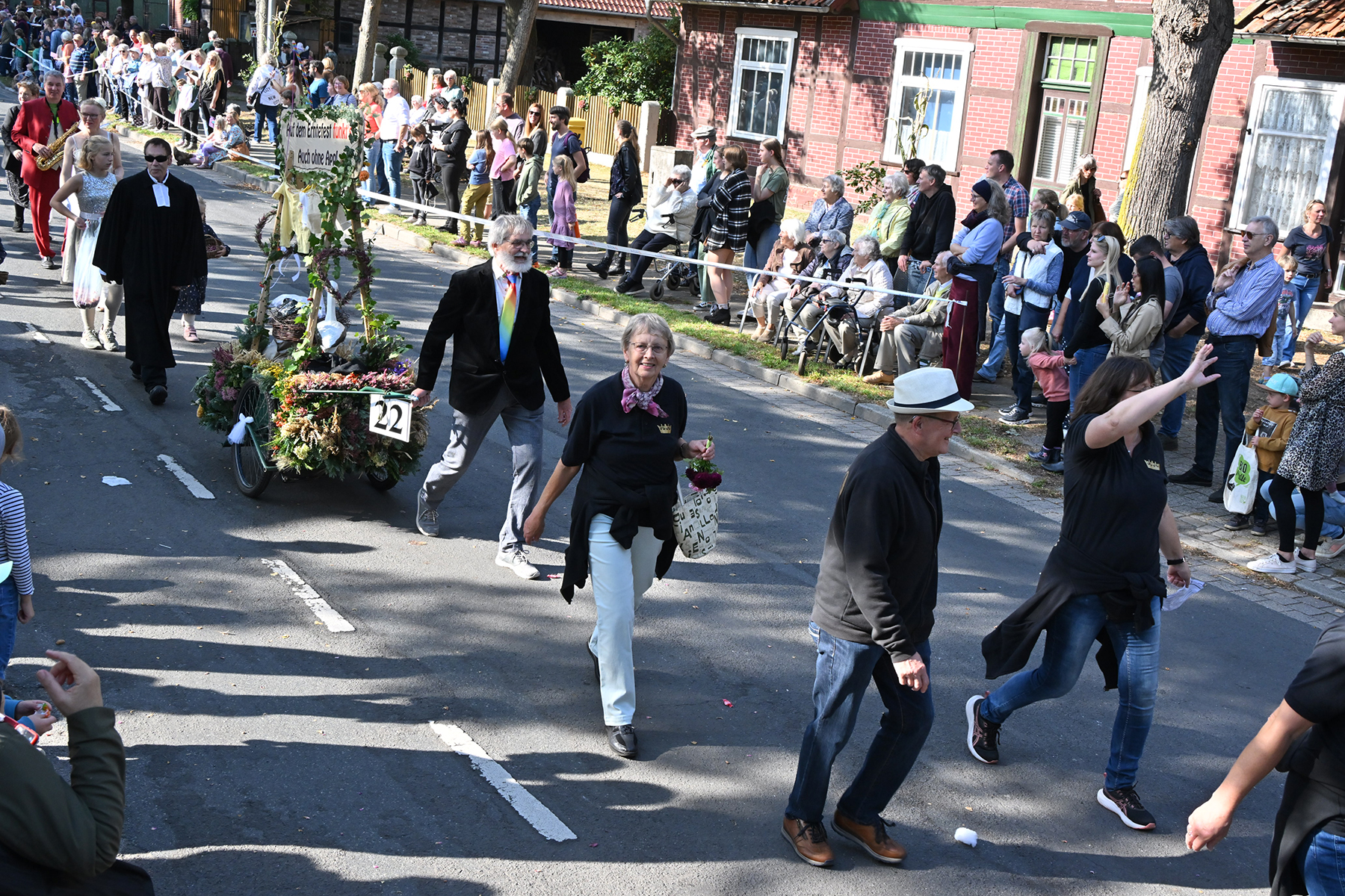Anschließend setzte sich der Festumzug, angeführt von der Erntekrone, getragen von Dominik Schlumbohm und begleitet von den sechs Kronengirls, auf die zweifache Runde durch den Ort. Die Zuschauer jubelten den Umzugsteilnehmern zu, und für die jüngsten Besucher sprang dabei auch die eine oder andere Süßigkeit heraus.
