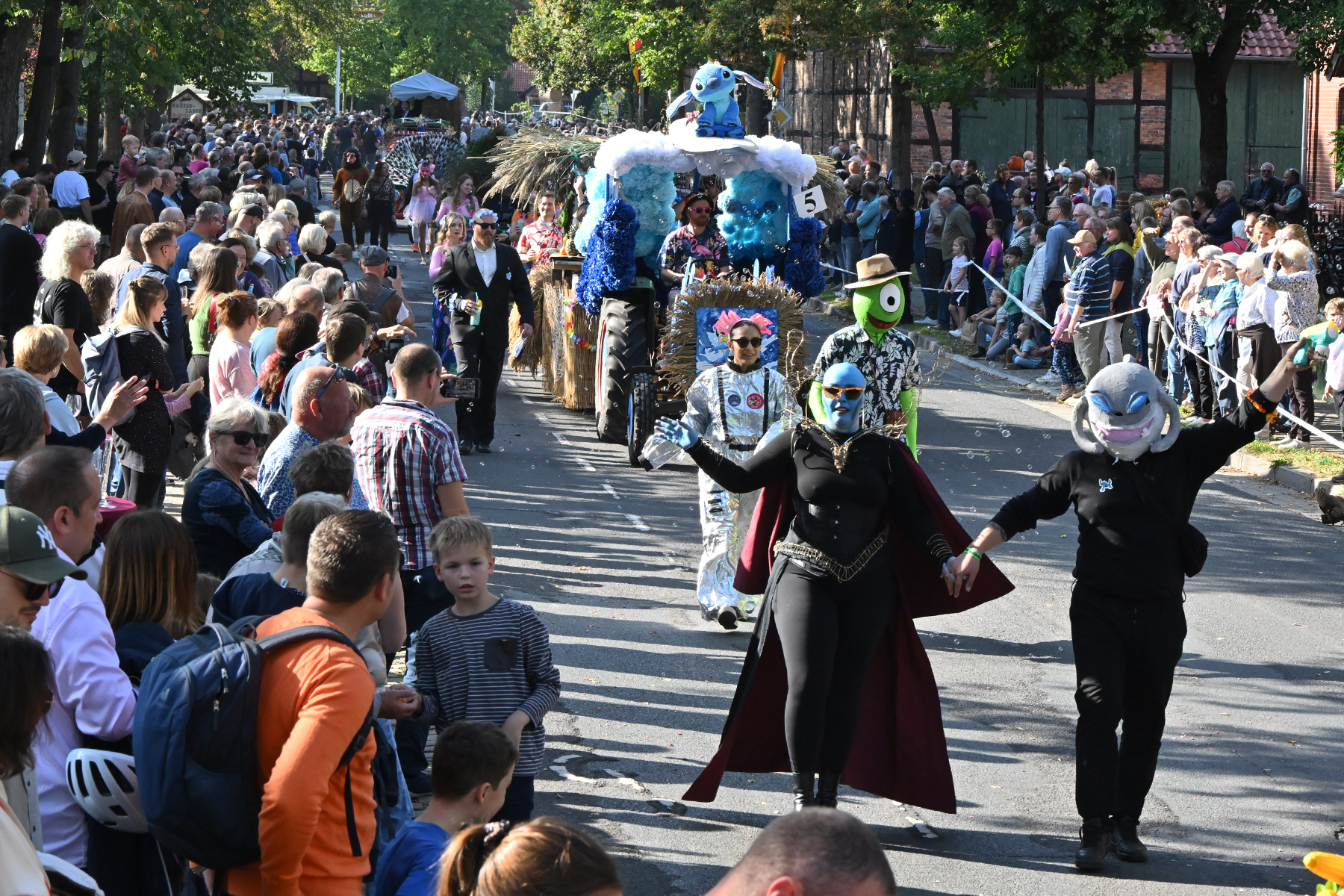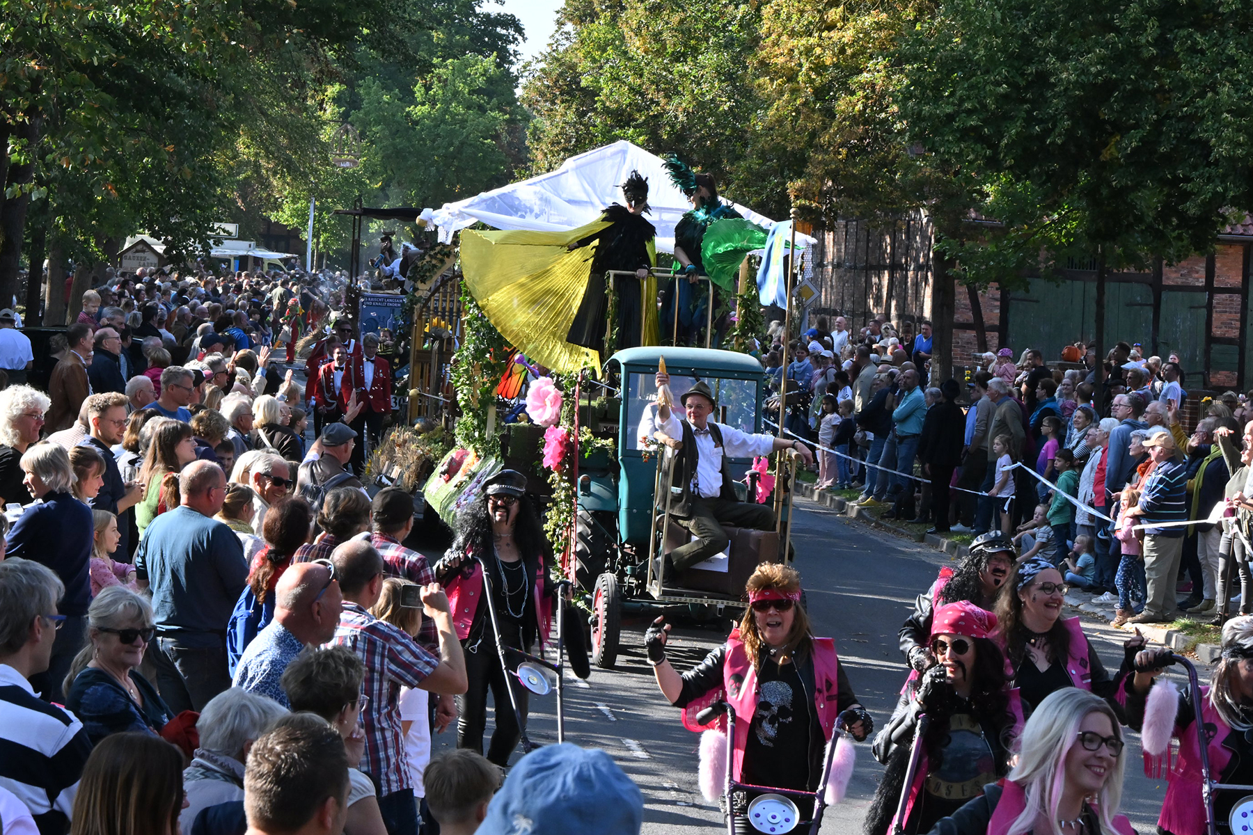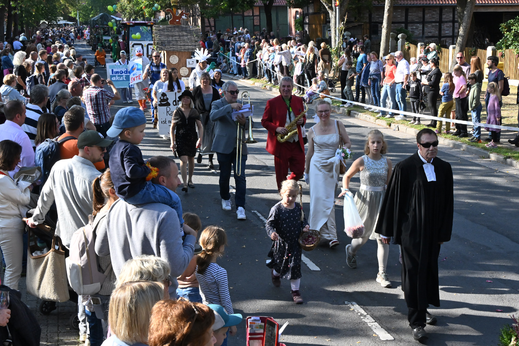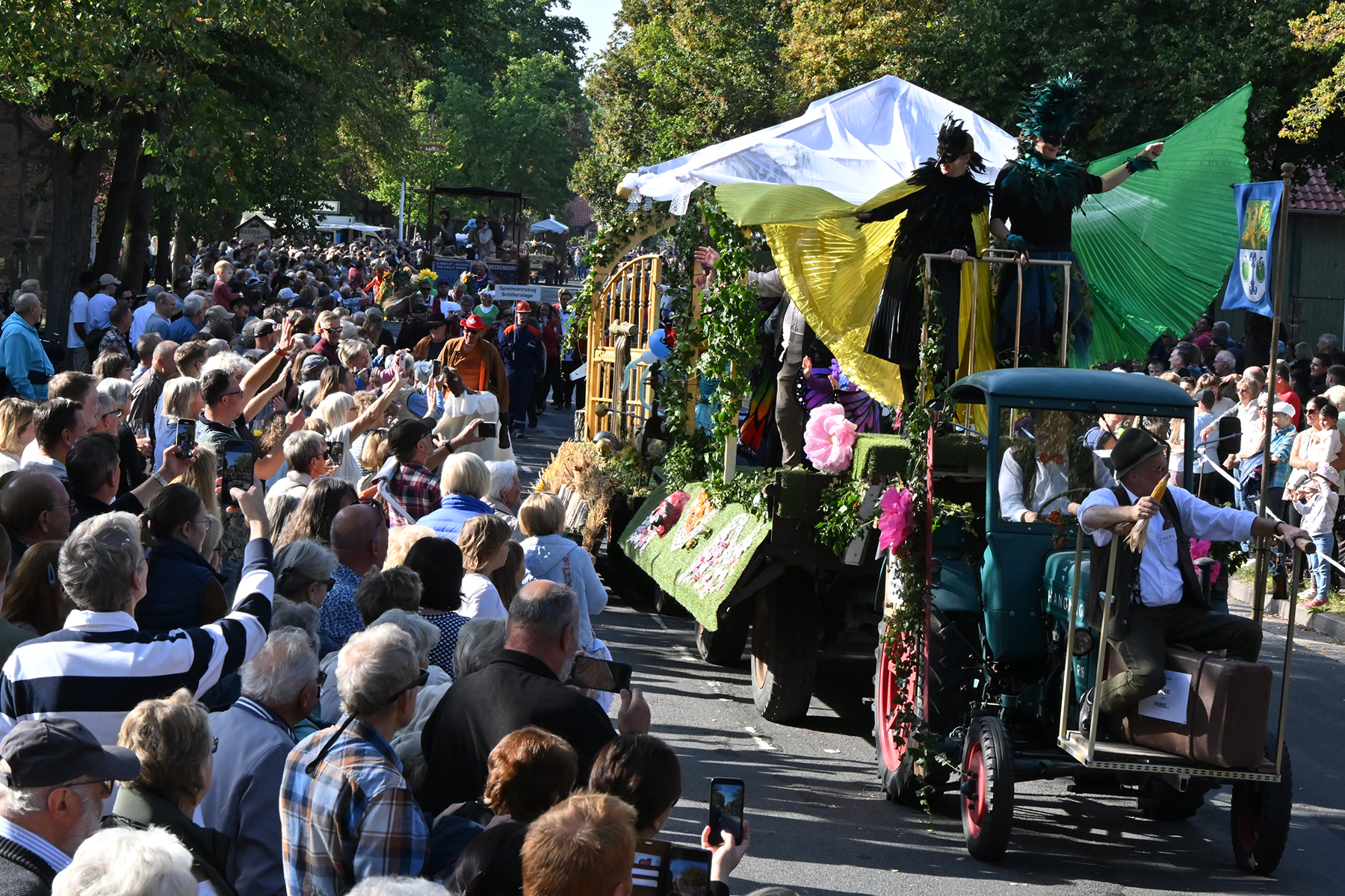 Anschließend setzte sich der Festumzug, angeführt von der Erntekrone, getragen von Dominik Schlumbohm und begleitet von den sechs Kronengirls, auf die zweifache Runde durch den Ort. Die Zuschauer jubelten den Umzugsteilnehmern zu, und für die jüngsten Besucher sprang dabei auch die eine oder andere Süßigkeit heraus.