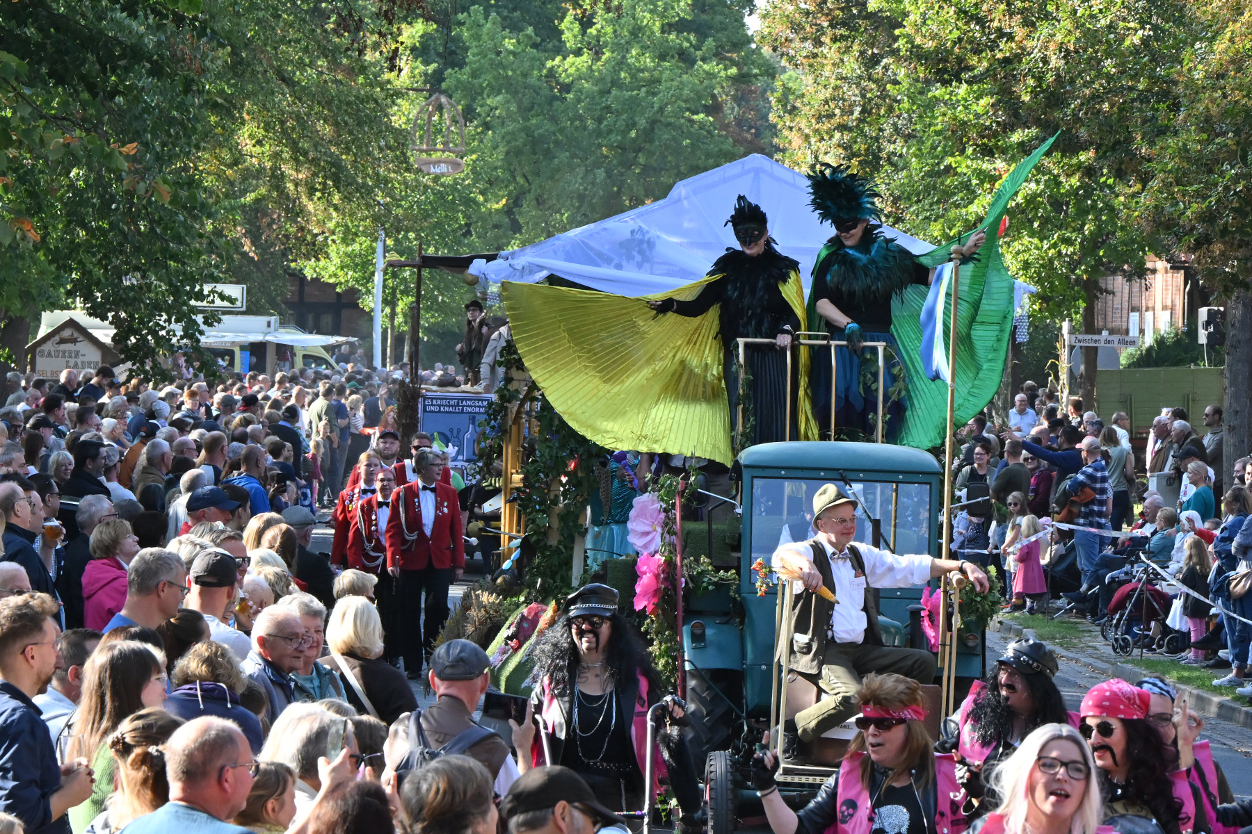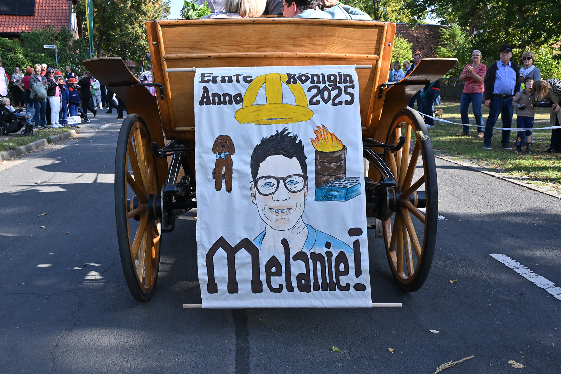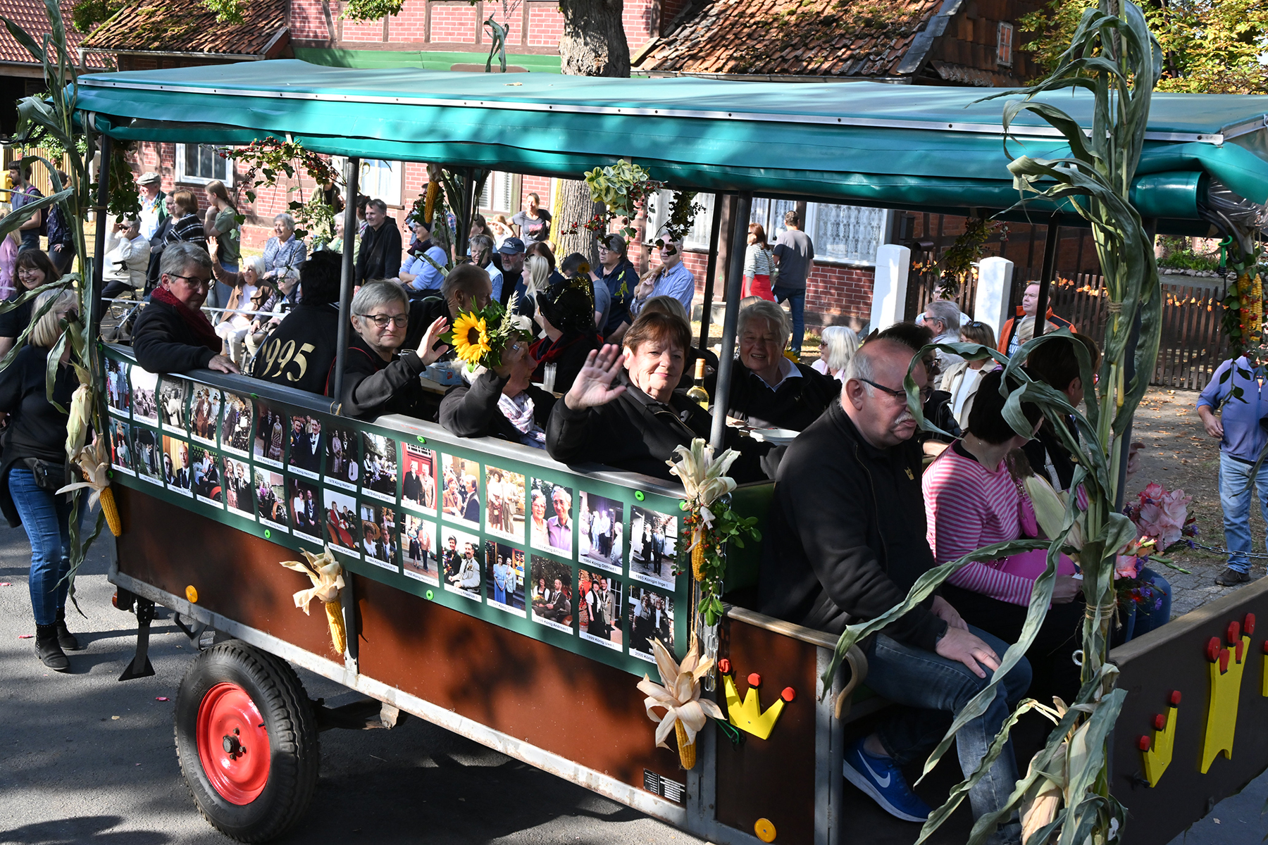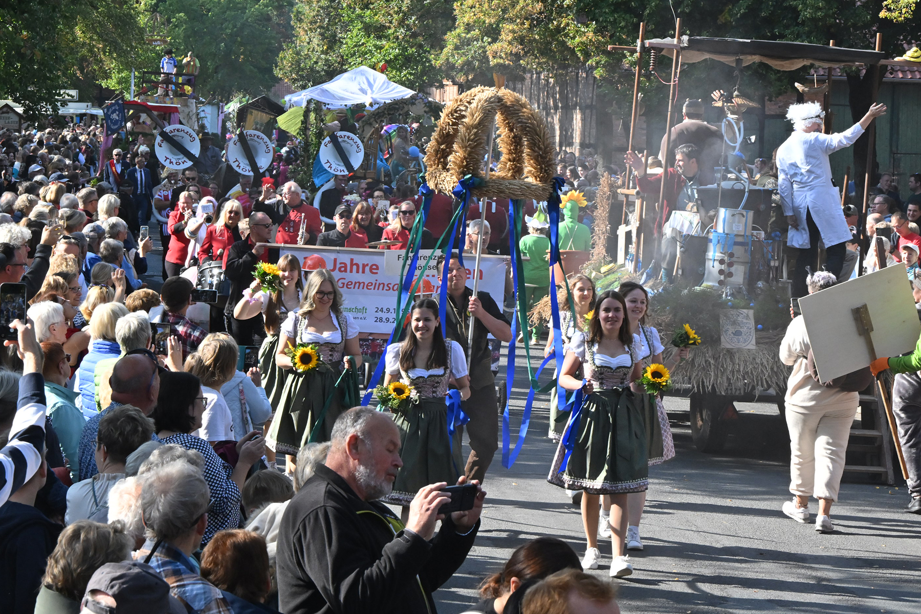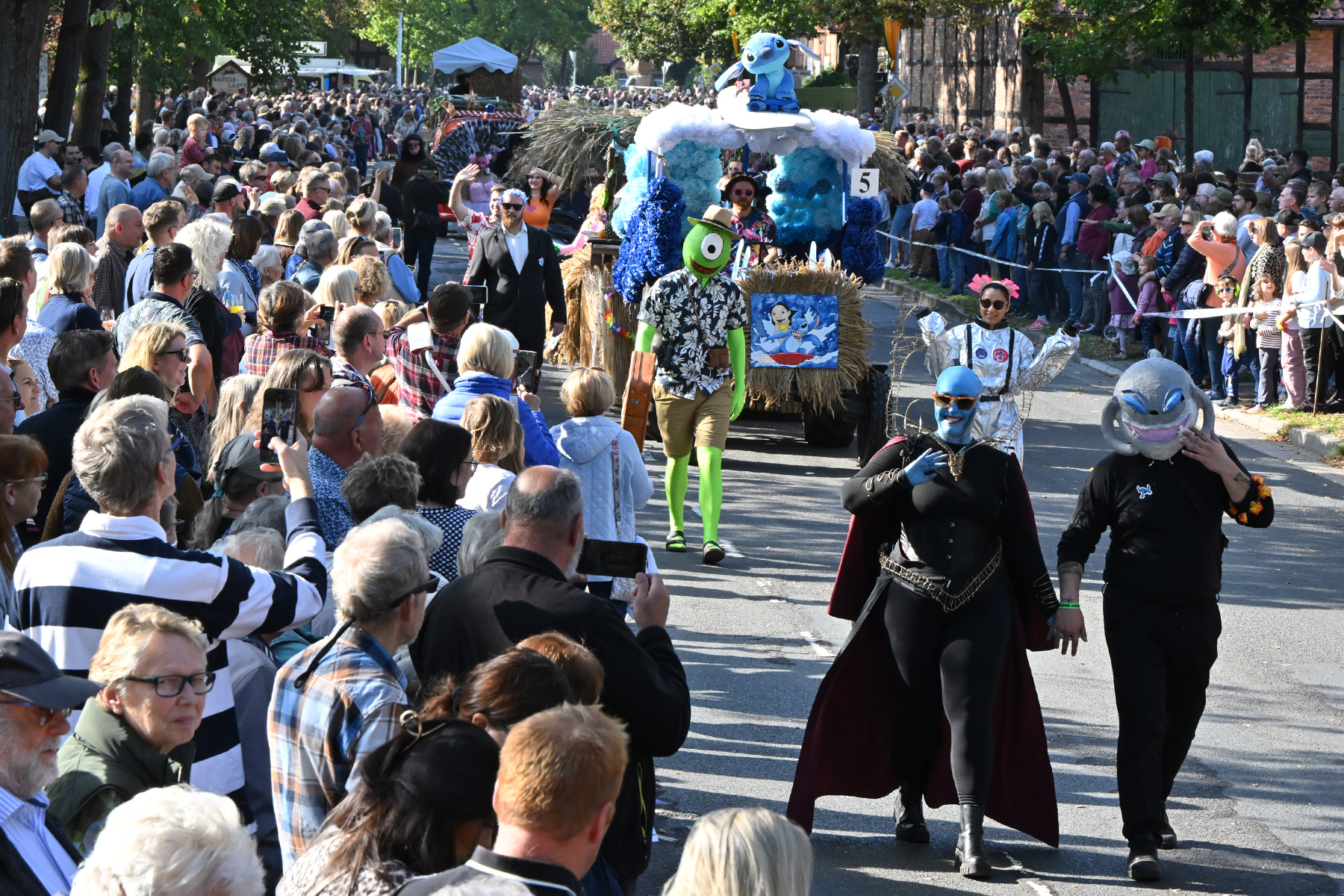 Anschließend setzte sich der Festumzug, angeführt von der Erntekrone, getragen von Dominik Schlumbohm und begleitet von den sechs Kronengirls, auf die zweifache Runde durch den Ort. Die Zuschauer jubelten den Umzugsteilnehmern zu, und für die jüngsten Besucher sprang dabei auch die eine oder andere Süßigkeit heraus.