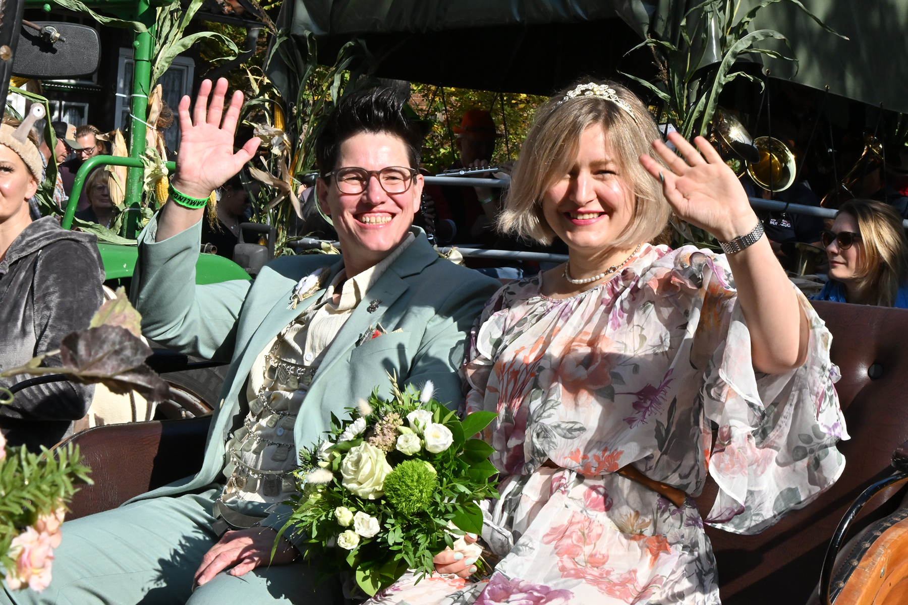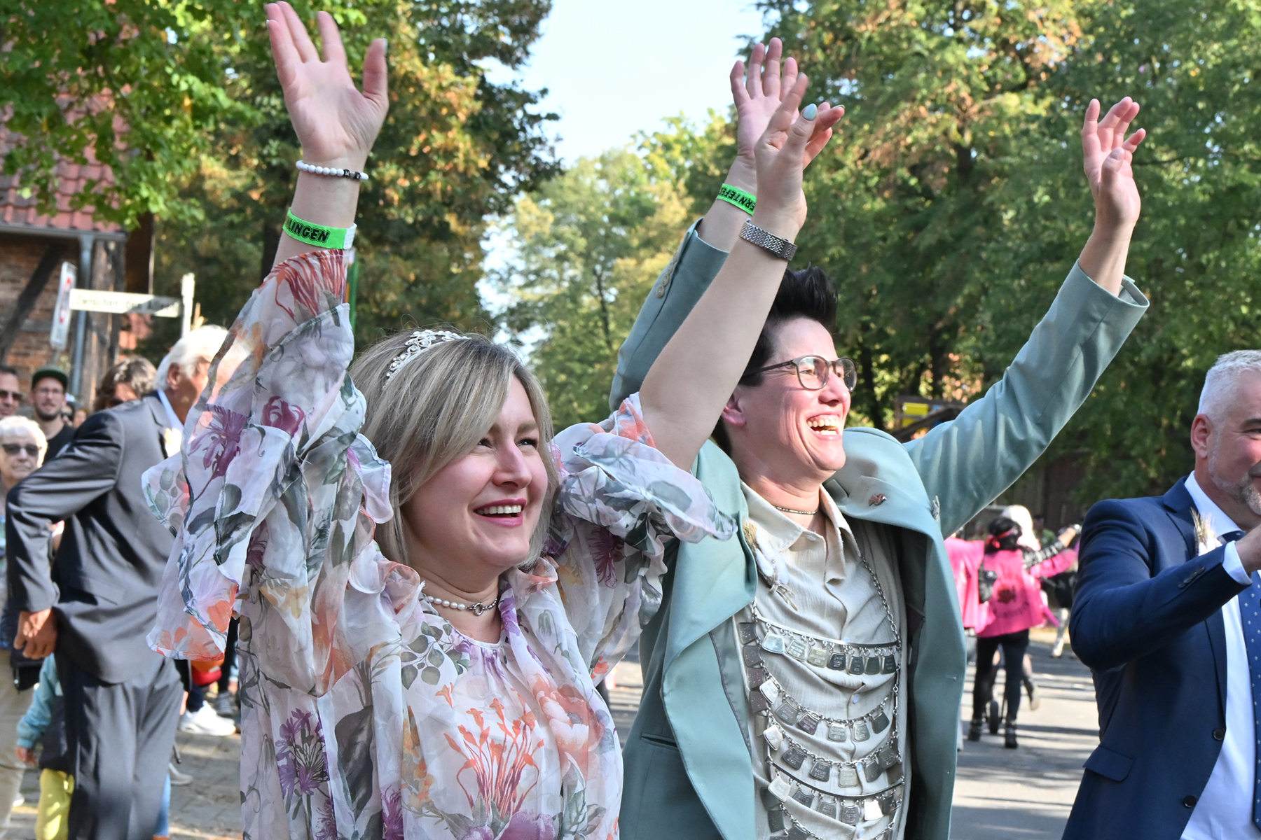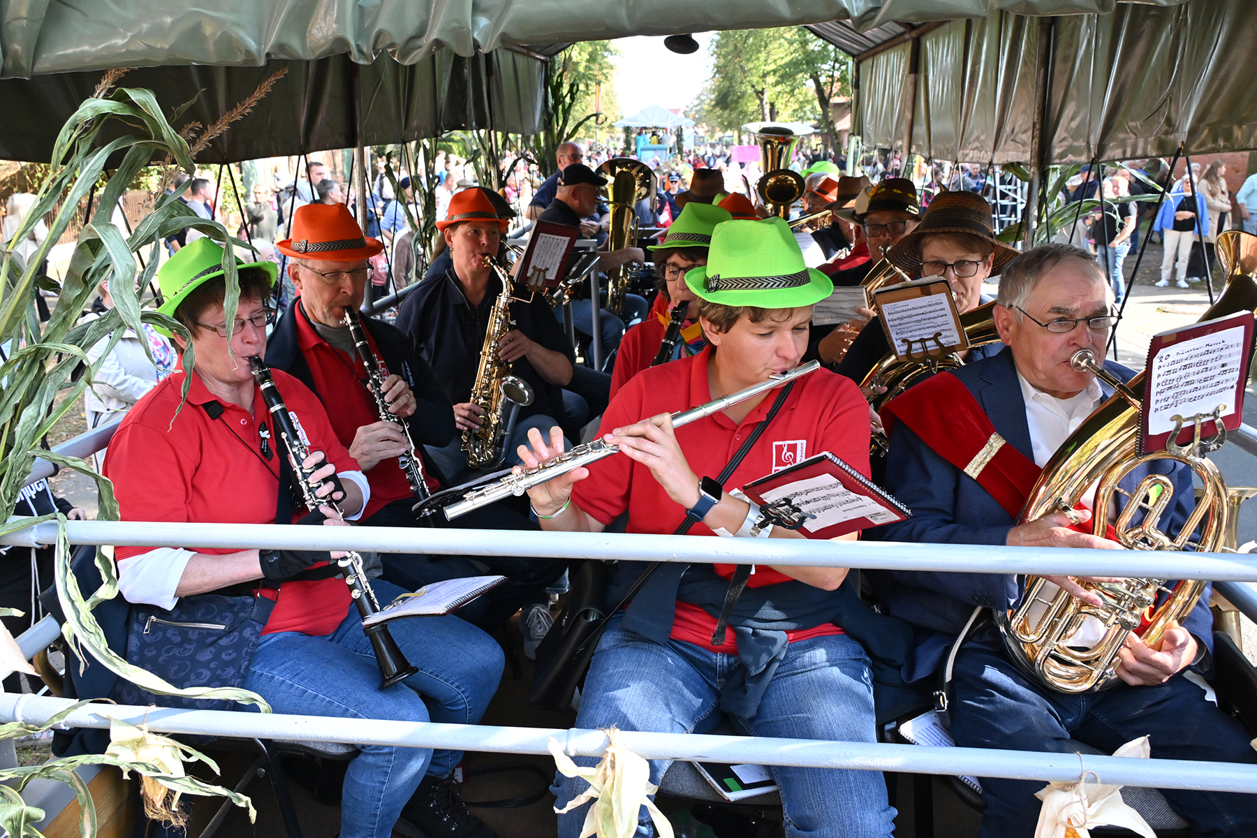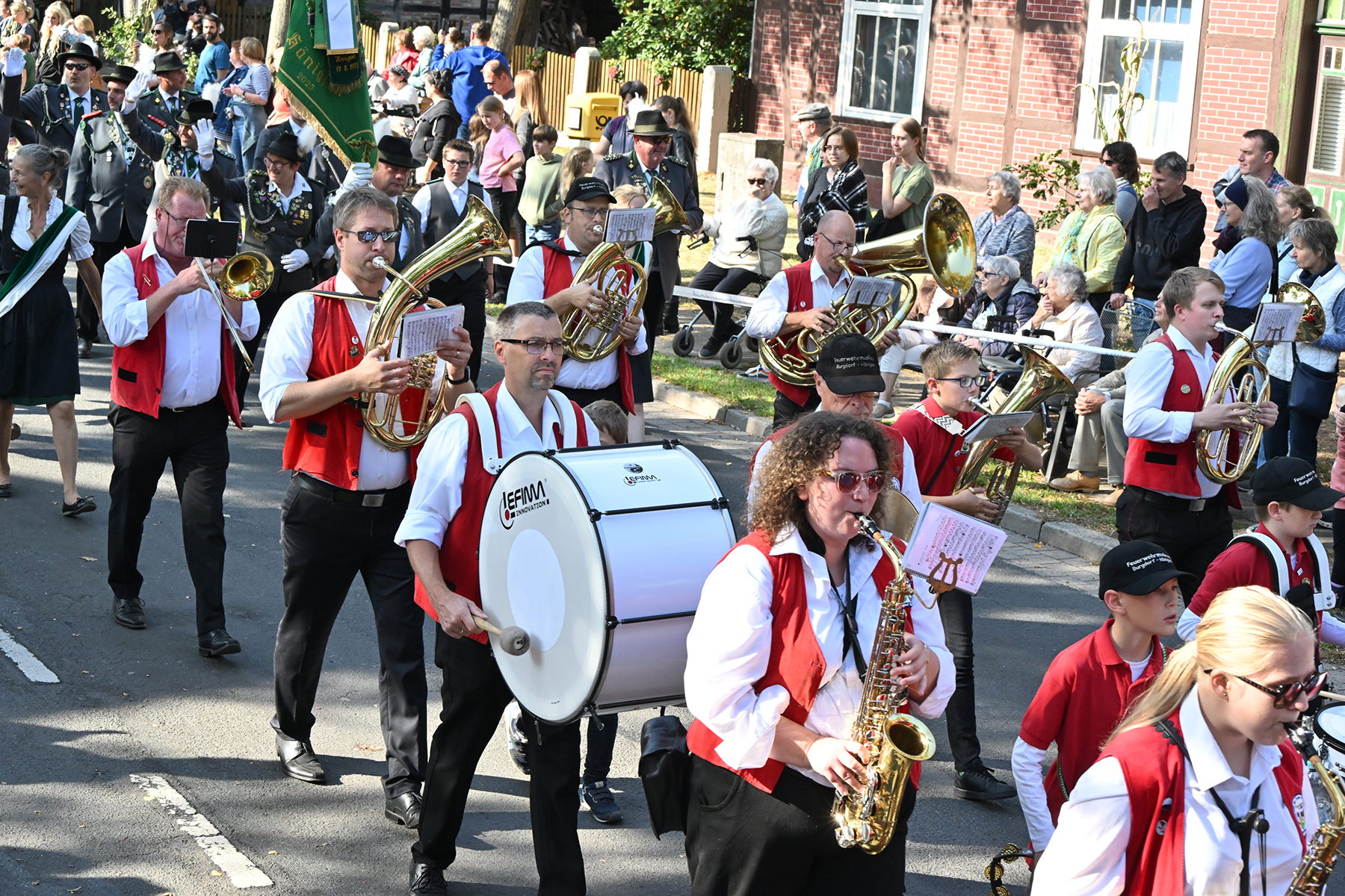 Anschließend setzte sich der Festumzug, angeführt von der Erntekrone, getragen von Dominik Schlumbohm und begleitet von den sechs Kronengirls, auf die zweifache Runde durch den Ort. Die Zuschauer jubelten den Umzugsteilnehmern zu, und für die jüngsten Besucher sprang dabei auch die eine oder andere Süßigkeit heraus.