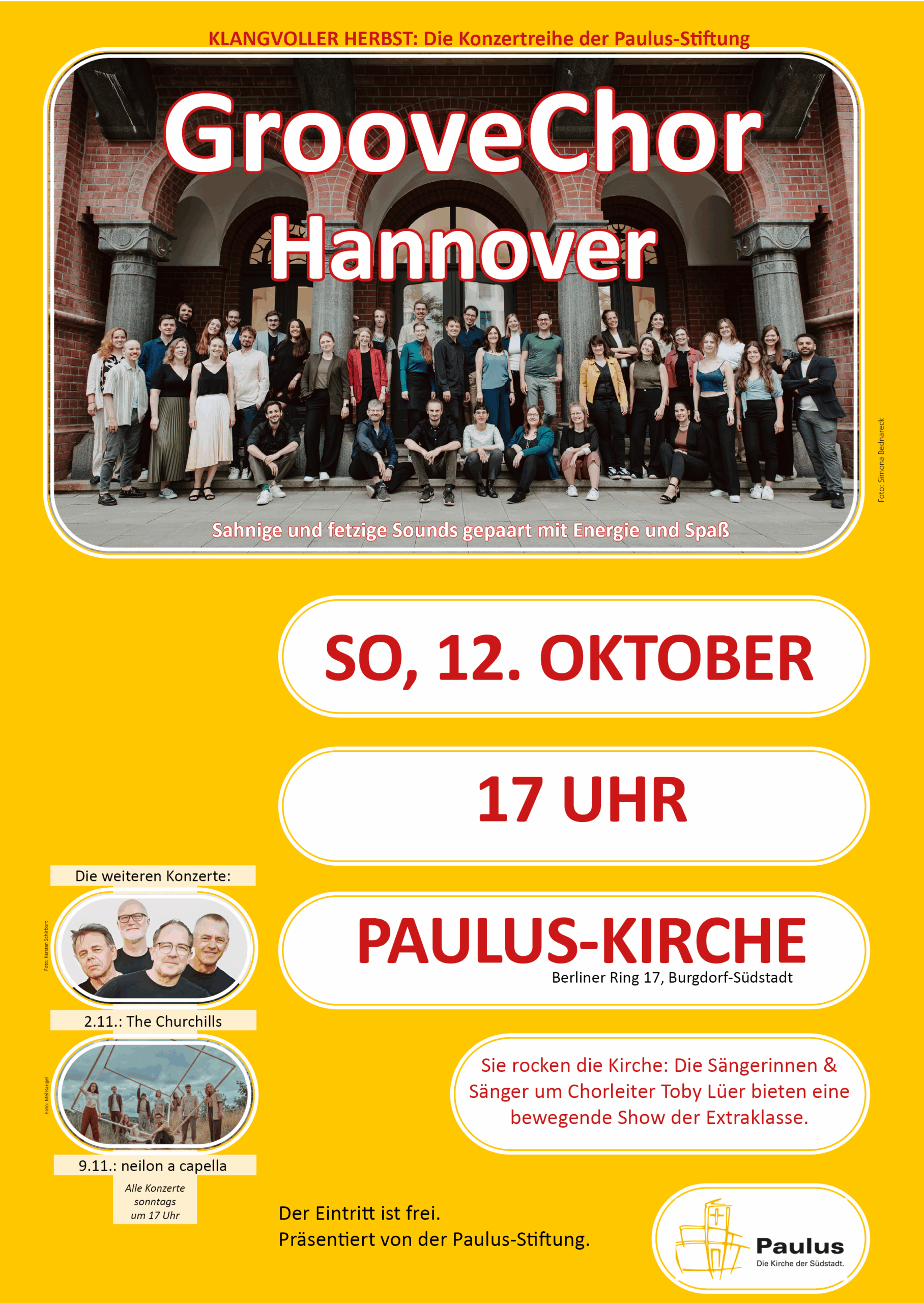 Der klangvolle Herbst im Paulus-Kirchenzentrum in der Südstadt geht weiter. Bereits zum zweiten Mal tritt der GrooveChor Hannover am Sonntag, 12. Oktober, ab 17 Uhr in die Paulus-Kirche, Berliner Ring 17, innerhalb der Reihe auf.