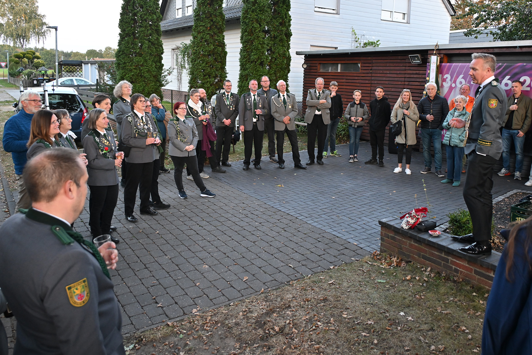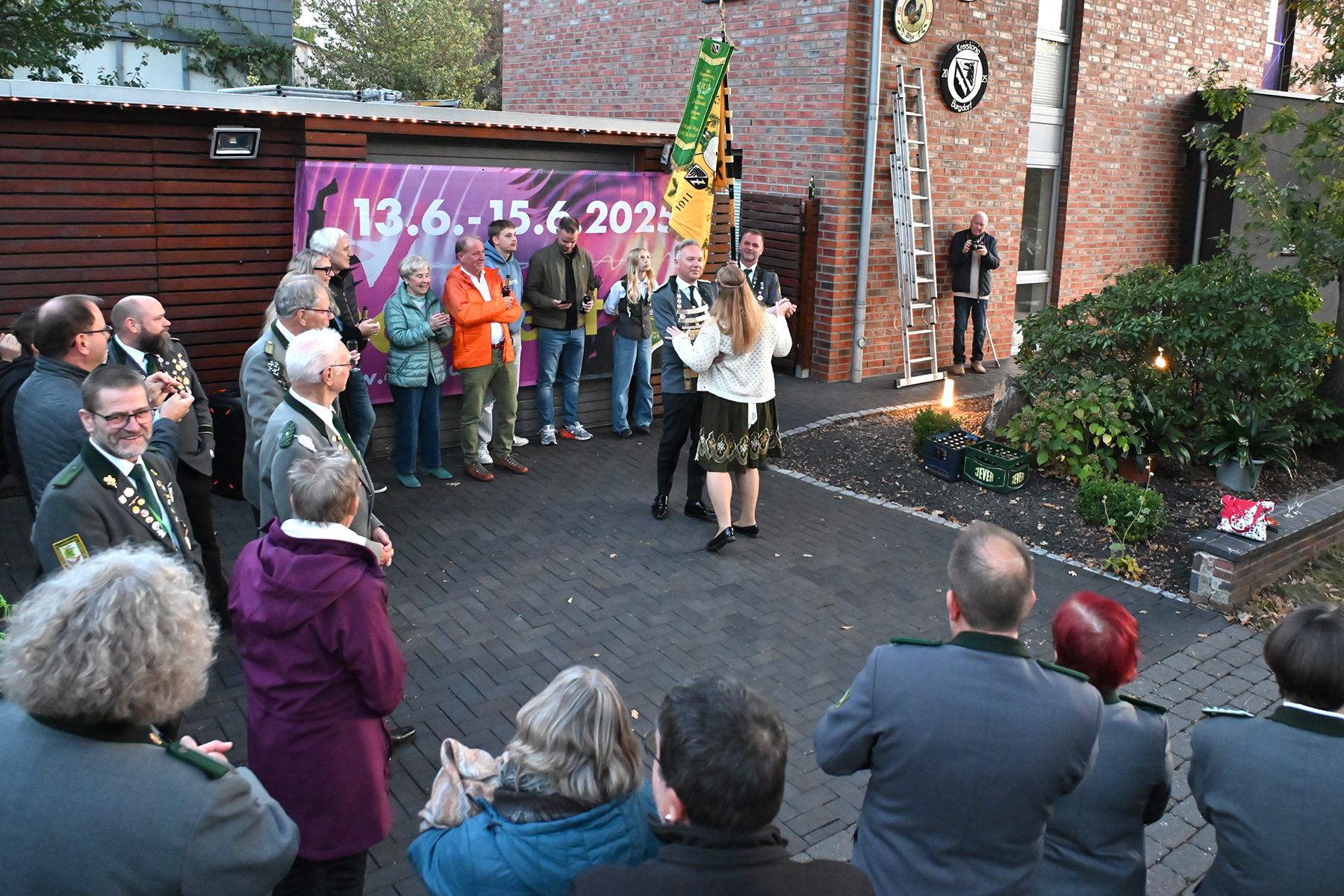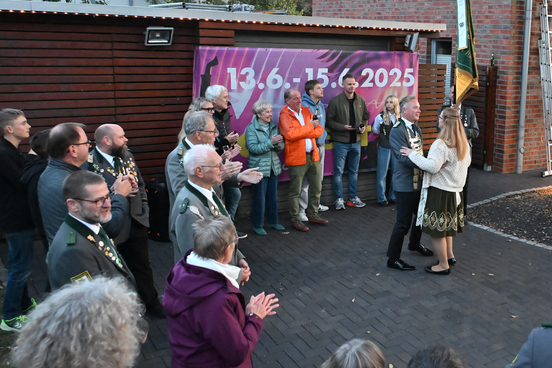 Anschließend wurde unter den Klängen des Präsentiermarsches die Königsscheibe durch Andreas Betram an ihre Position gebracht und eingeweiht. Nach dem Königstanz schloss sich eine gesellige Runde im Garten der Familie Heuer an.
