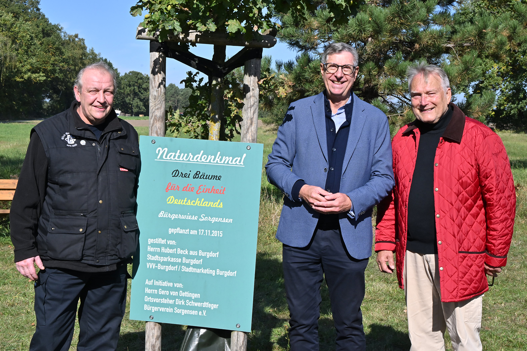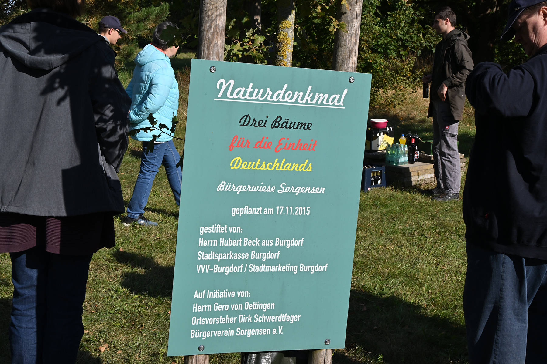 „Es gibt heute zwei Jubiläen zu feiern: Das 10. Mal hier am Naturdenkmal auf der Bürgerwiese und den 35. Tag der Deutschen Einheit“, sagte Gero von Oettingen, der vor zehn Jahren die Schaffung des Naturdenkmals mit initiiert hatte. Dieses besteht aus drei Bäumen: Die Kiefer symbolisiert die DDR, die Buche die frühere BRD und die Eiche das wiedervereinte Deutschland. „Ich freue mich, dass es so gut angenommen wird“, betonte von Oettingen.