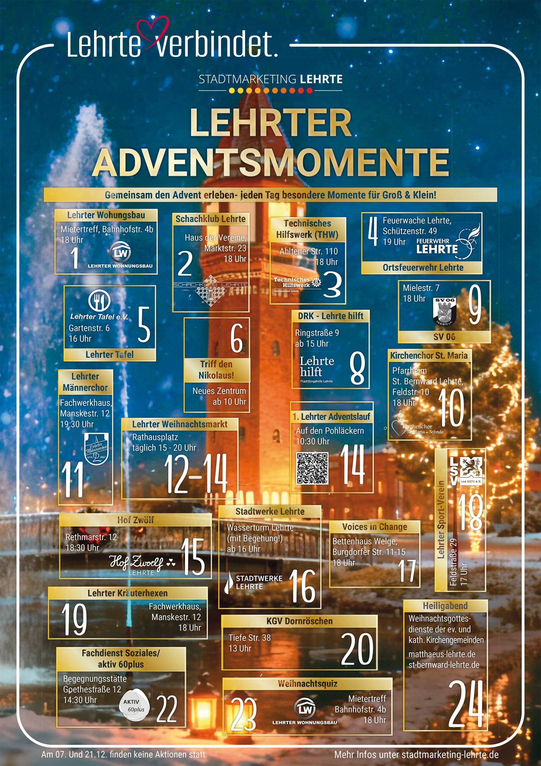 Im Dezember laden die Lehrter Adventsmomente erstmals dazu ein, die Vorweihnachtszeit in gemeinsamer Atmosphäre zu erleben. Unter der Organisation des Stadtmarketings öffnen sich vom 1. bis 24. Dezember an verschiedenen Orten in Lehrte täglich kleine „Türchen“ – angelehnt an einen Adventskalender.