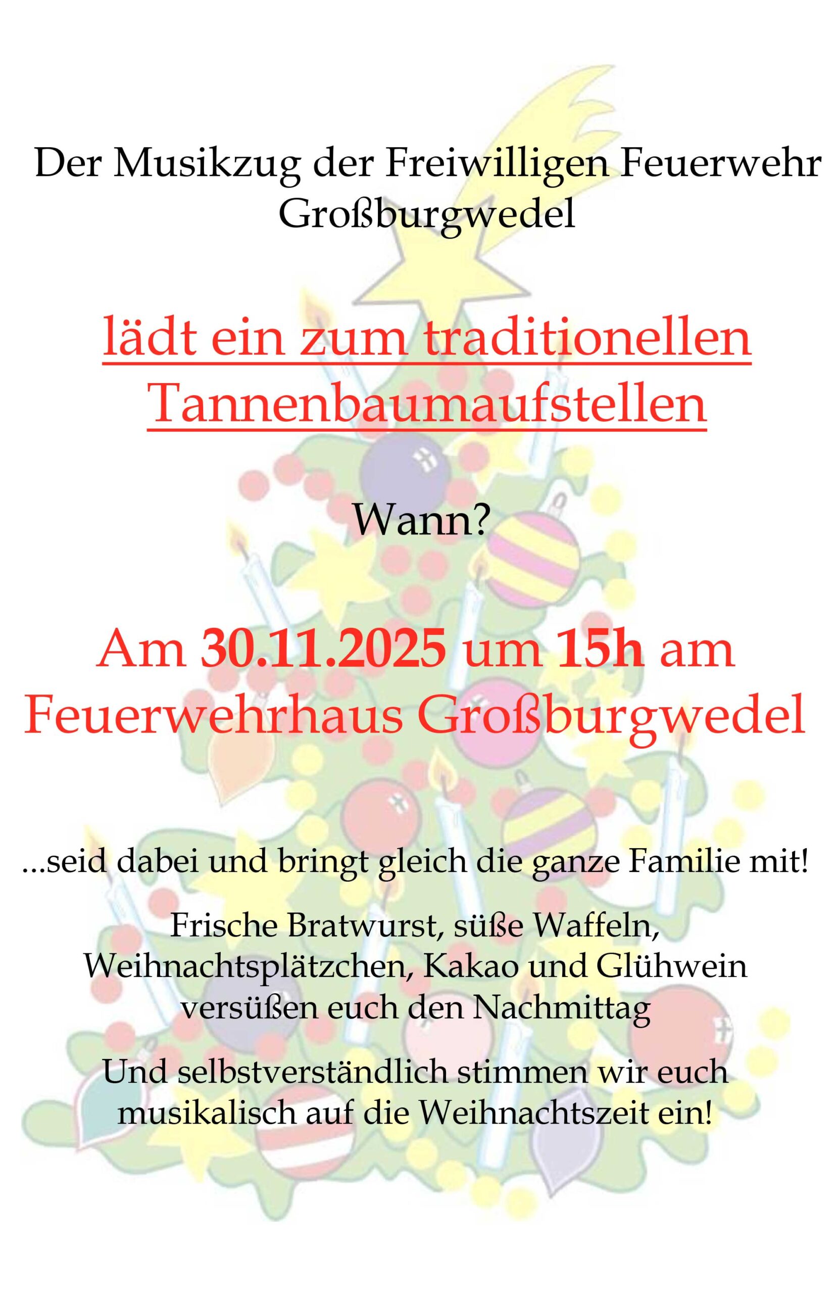 Am Sonntag, 30. November, lädt der Musikzug der Freiwilligen Feuerwehr Großburgwedel zum traditionellen Tannenbaumaufstellen ein. Vor dem Feuerwehrhaus am Mühlenbruchdamm 1 wird ab 15 Uhr der festlich geschmückte Baum erleuchtet, der anschließend täglich für Großburgwedel strahlen soll.