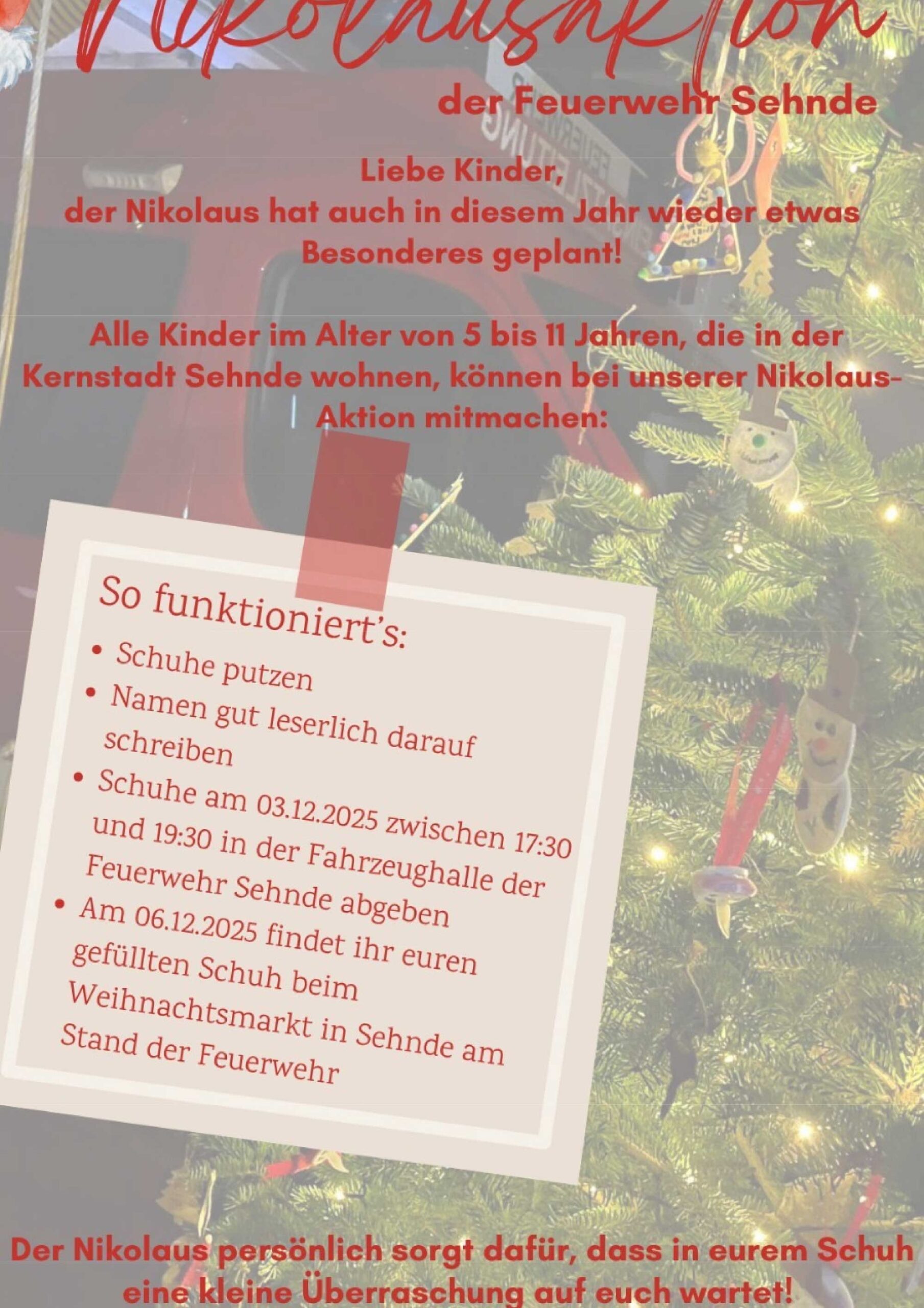 Auch in diesem Jahr kommt der Nikolaus wieder zur Sehnder Feuerwehr. Damit der Nikolaus sich vorbereiten kann, geben die Kinder im Alter von 5 bis 11 Jahren aus dem Ortsteil Sehnde, die ein kleines Präsent vom Nikolaus bekommen möchten, ihren Stiefel (bitte mit Namen, Adresse und Alter versehen) im Feuerwehrhaus Sehnde, Borsigring 17A, am Mittwoch, 3. Dezember 2025, in der Zeit von 17.30 bis 19.30 Uhr ab.